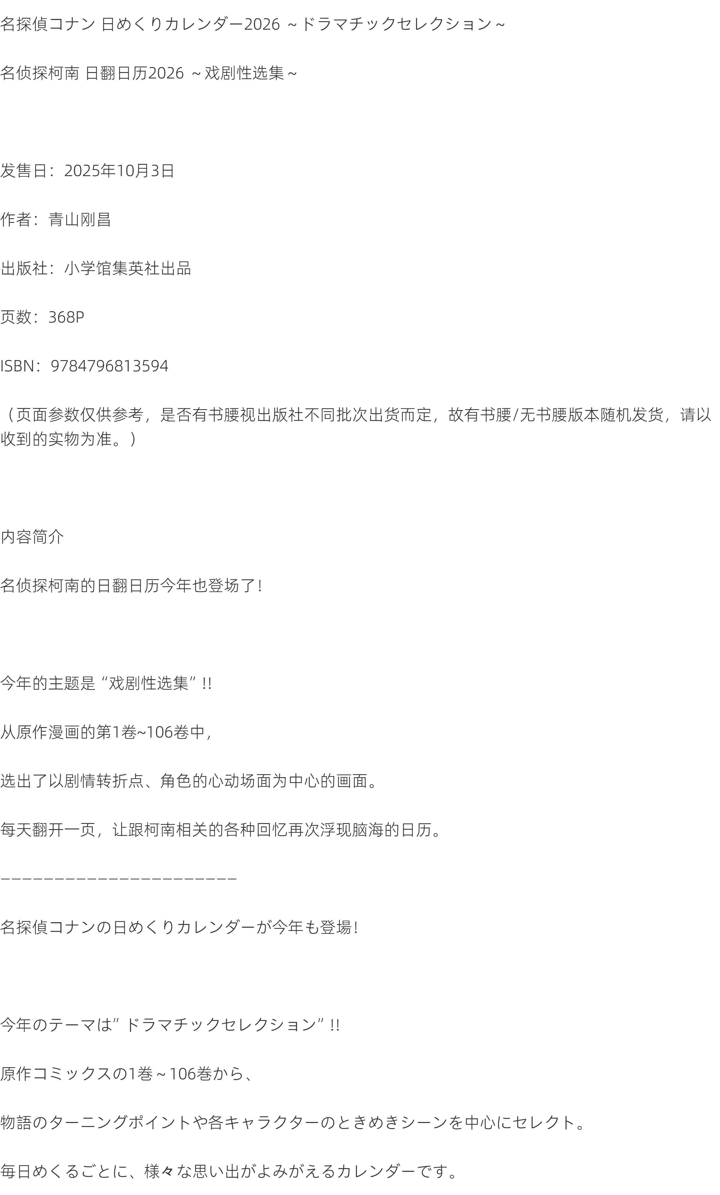 In Stock [Original Japanese Edition] Detective Conan 2026 Daily Calendar Dramatic Collection by Gosho Aoyama, Shuichi Kudo, Ran Mouri, Ai Haibara, Kid, Shogakukan, Famous Detective Conan