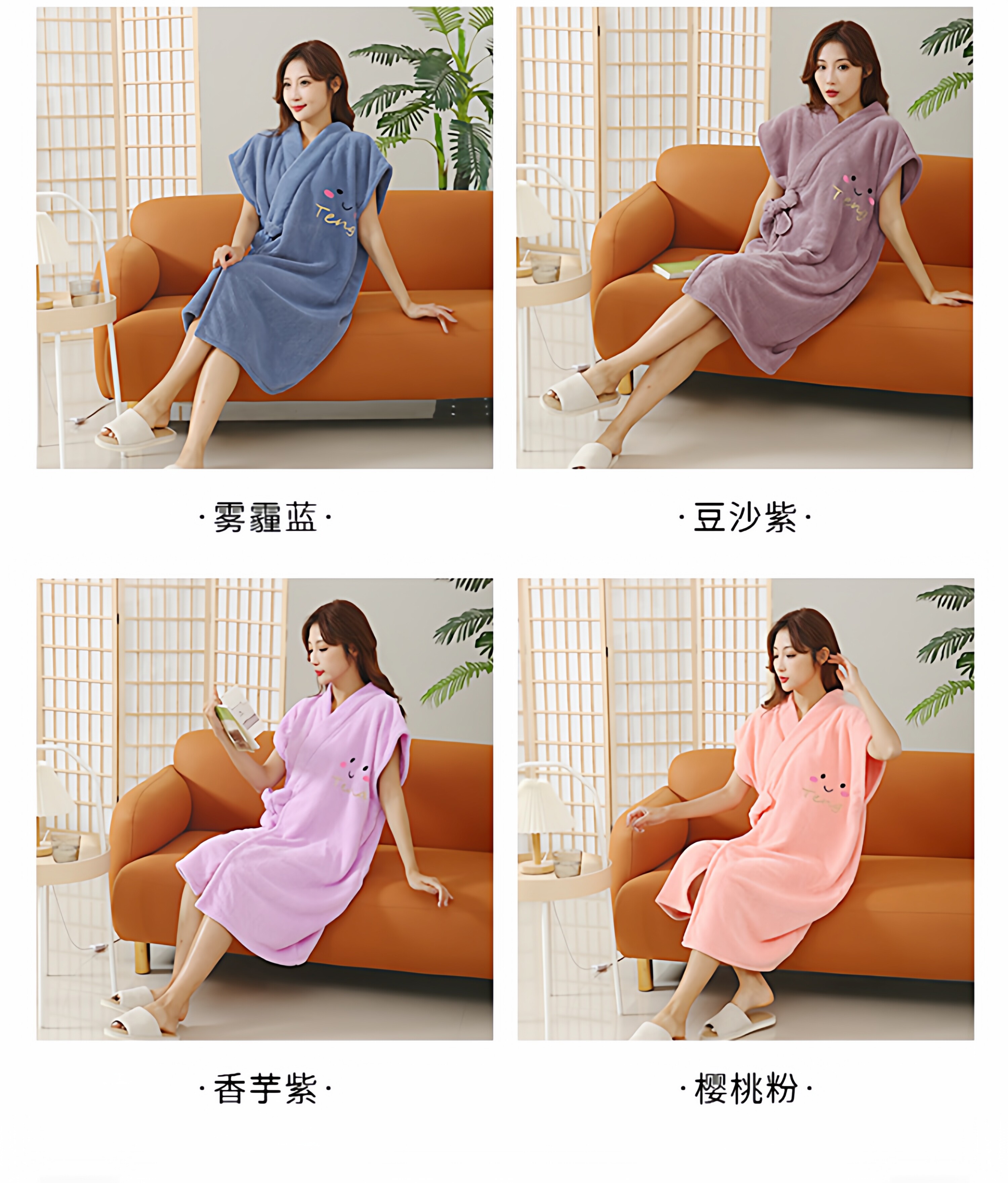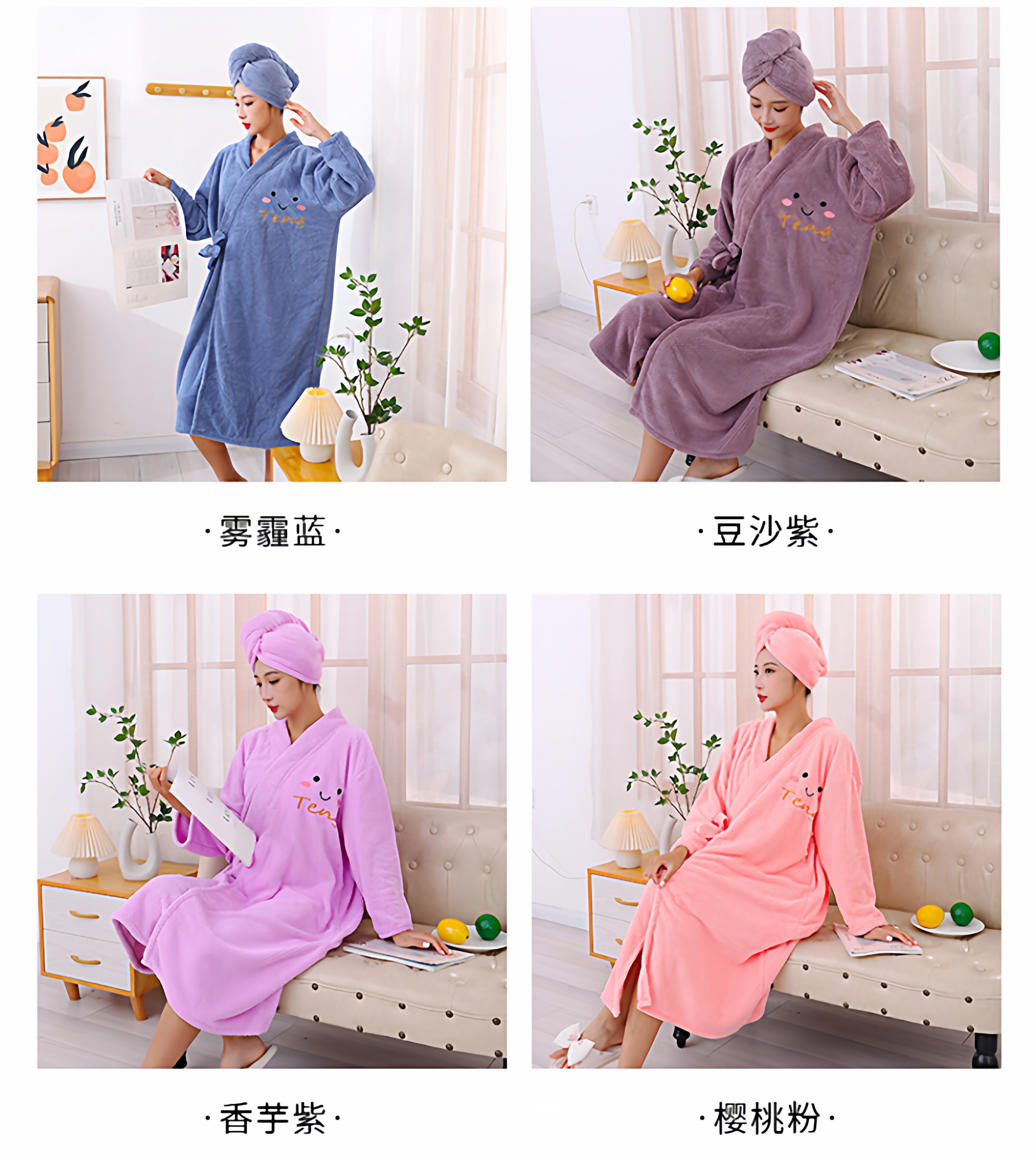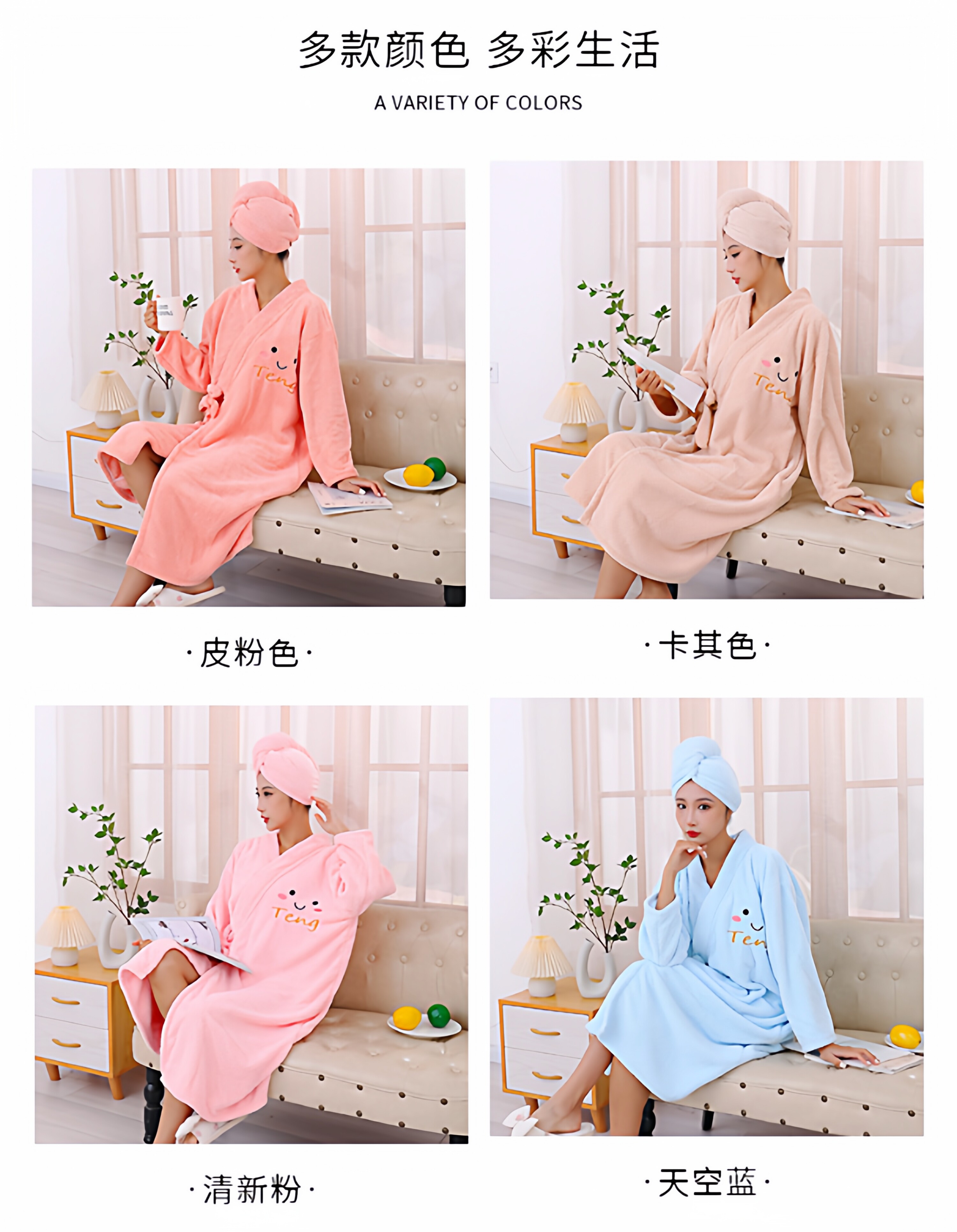 Color Classification Short Sleeve Dark Blue Bathrobe,Short Sleeve Light Blue Bathrobe,Short Sleeve Pink Bathrobe,Short-Sleeved Off-White Bathrobe,Short Sleeve Camel Bathrobe,Short Sleeve Purple Bathrobe,Blue Long Sleeve Bathrobe,Purple Long-Sleeved Bathrobe,Camel Long Sleeve Bathrobe,Leather Pink Long-Sleeved Bathrobe,Off-White Long-Sleeved Bathrobe
