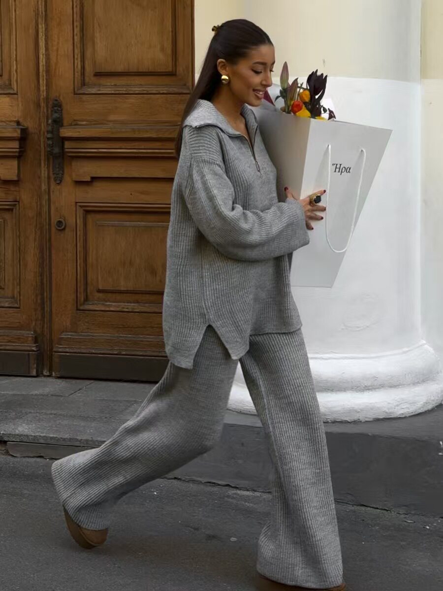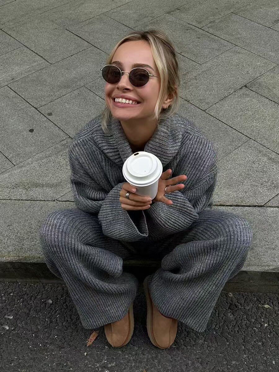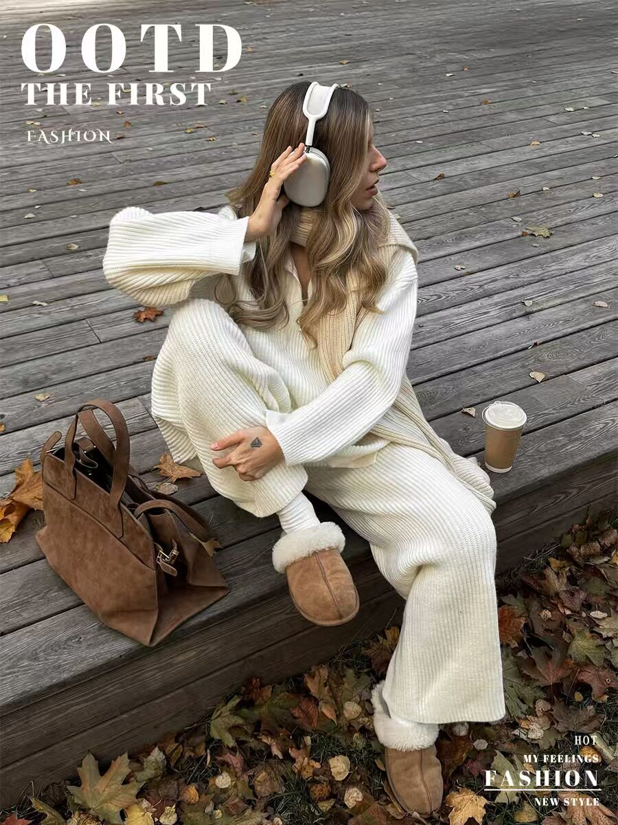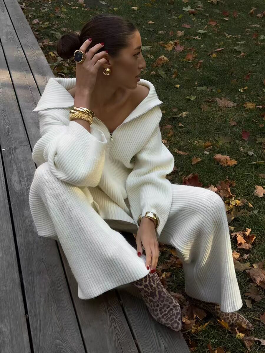 European and American Style New Half-Zip Knitted Lapel Sweater Wide-Leg Pants Set Sweater and Pants Set