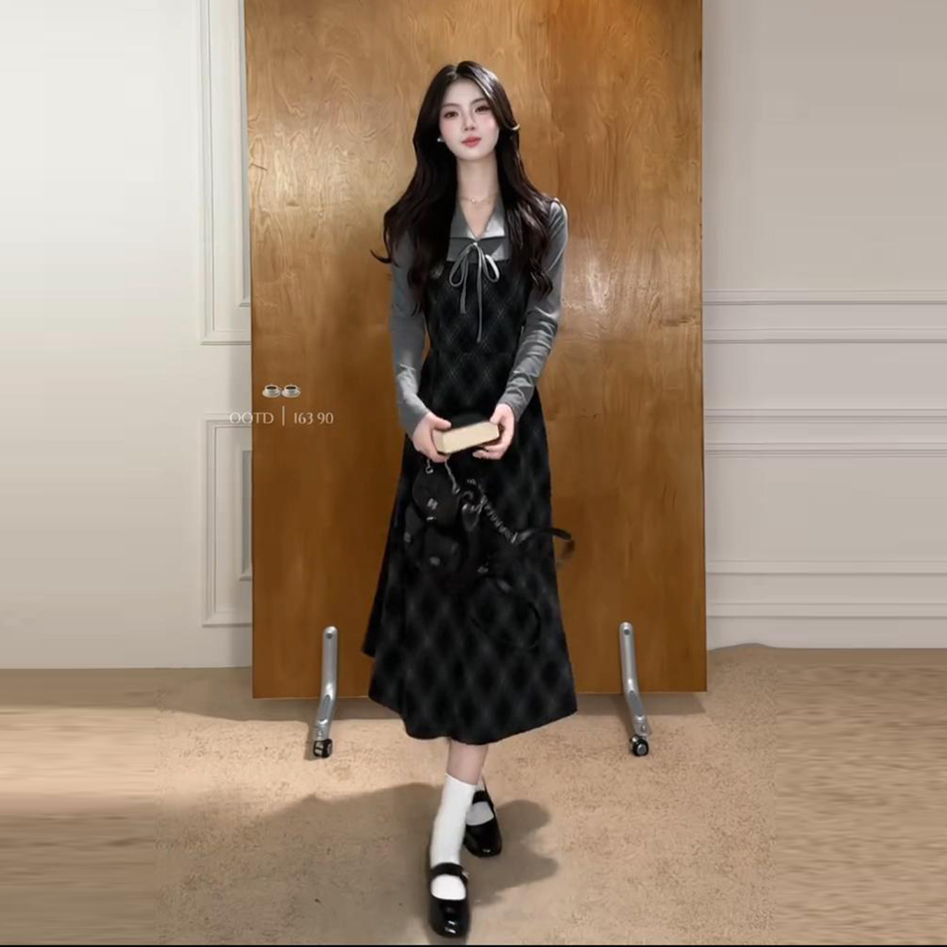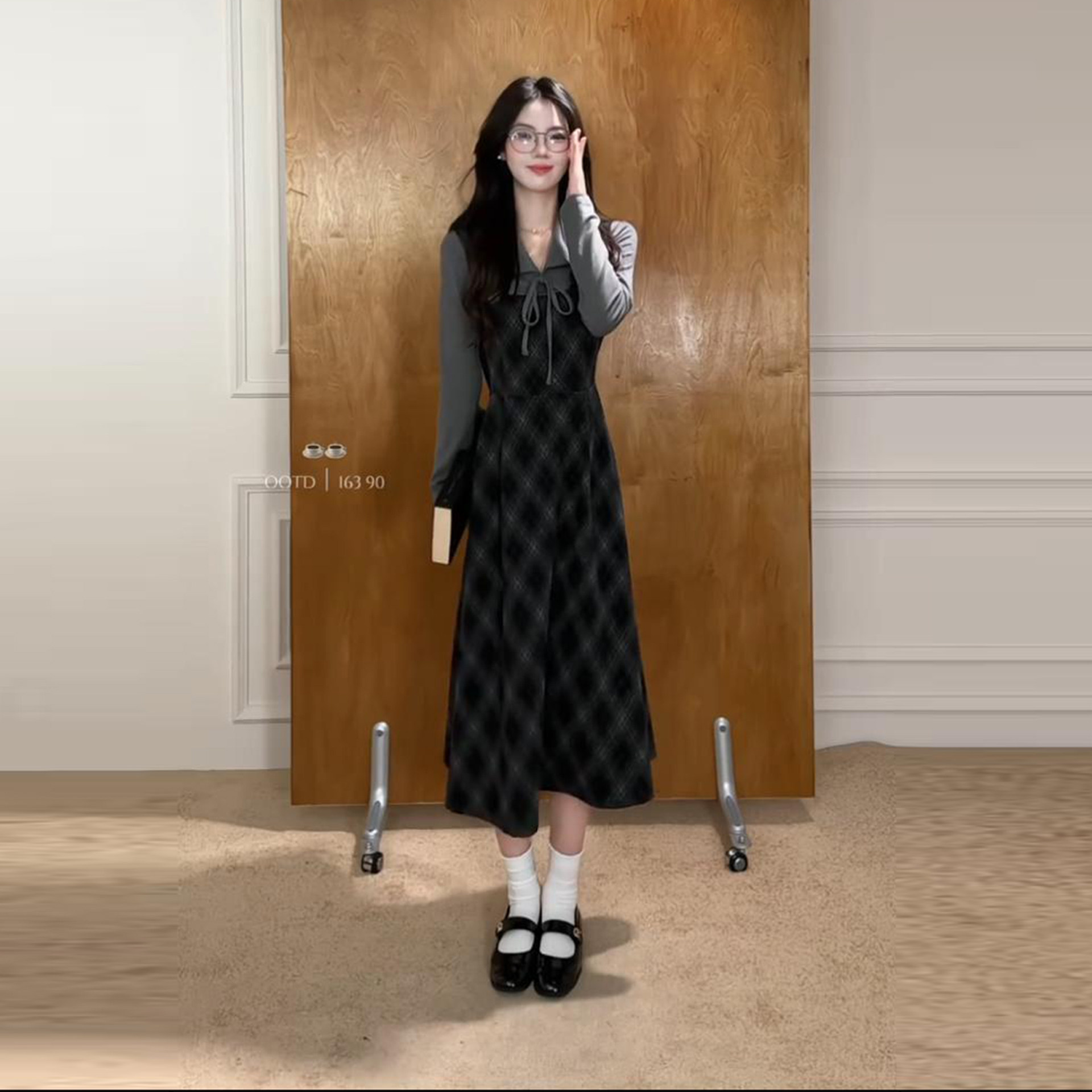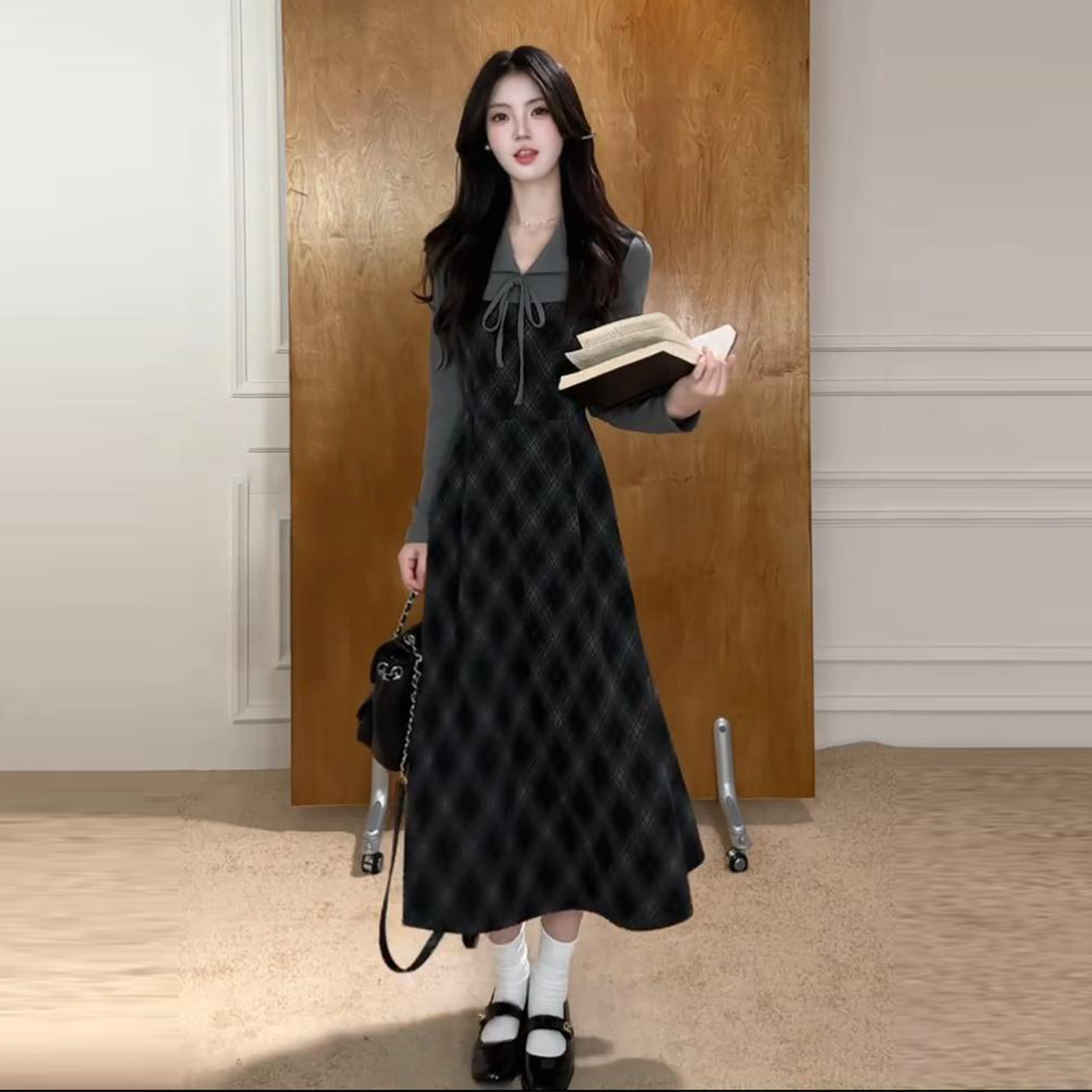Plus-Size Retro Plaid Two-Piece Dress for Women, Autumn and Winter, Slimming for Chubby Girls, Niche Waist-Cinching, Preppy Style Dress