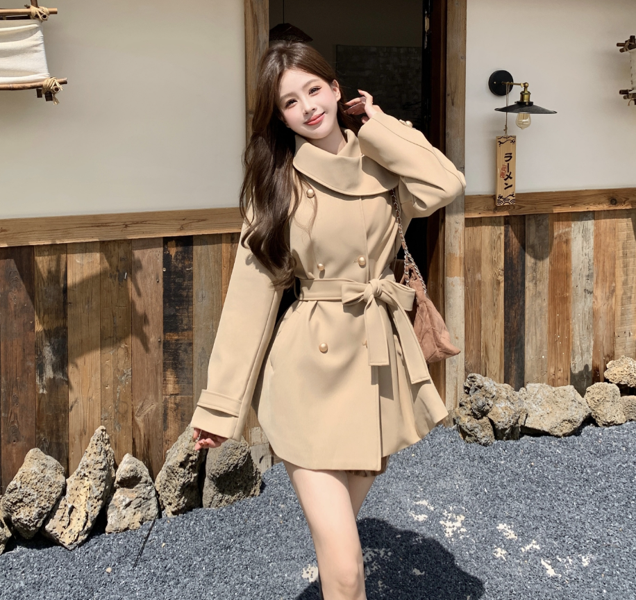 Plus-Size Hepburn-Style Trench Coat for Women, Autumn and Winter, Versatile, Slimming, Waist-Cinching, Short, High-End Top
