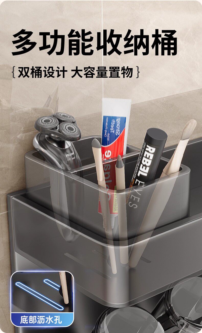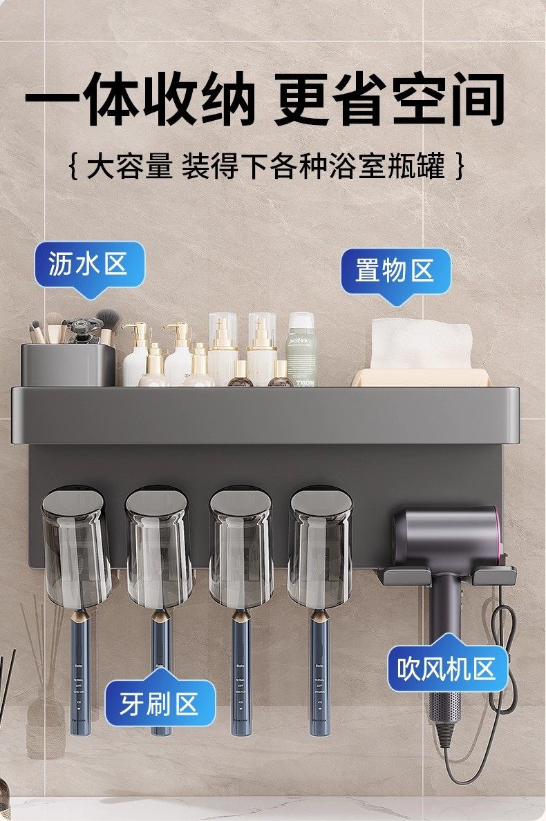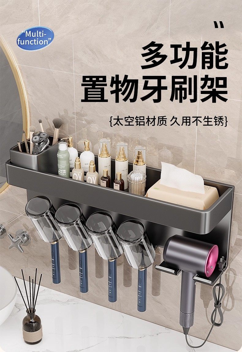 German Precision Toothbrush Holder Bathroom Multifunctional No-Drill Wall-Mounted Mouthwash Cup Hair Dryer Rack