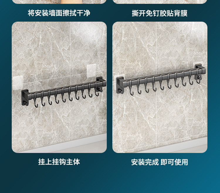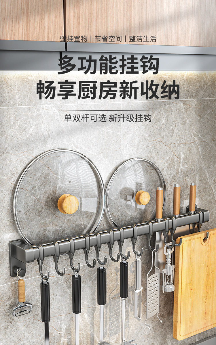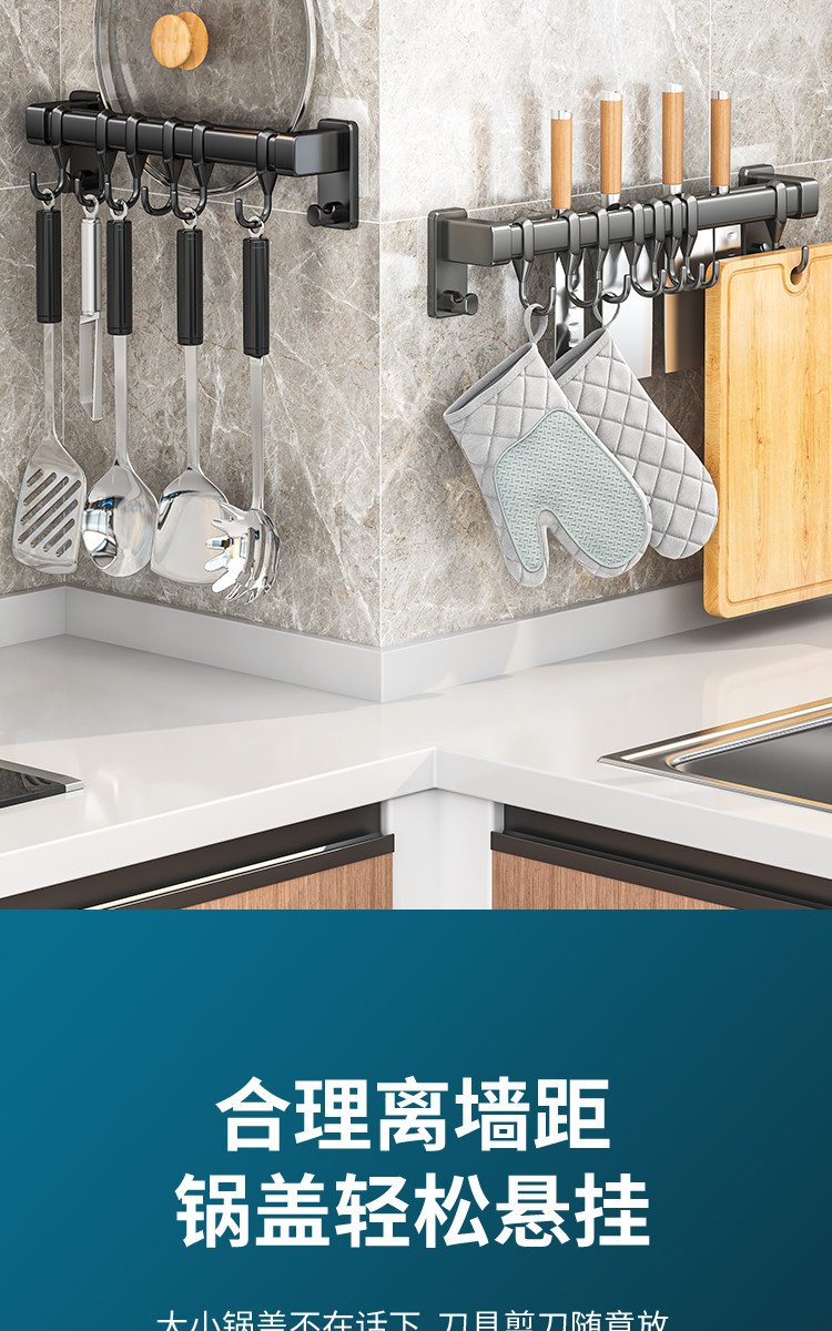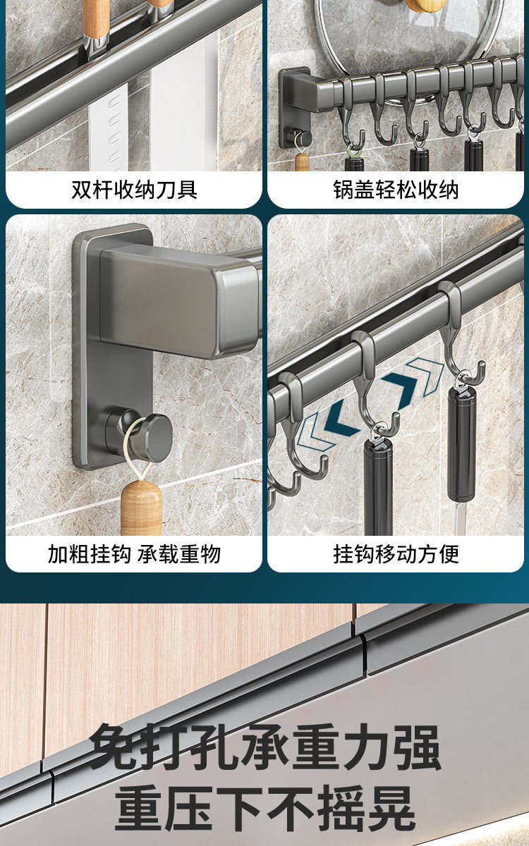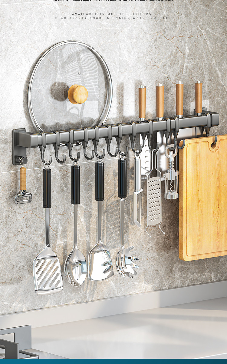 Kitchen Hook Rack, No-Drill Hanging Rod for Knives, Pots, Spoons, Spatulas, Multifunctional Wall-Mounted Storage Rack