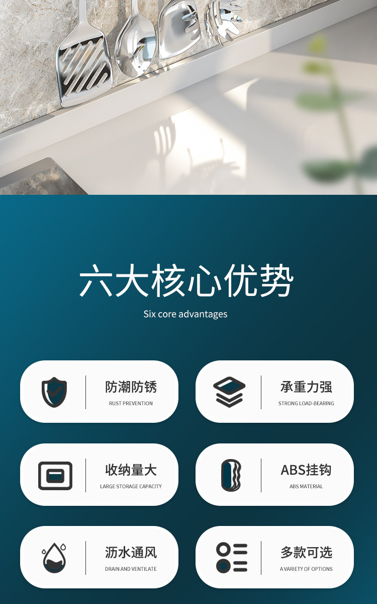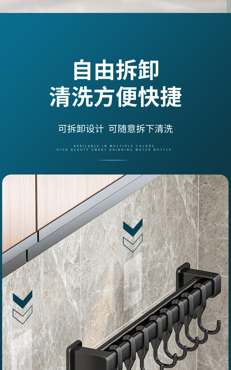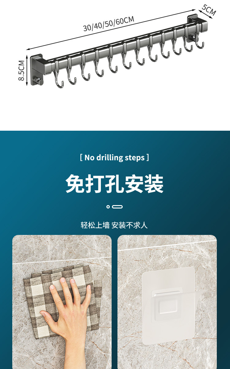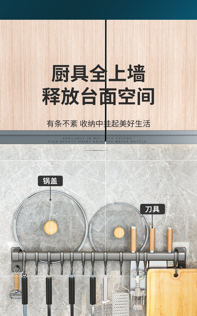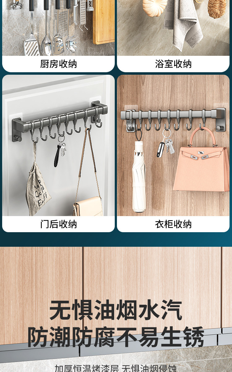 Kitchen Hook Rack, No-Drill Hanging Rod for Knives, Pots, Spoons, Spatulas, Multifunctional Wall-Mounted Storage Rack