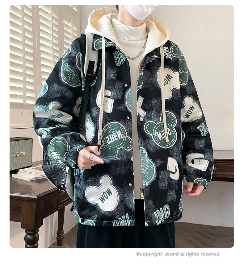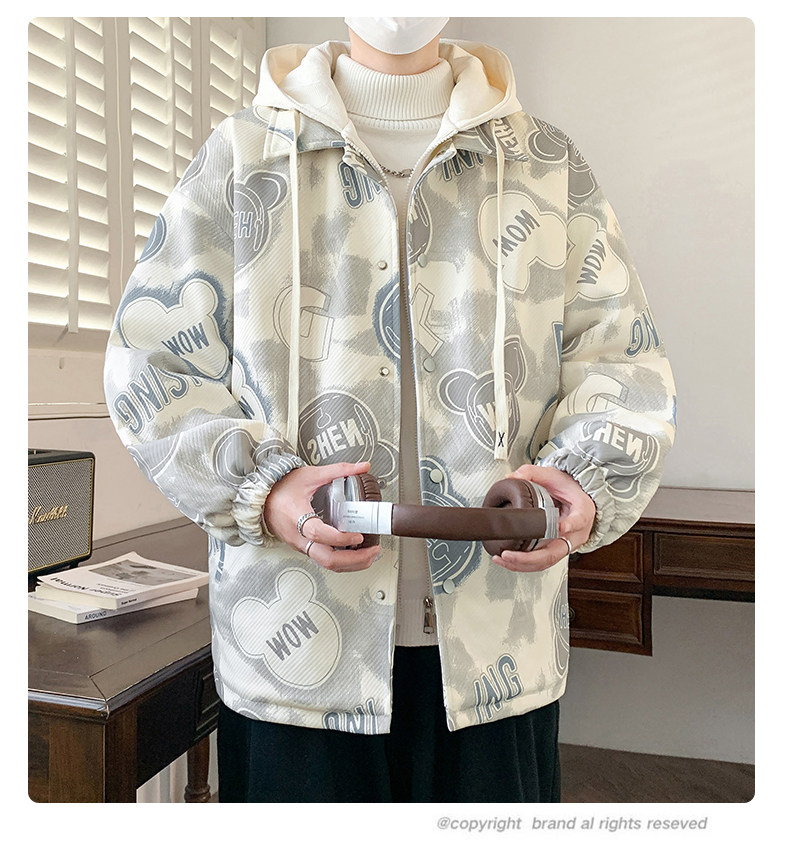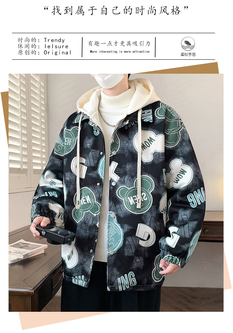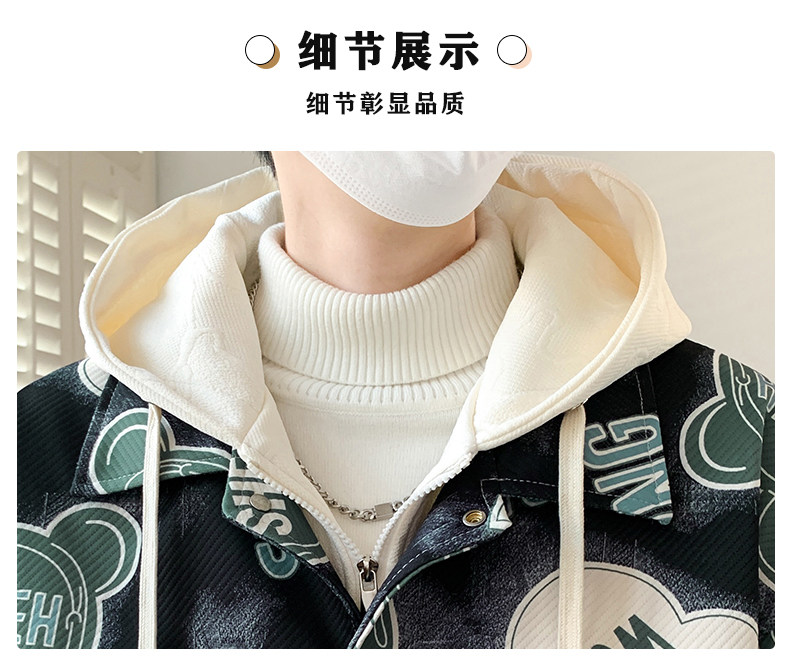 Fake Two-Piece Jacket for Men, Hong Kong Style Trendy Casual Hooded Coat, Loose Fit, Bear Print, High-End Feel, Fleece-Lined Top