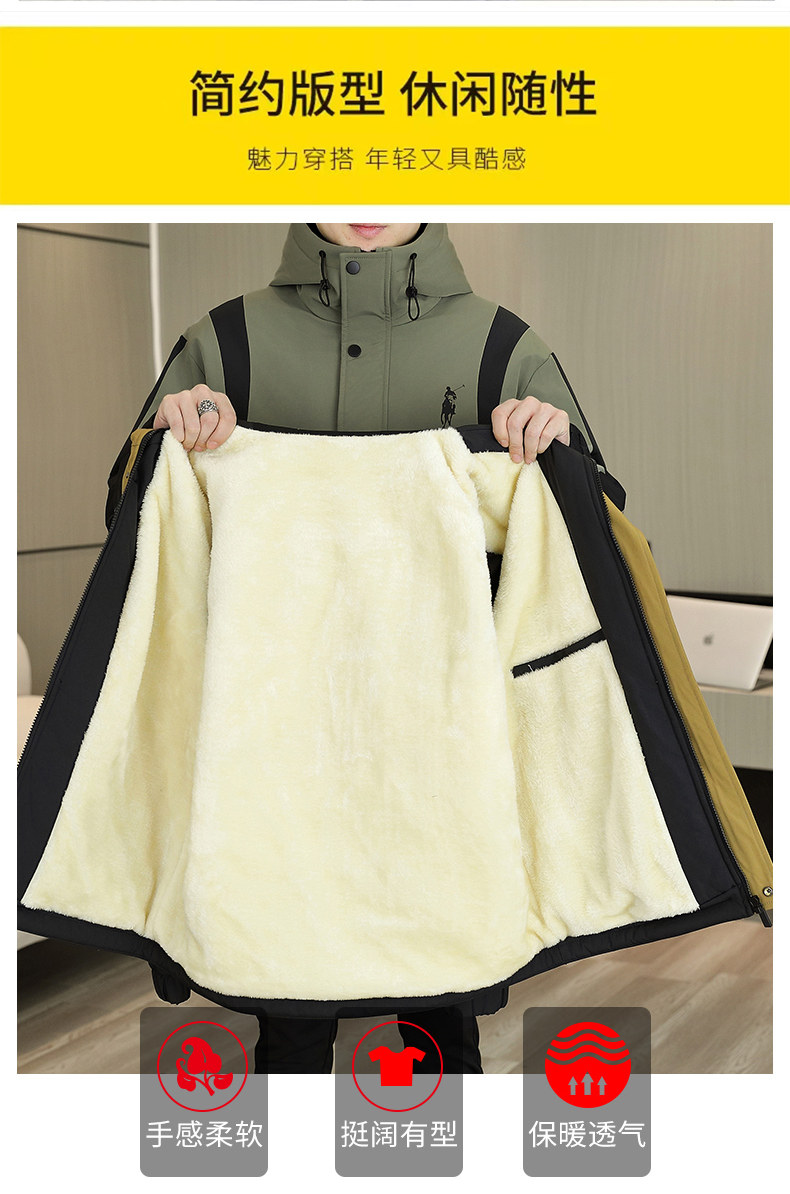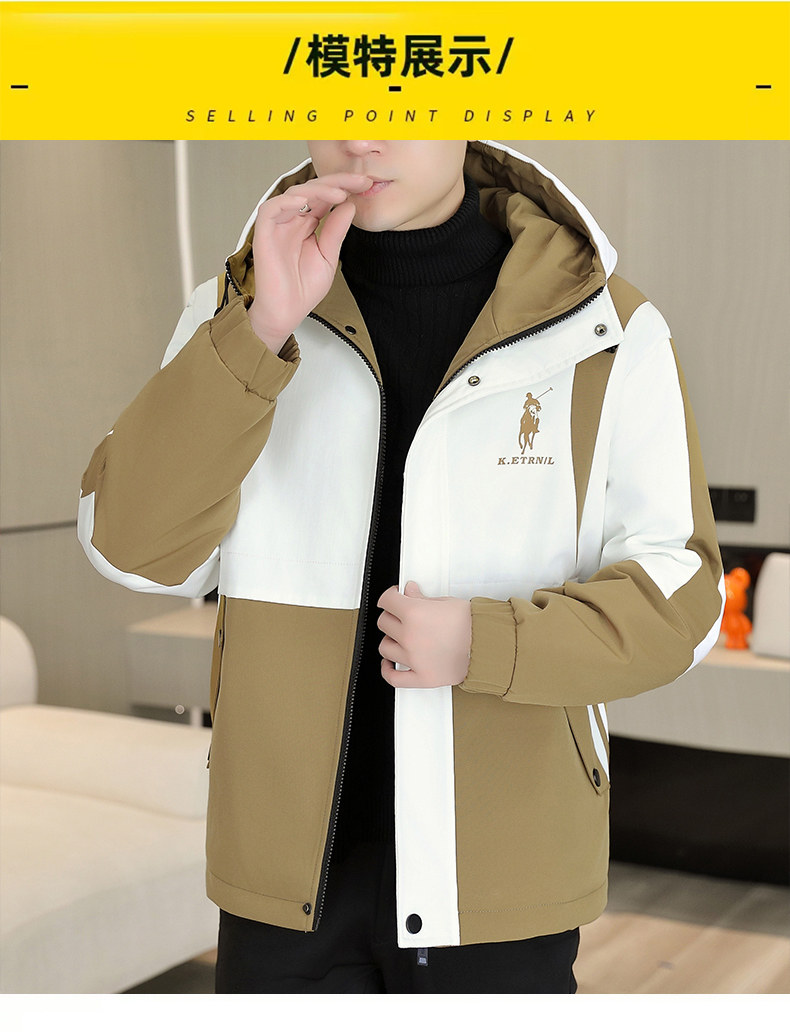 Autumn and Winter Men's New Trendy Color-Blocking Fleece-Lined Thickened Hooded Jacket, Cold-Proof and Warm, High-End Feel Coat