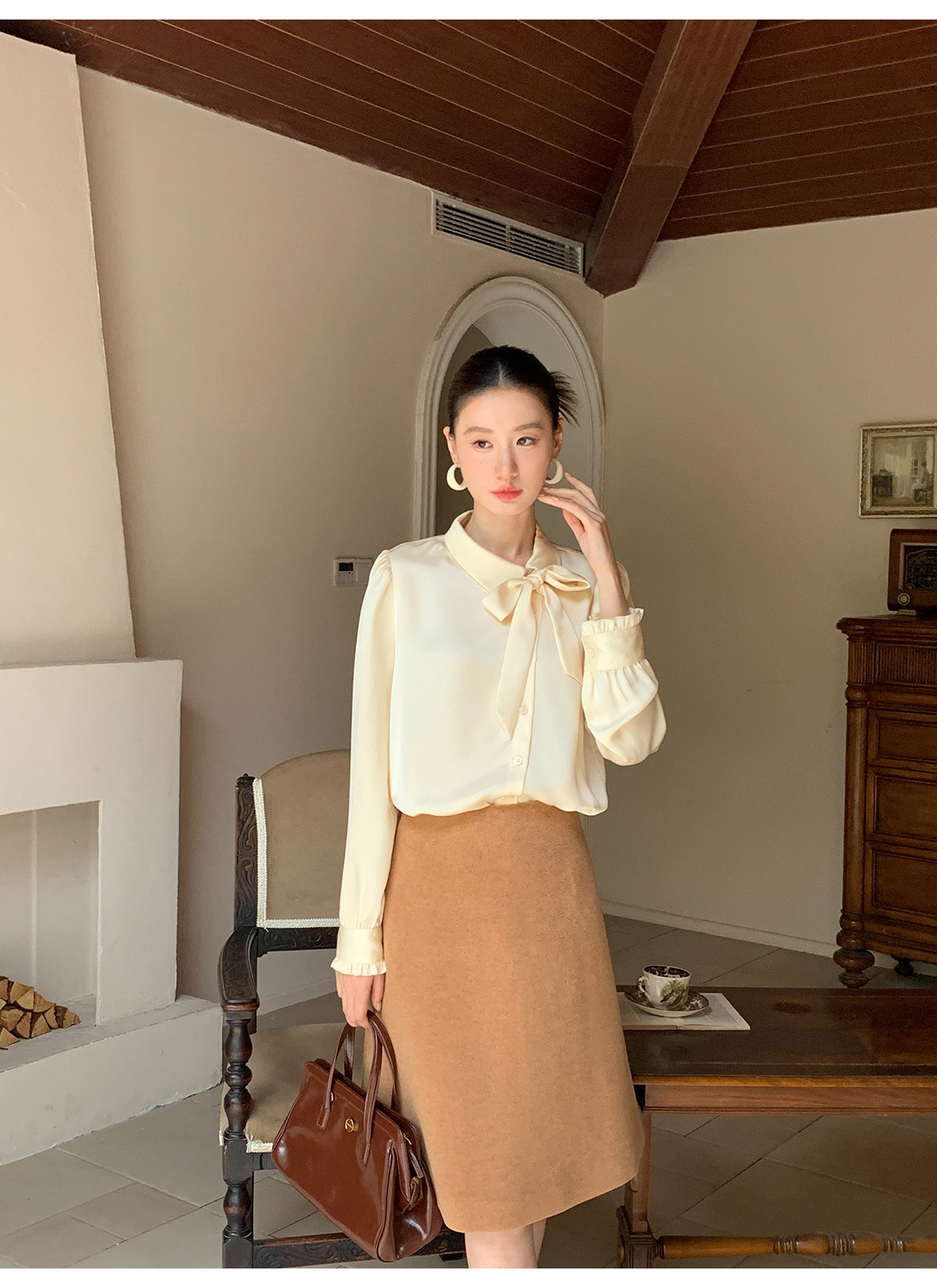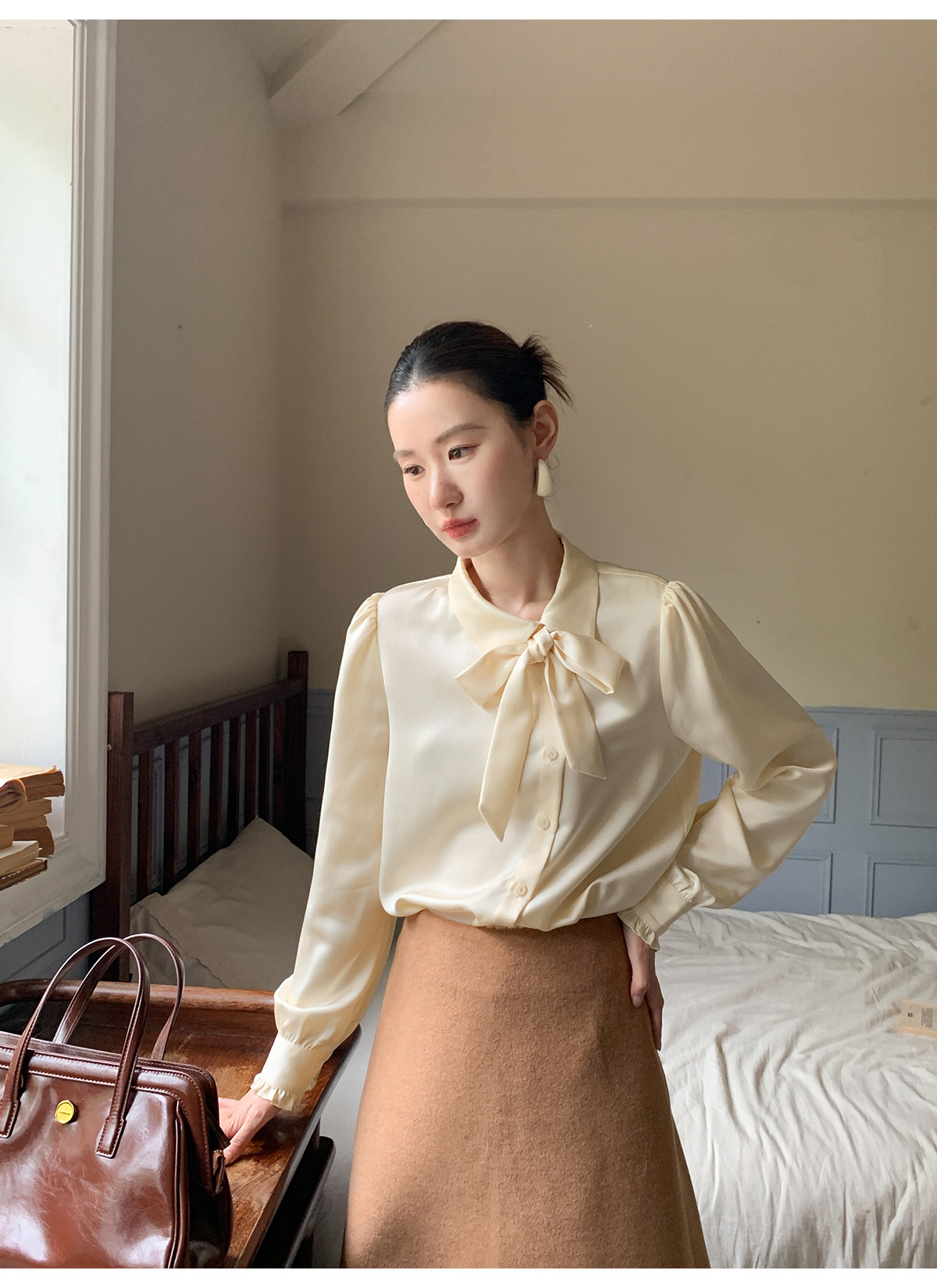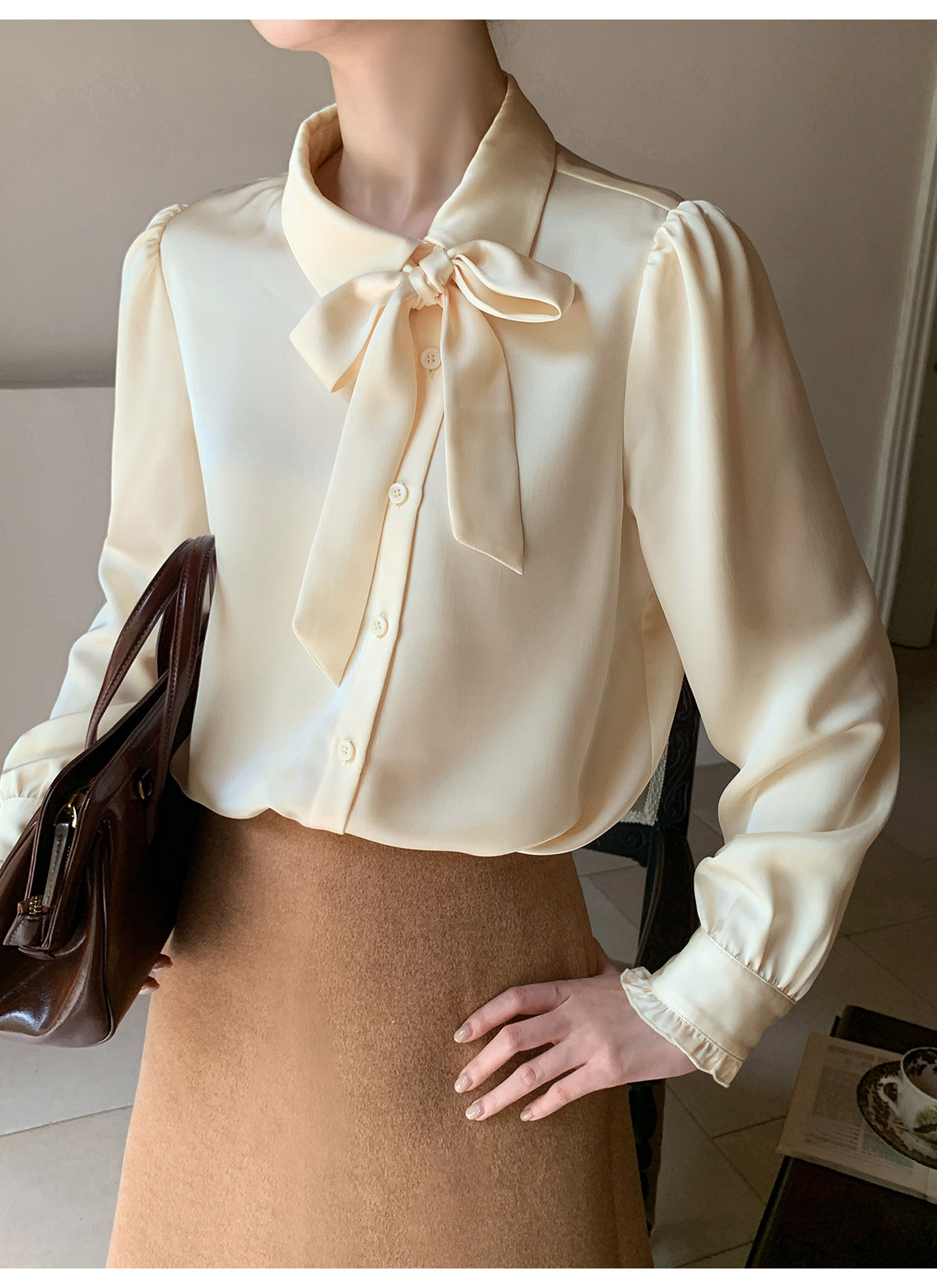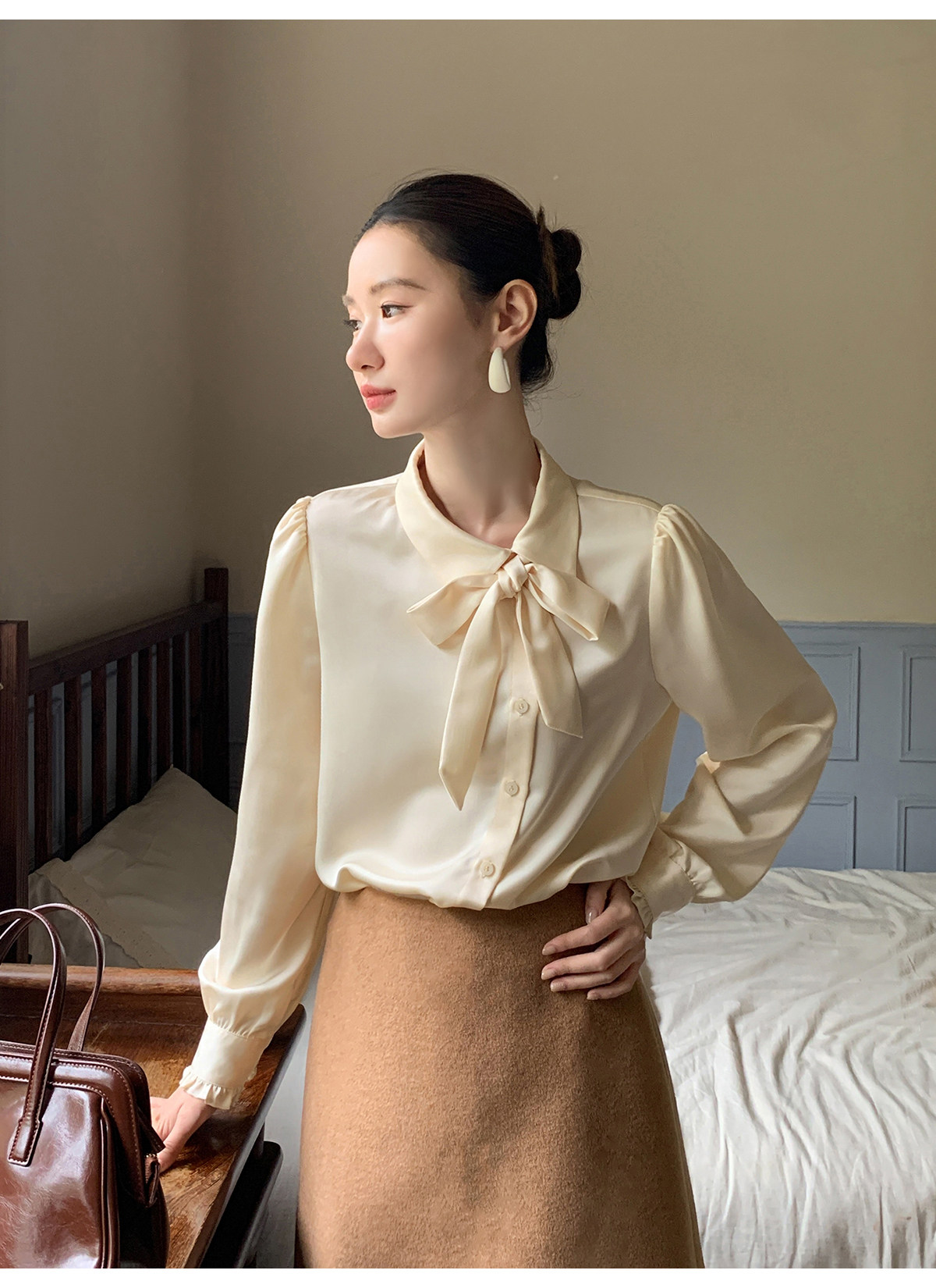 Xxning French-Style Fabric Ribbon-Decorated Satin Shirt for Women, Autumn and Winter, High-End Design, Niche and Unique Top