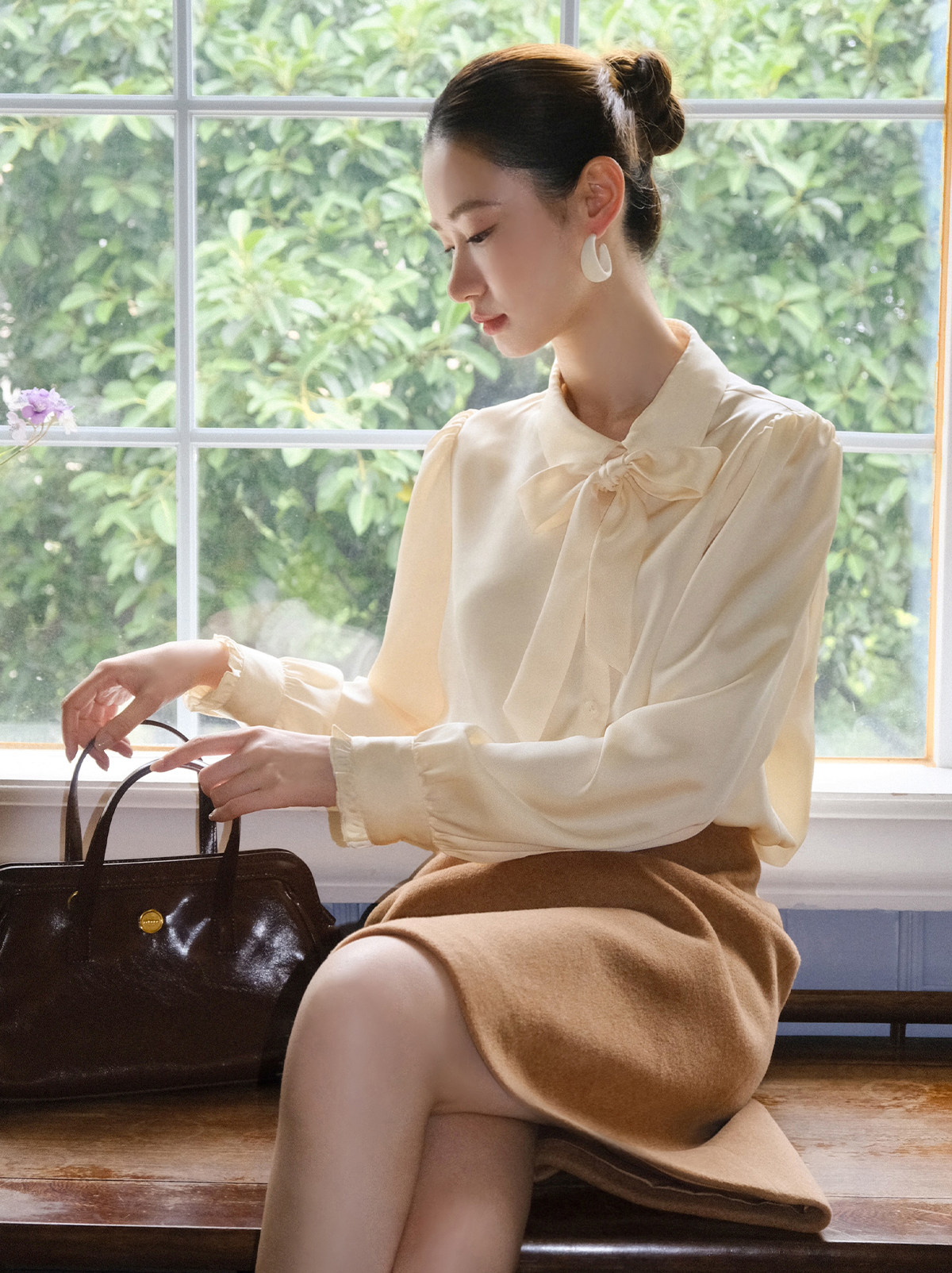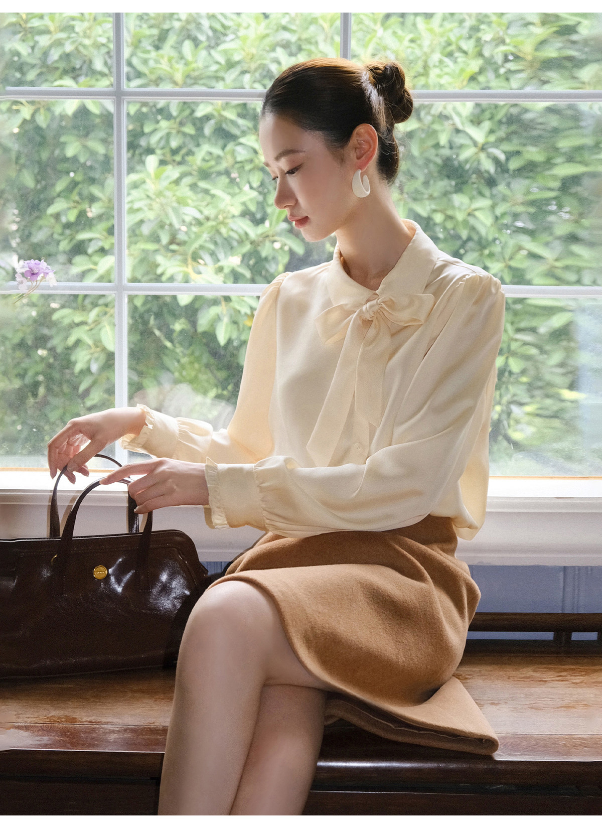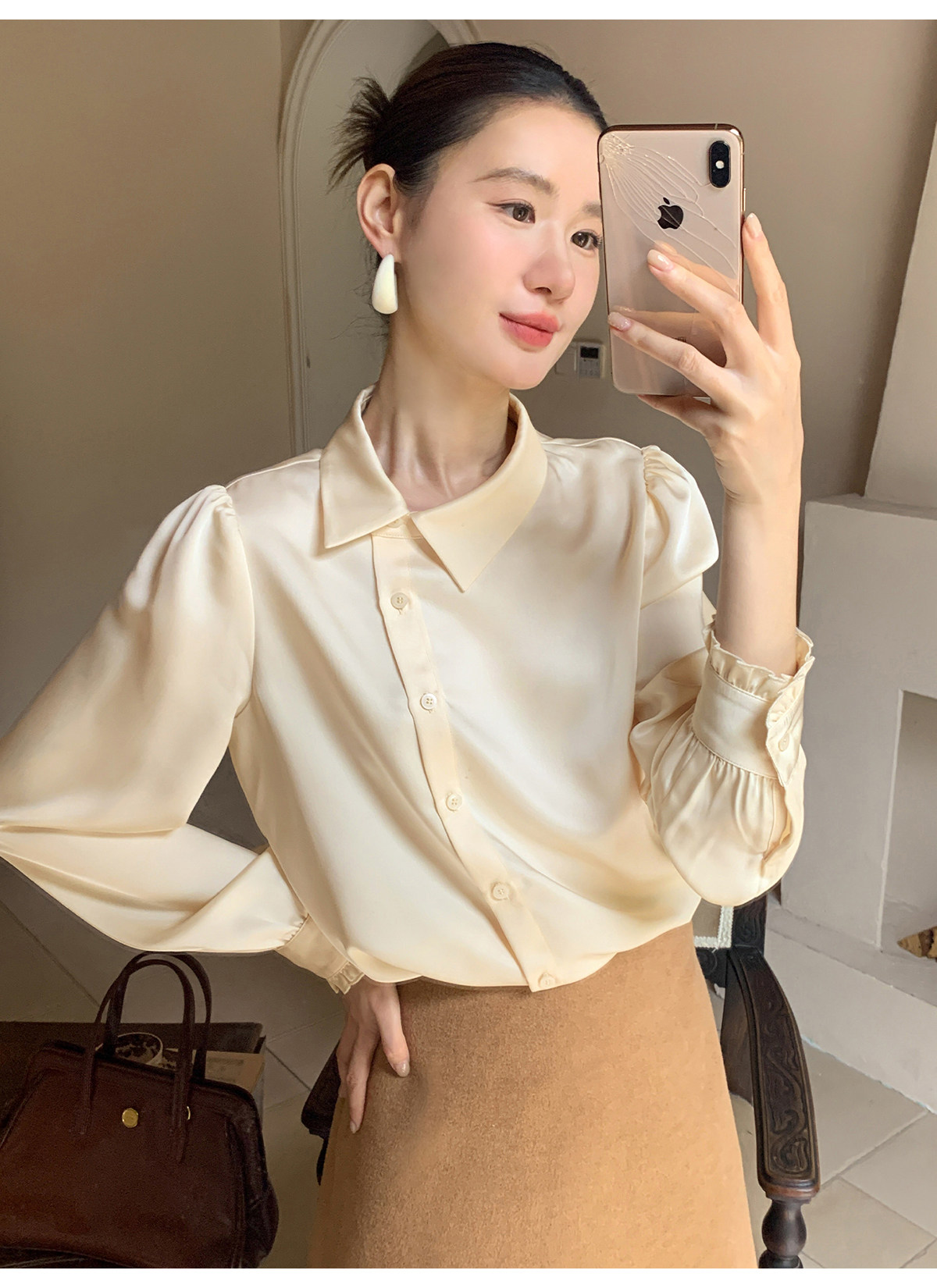 Xxning French-Style Fabric Ribbon-Decorated Satin Shirt for Women, Autumn and Winter, High-End Design, Niche and Unique Top