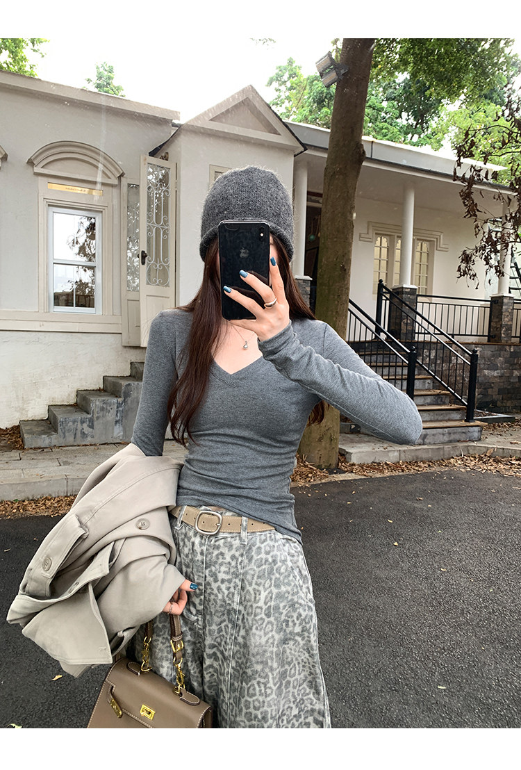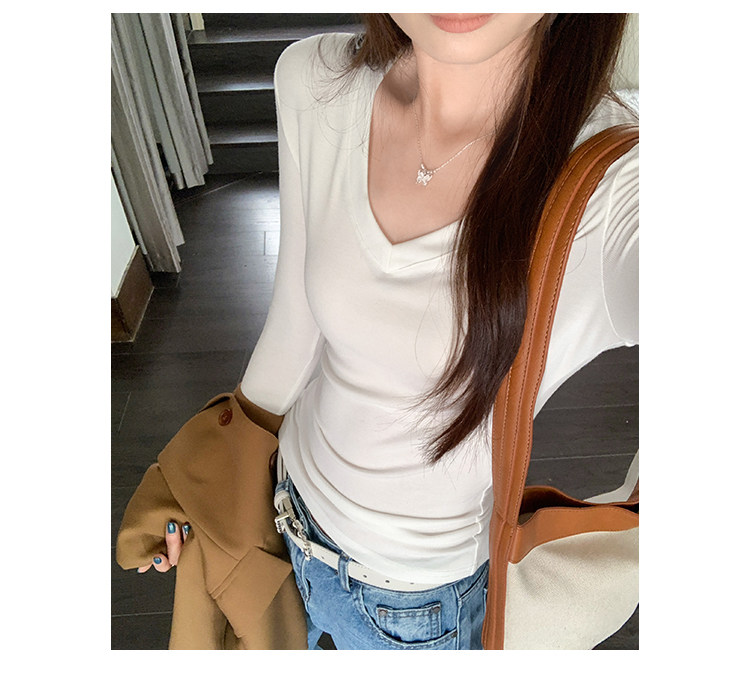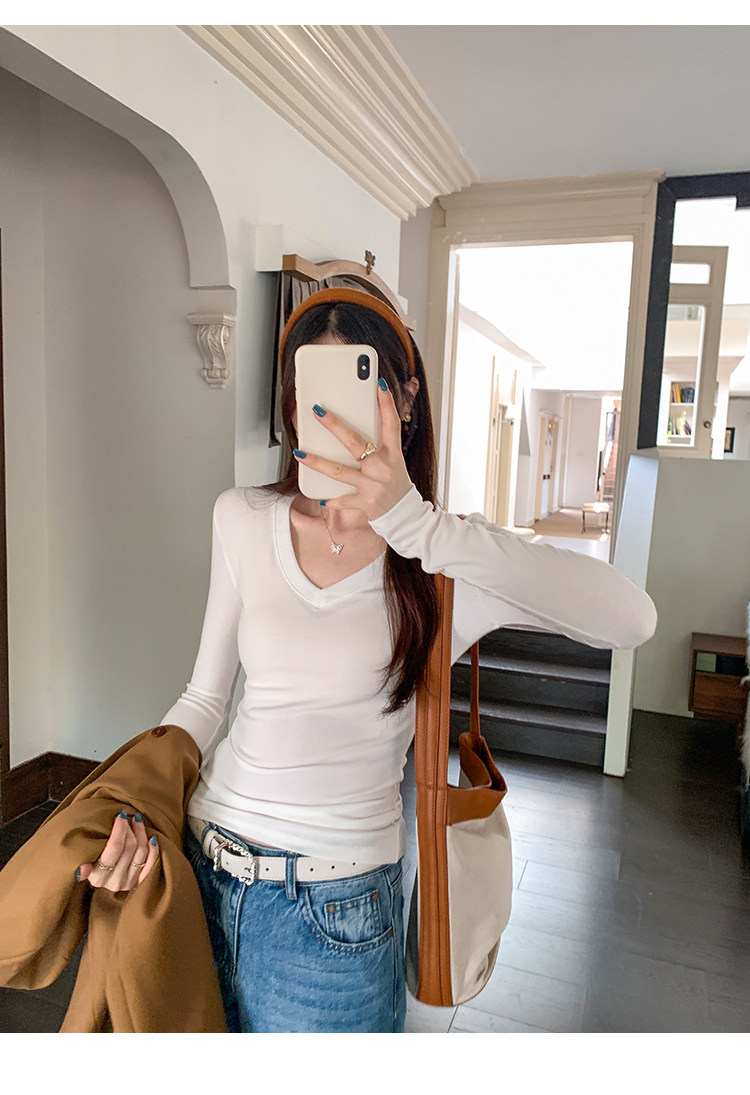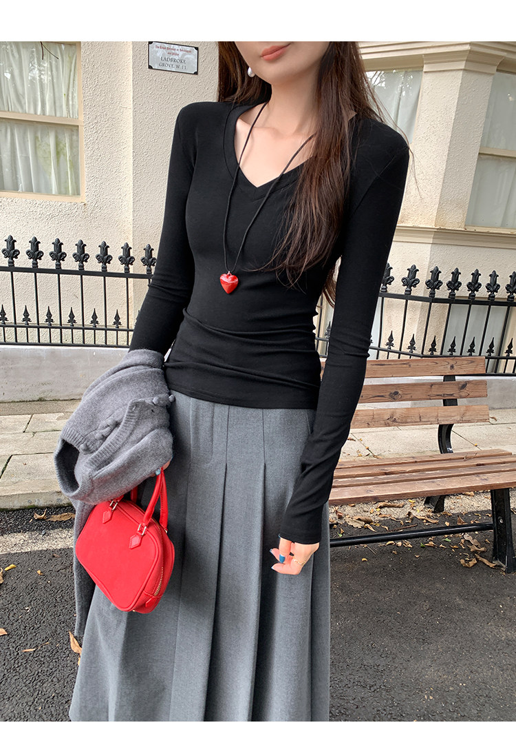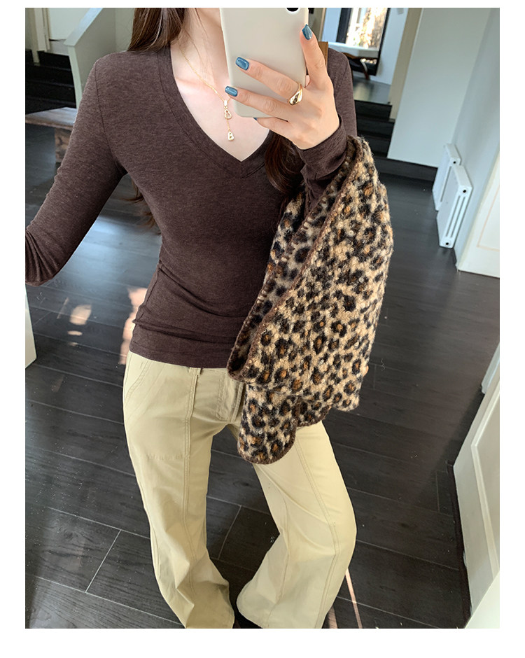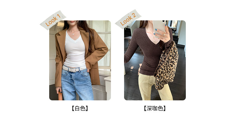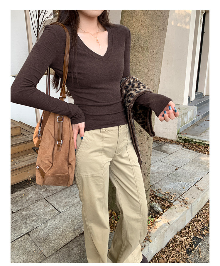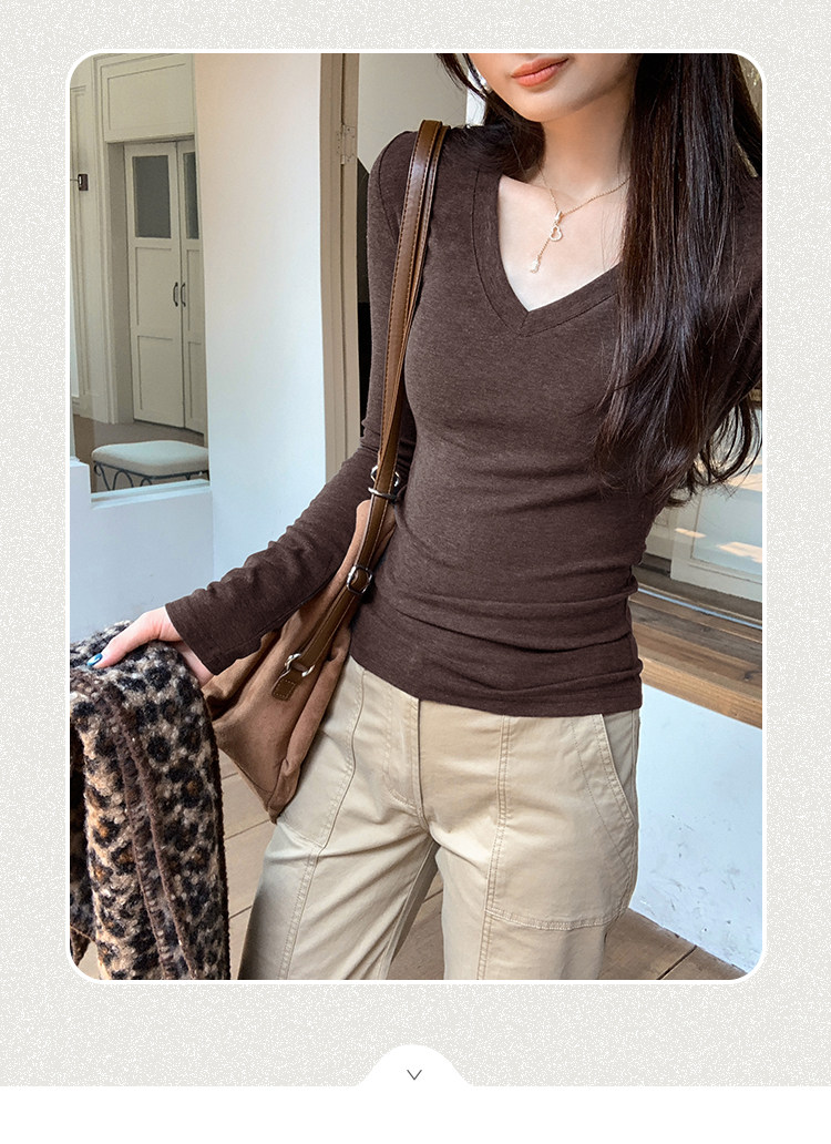 Coffee-Colored V-Neck Long-Sleeve Base T-Shirt for Women, Autumn and Winter, Pure and Sexy, Tight-Fitting, Low-Neck, Regular Shoulder, Slim-Fit Top