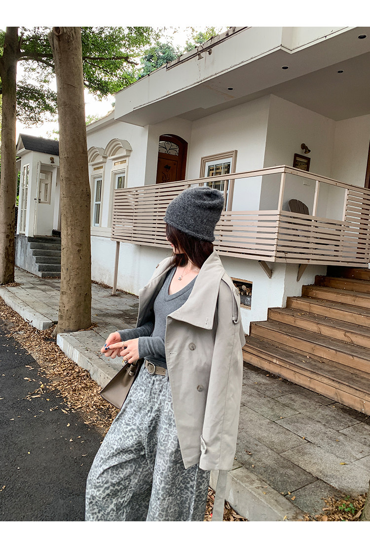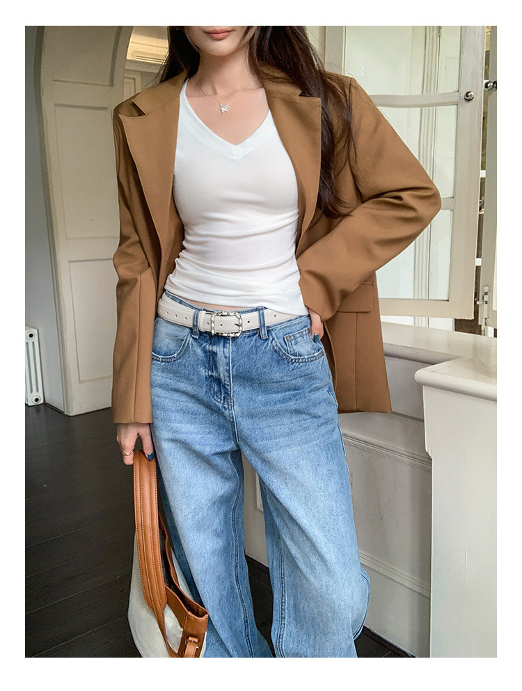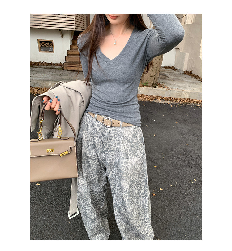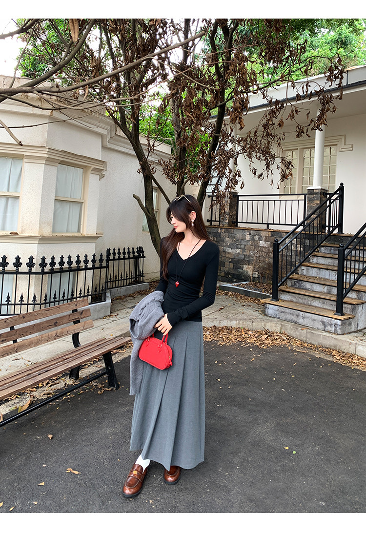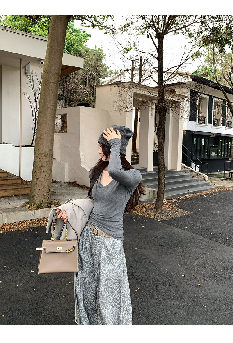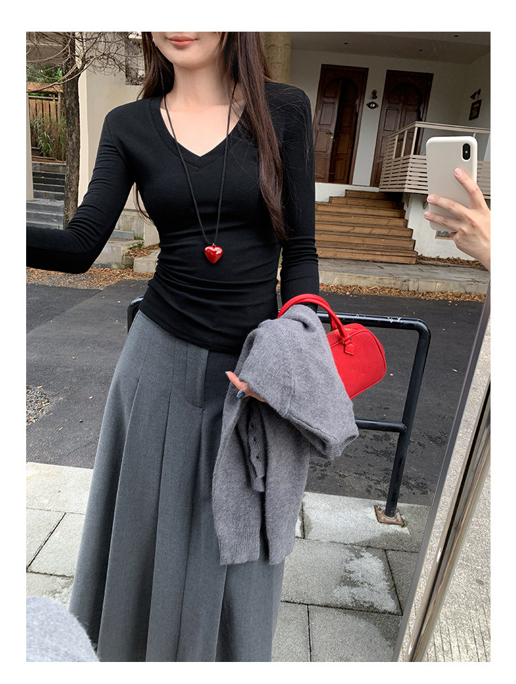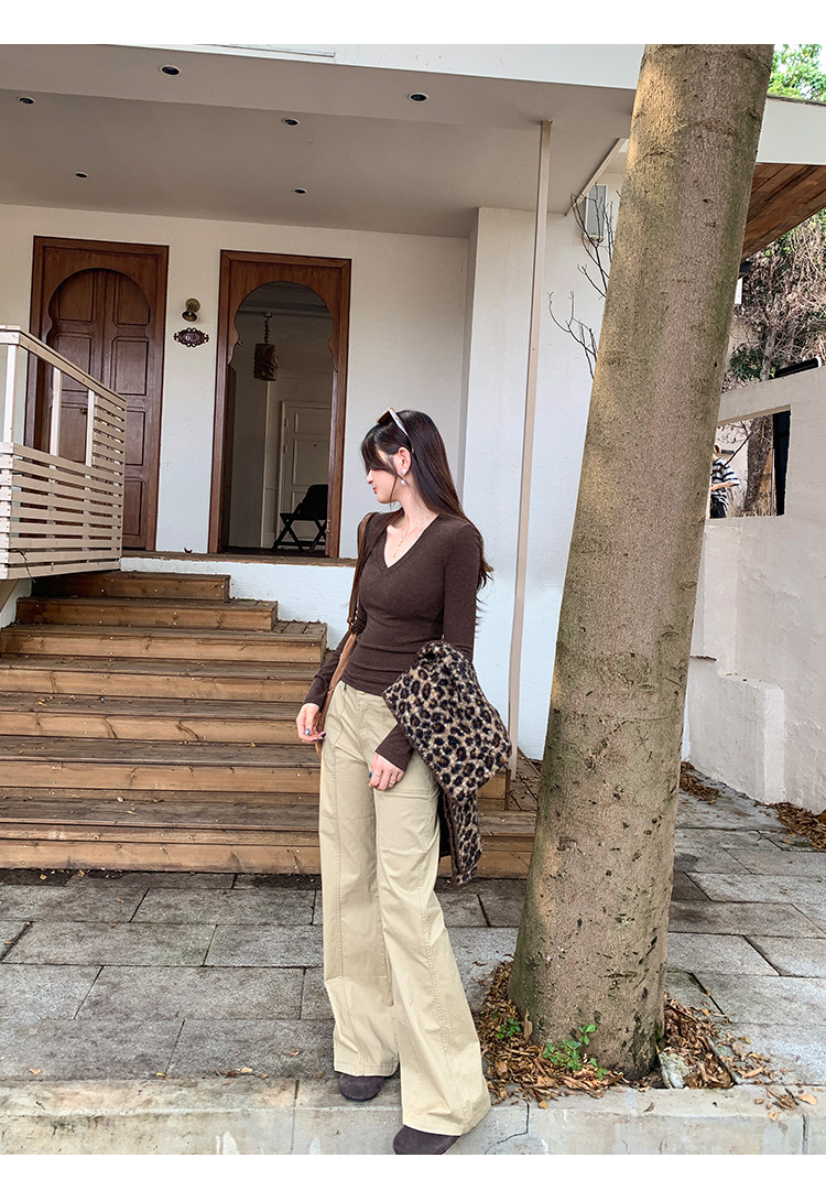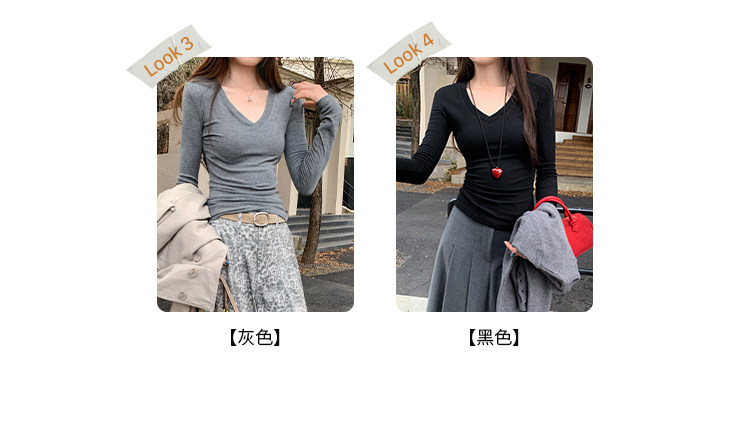 Coffee-Colored V-Neck Long-Sleeve Base T-Shirt for Women, Autumn and Winter, Pure and Sexy, Tight-Fitting, Low-Neck, Regular Shoulder, Slim-Fit Top