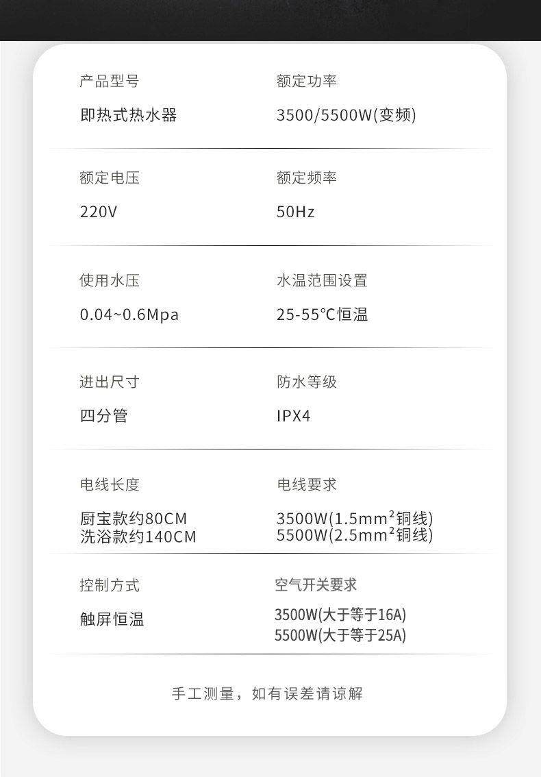 Color Classification Comes with a Full Set of Accessories + Leakage Protection Kitchen Treasure Model 5500W,Comes with a Full Set of Accessories + Leakage Protection Shower Model 5500W Extension Cord,Comes with a Full Set of Accessories + Leakage Protection Shower Model 3500W,Comes with a Full Set of Accessories + Leakage Protection Shower Model 5500W