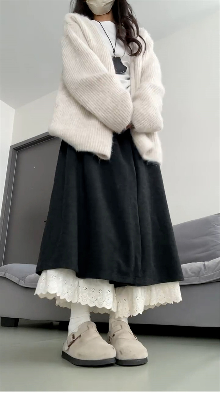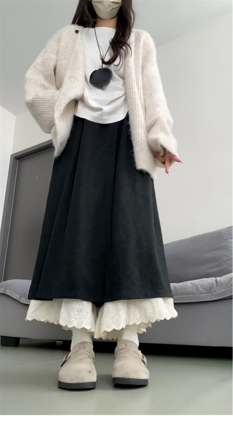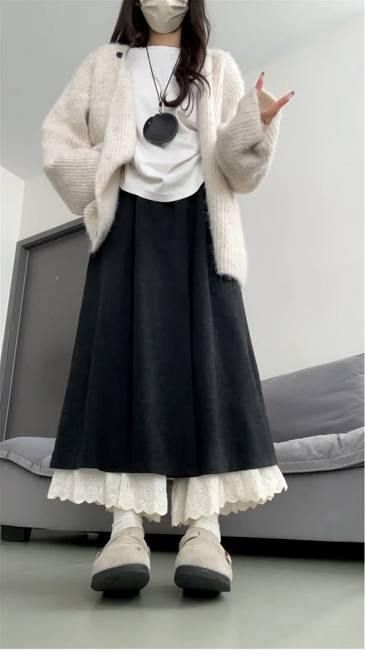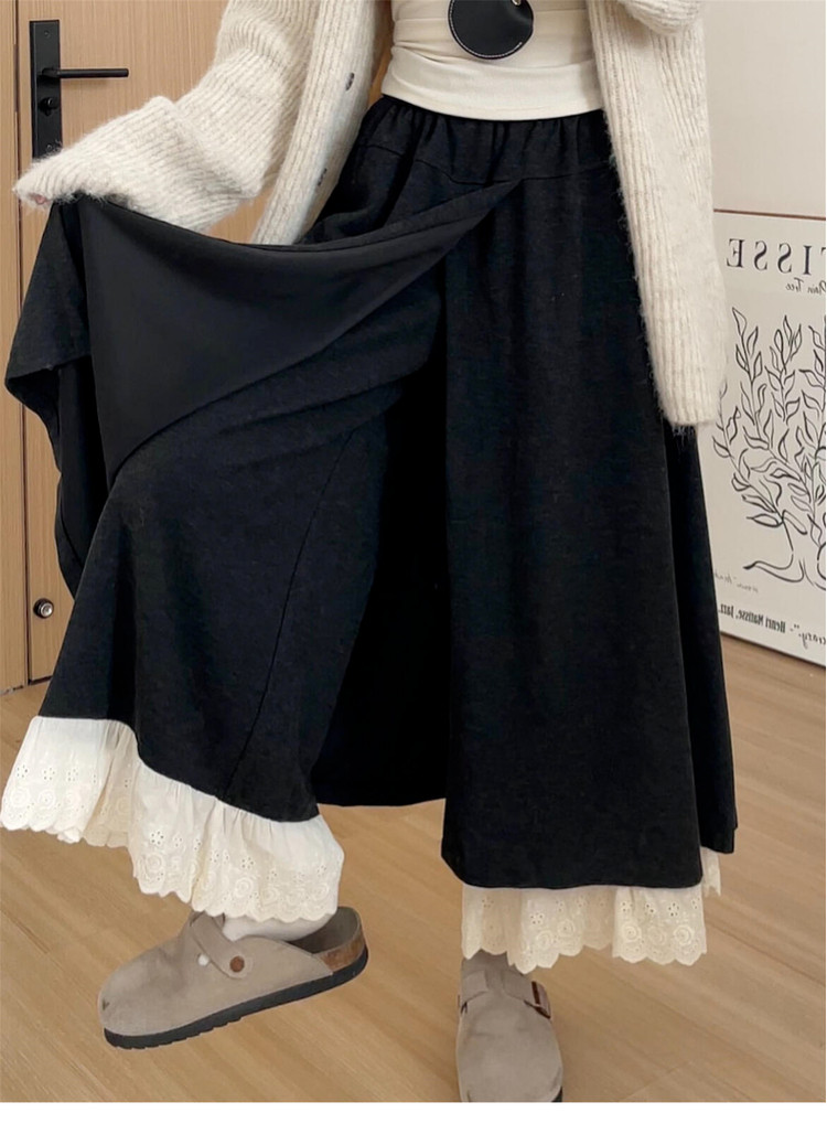 2026 New Lace Spliced Gray Skirt for Women, Early Spring Miu Style Faux Two-Piece High-Waisted A-Line Long Skirt Pants