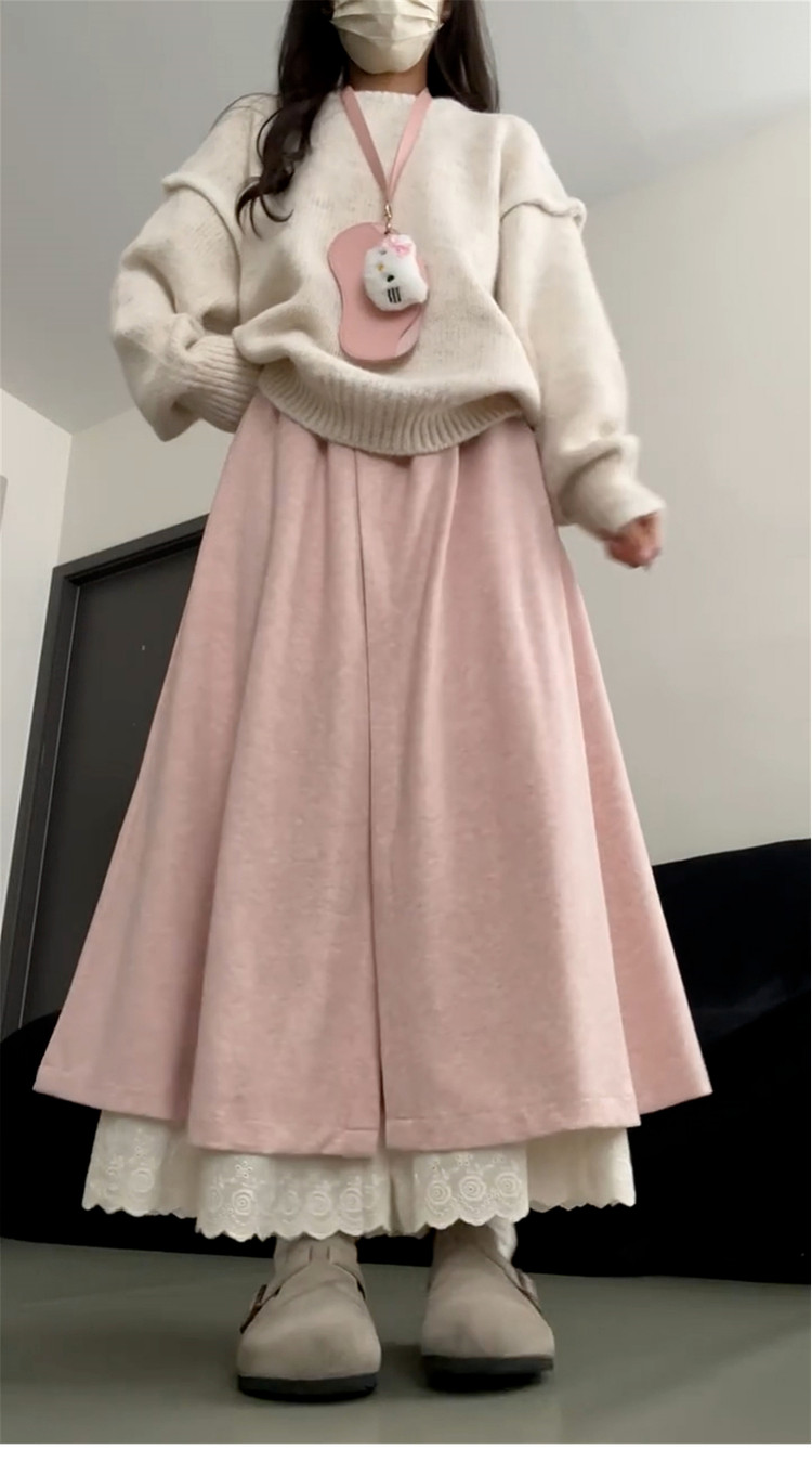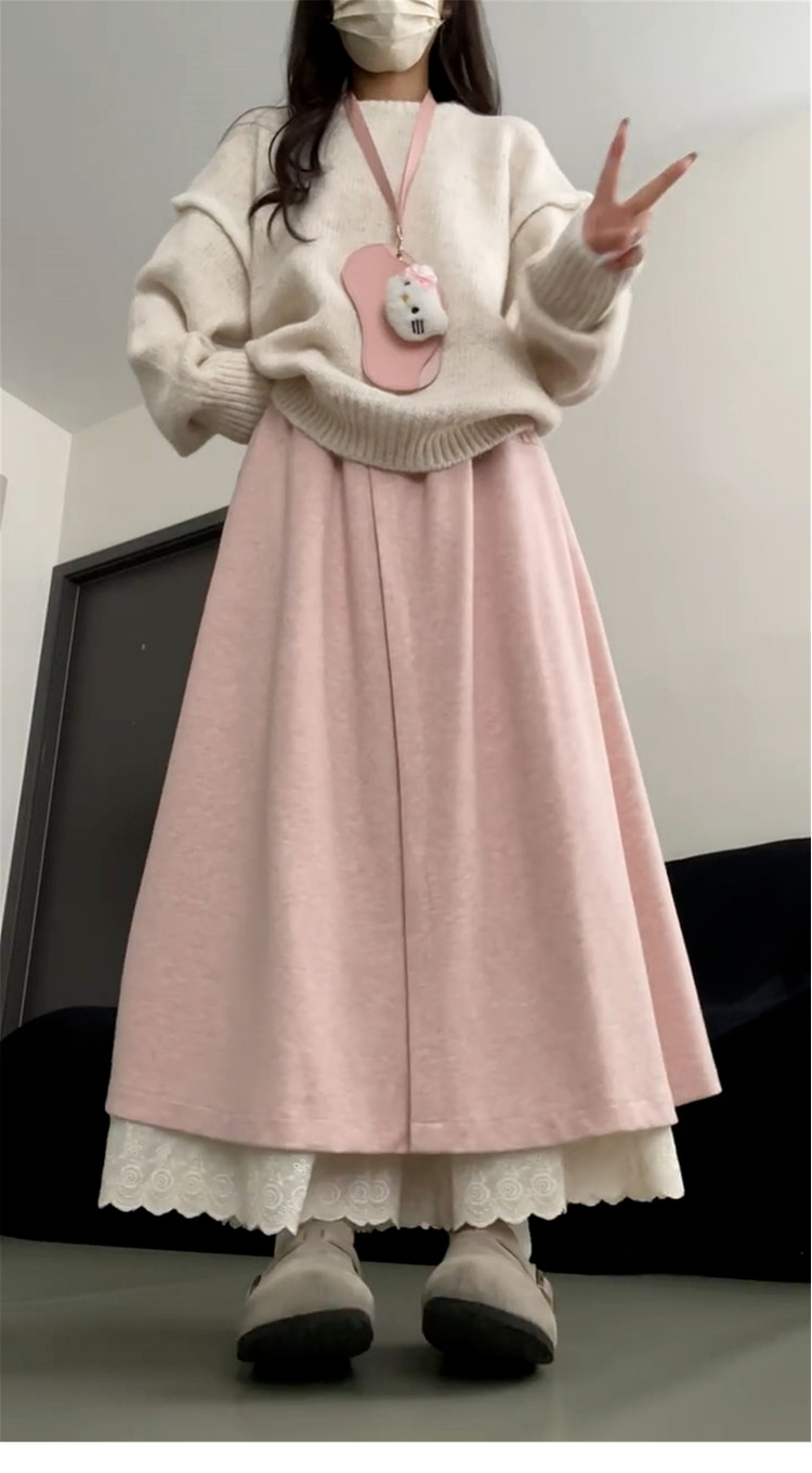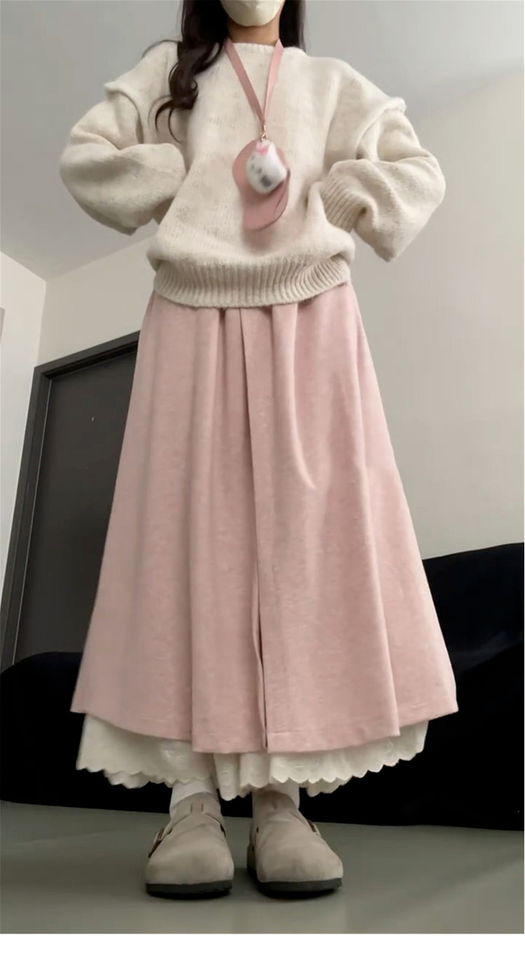 2026 New Lace Spliced Gray Skirt for Women, Early Spring Miu Style Faux Two-Piece High-Waisted A-Line Long Skirt Pants