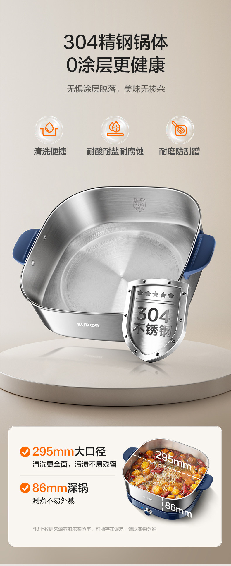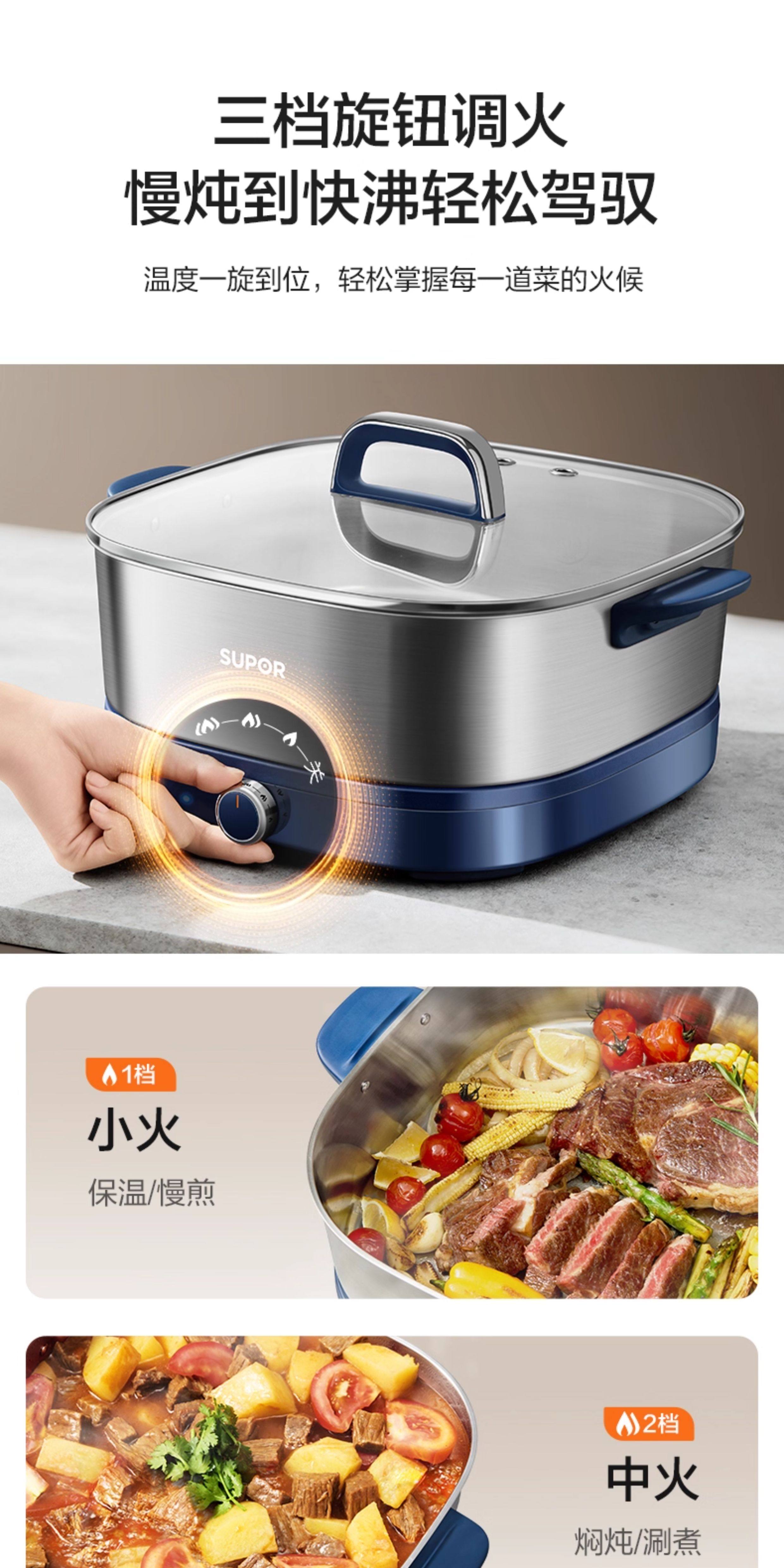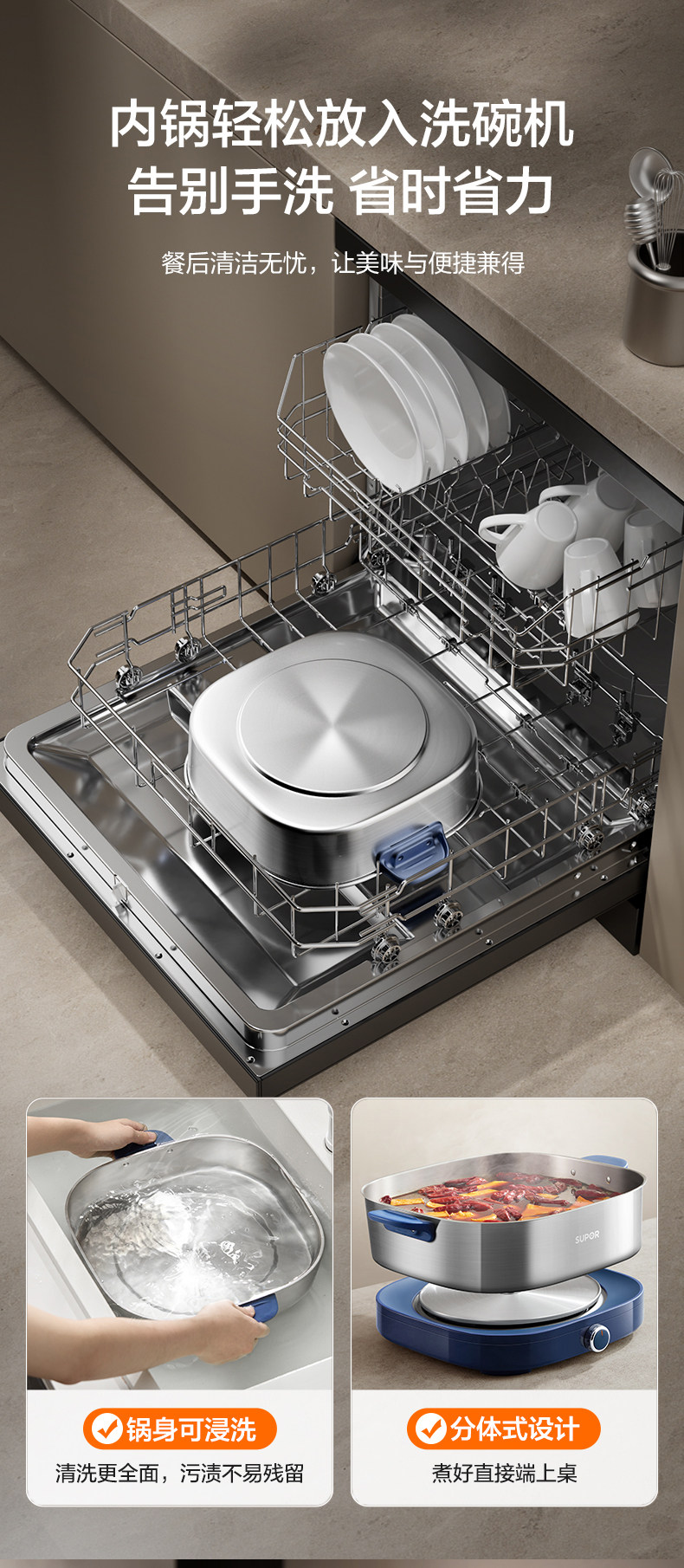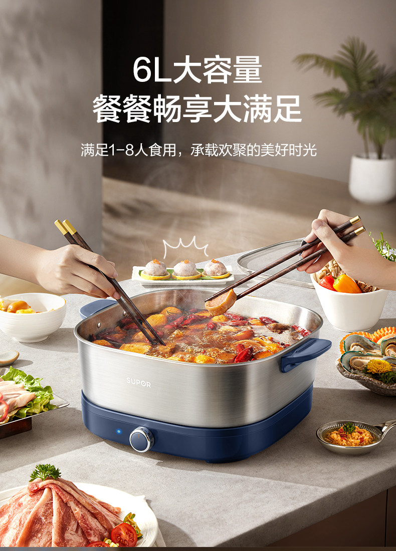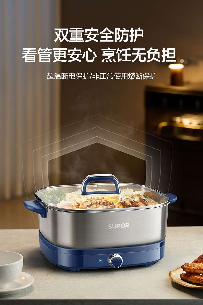 Supor Stainless Steel Electric Hot Pot, Household Electric Cooker, Detachable Type, Non-Coating Electric Cooking Pot, Multifunctional Pot, Official Flagship