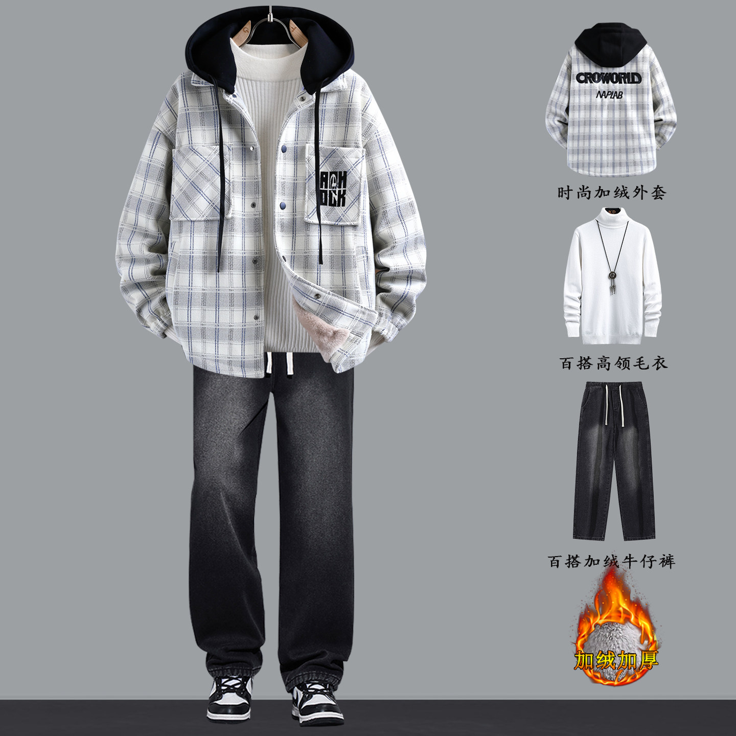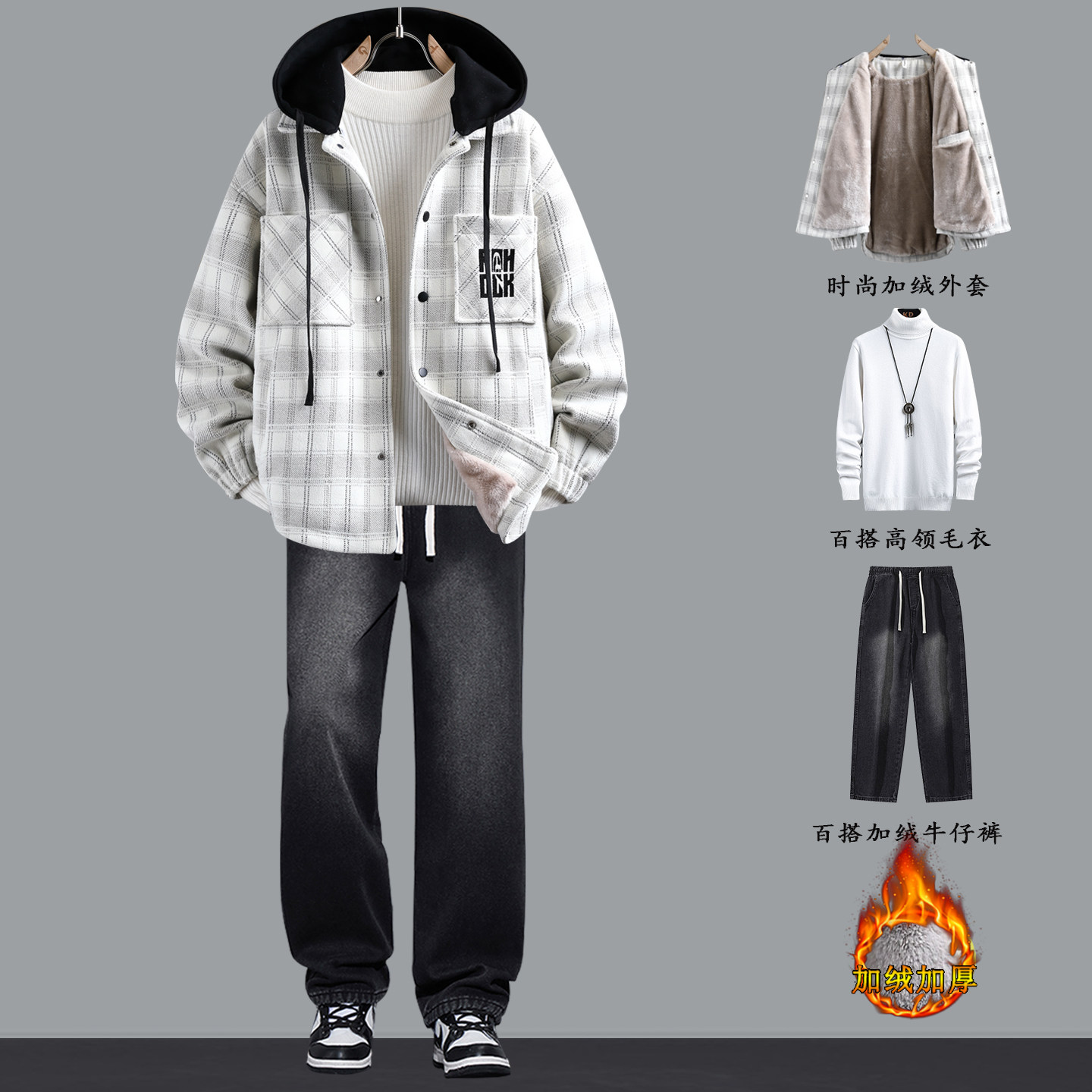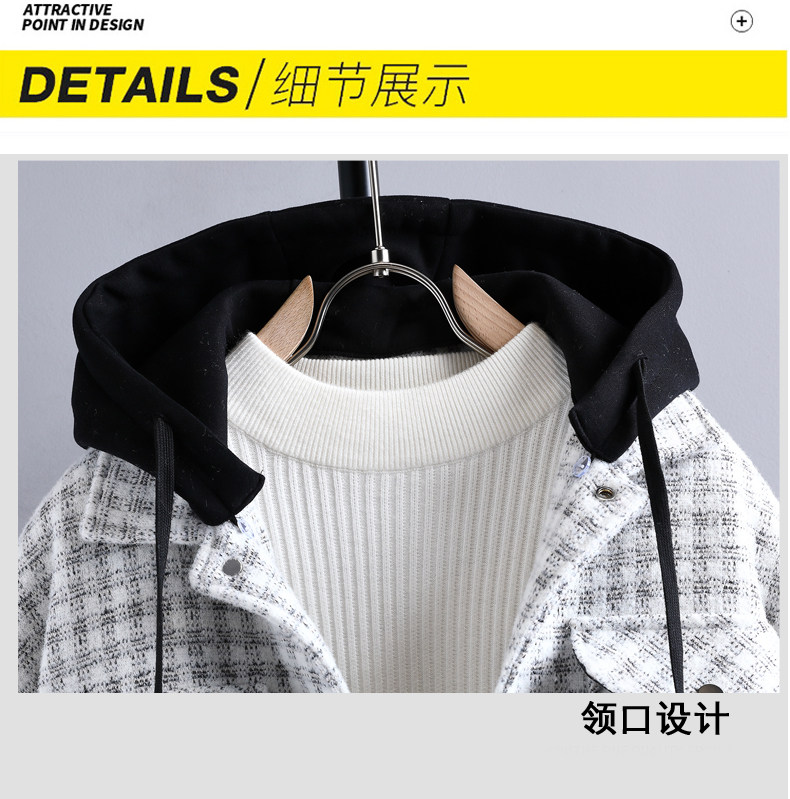 Plaid coat men's autumn and winter velvet thickening trendy brand three-piece jacket men's hooded casual winter warm cotton clothing