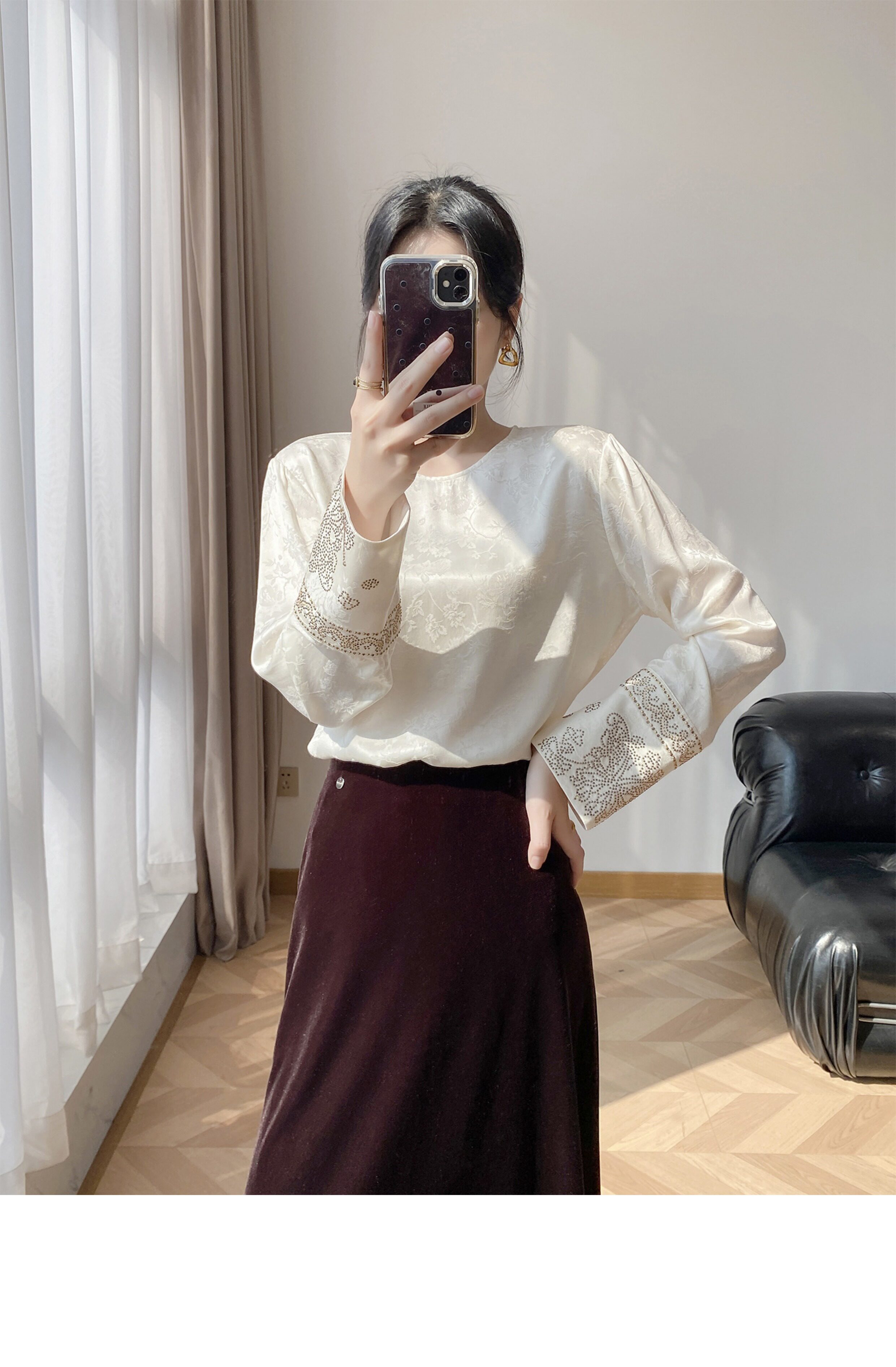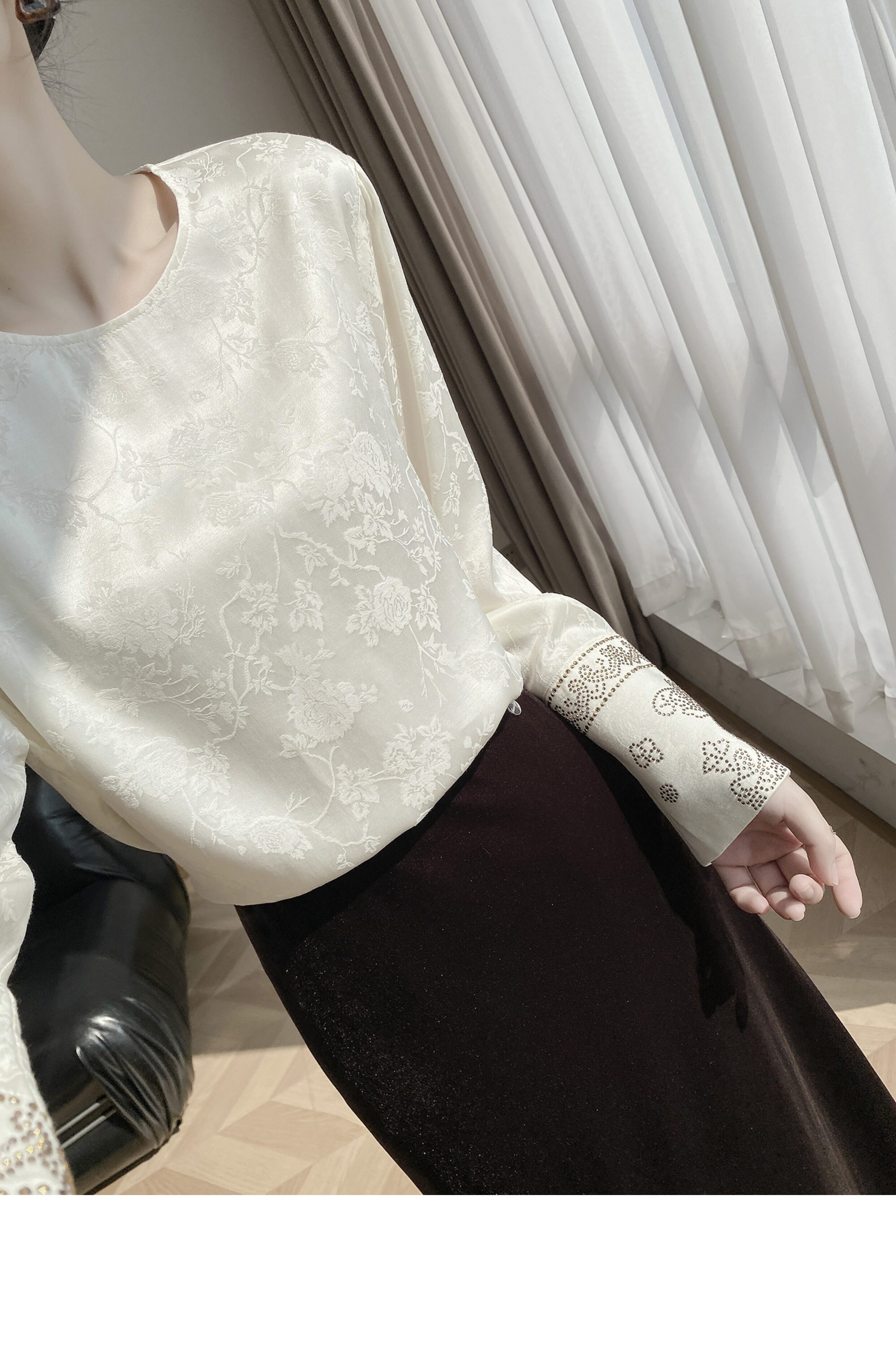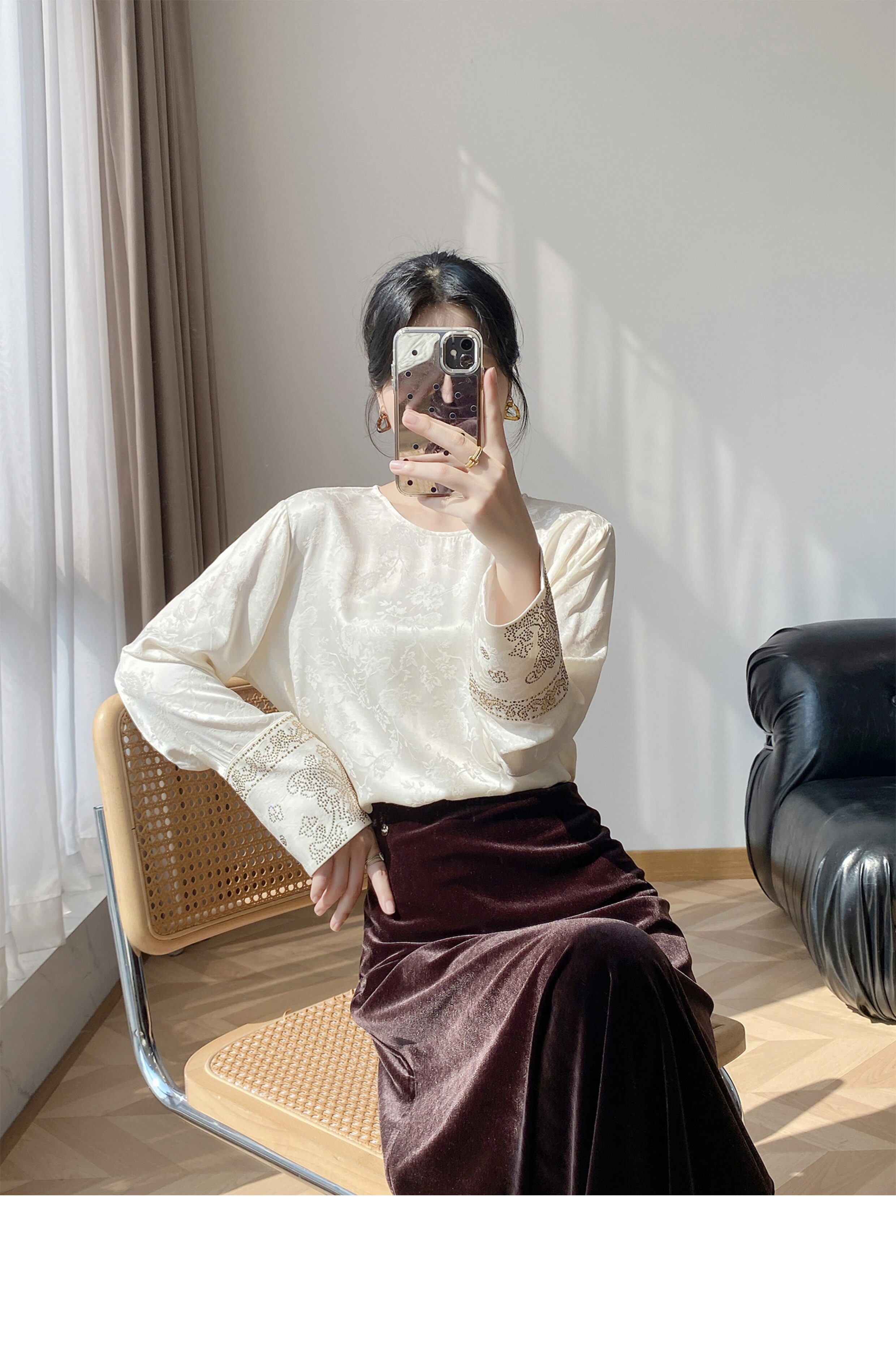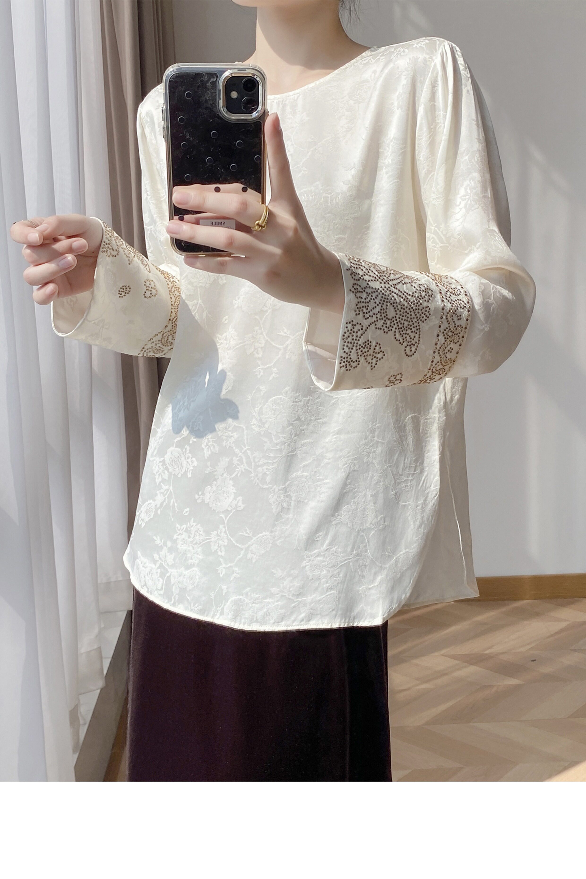 New Chinese Style Light Luxury Off-White Top for Women, Autumn and Winter, Copper Ammonia Silk, Loose Fit, Slimming, Rhinestone Pullover Shirt