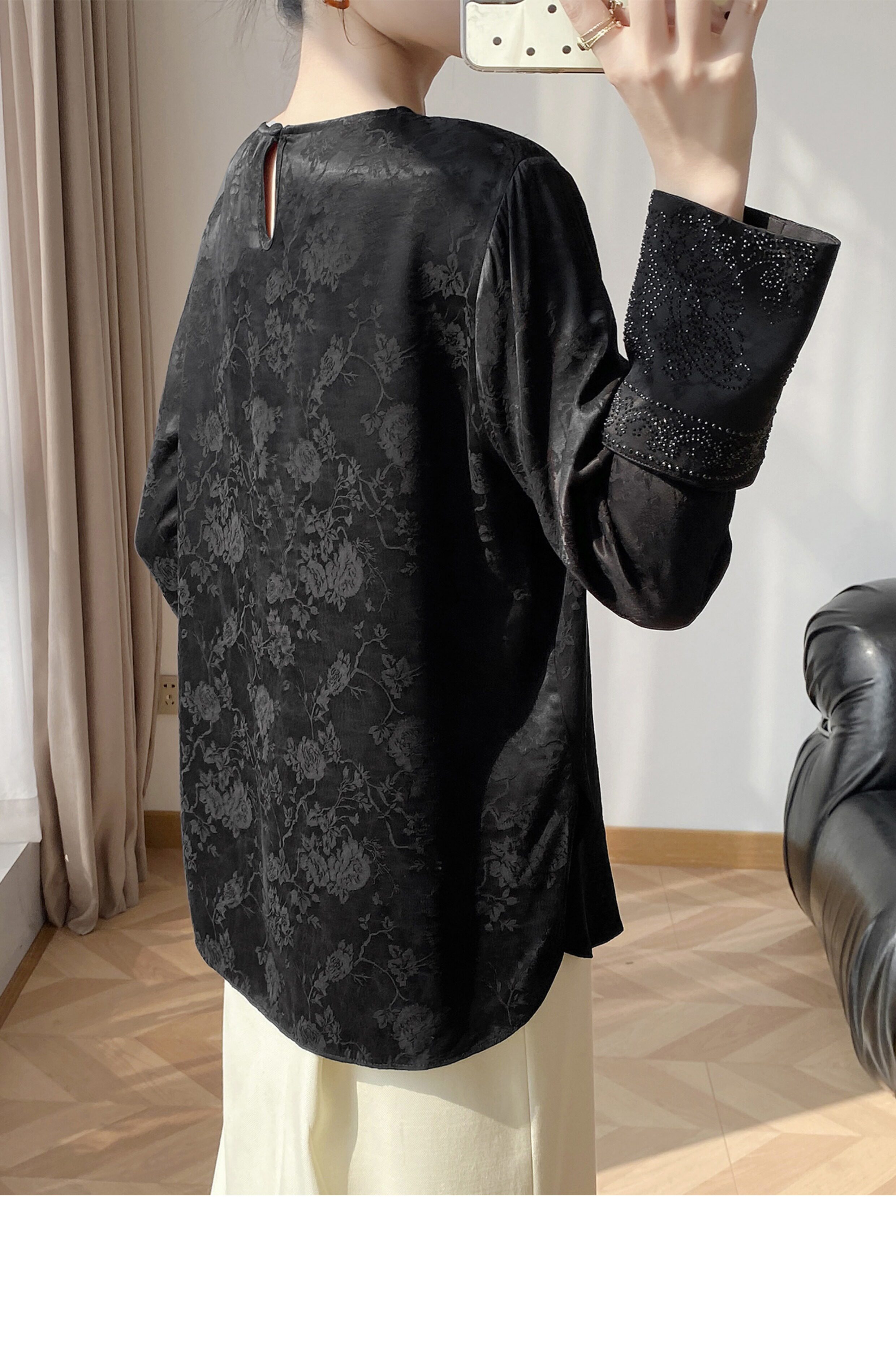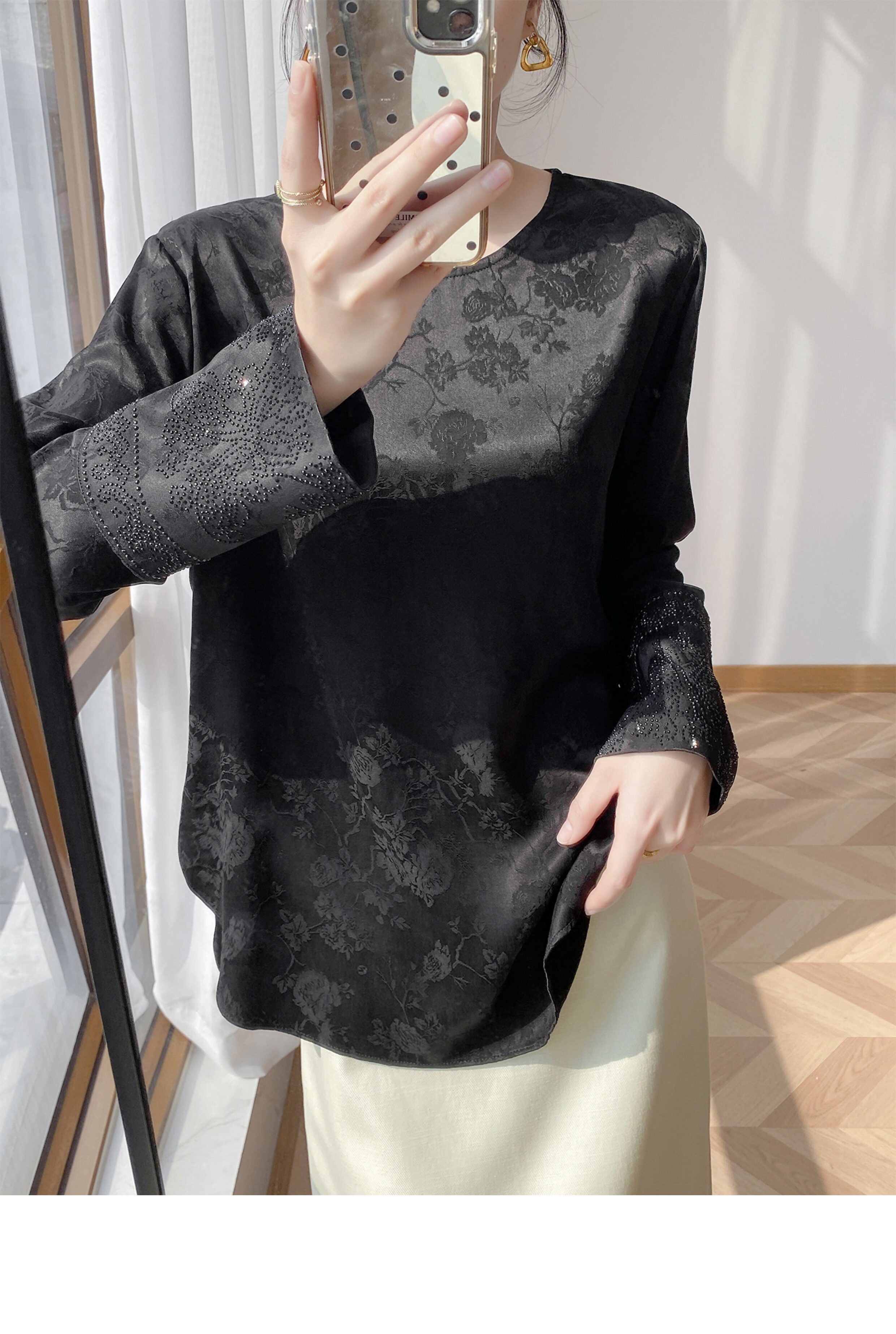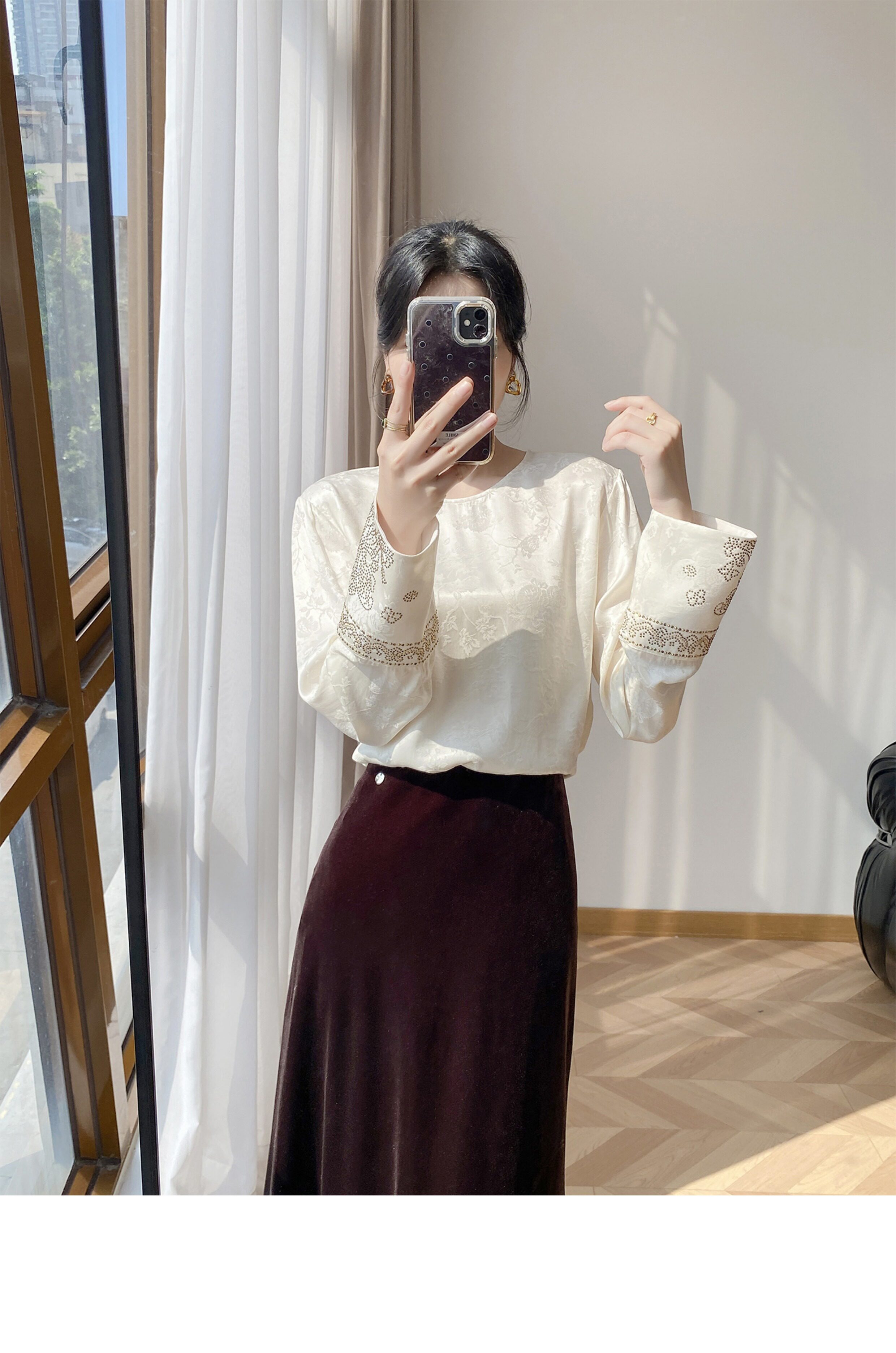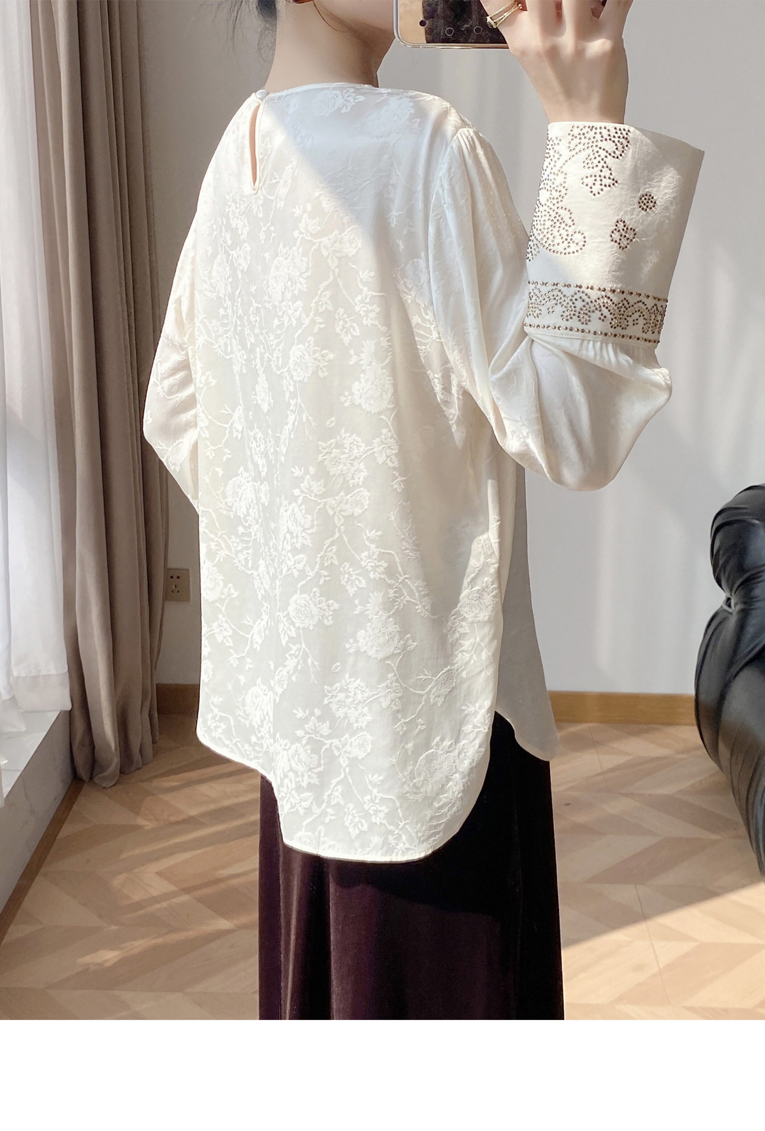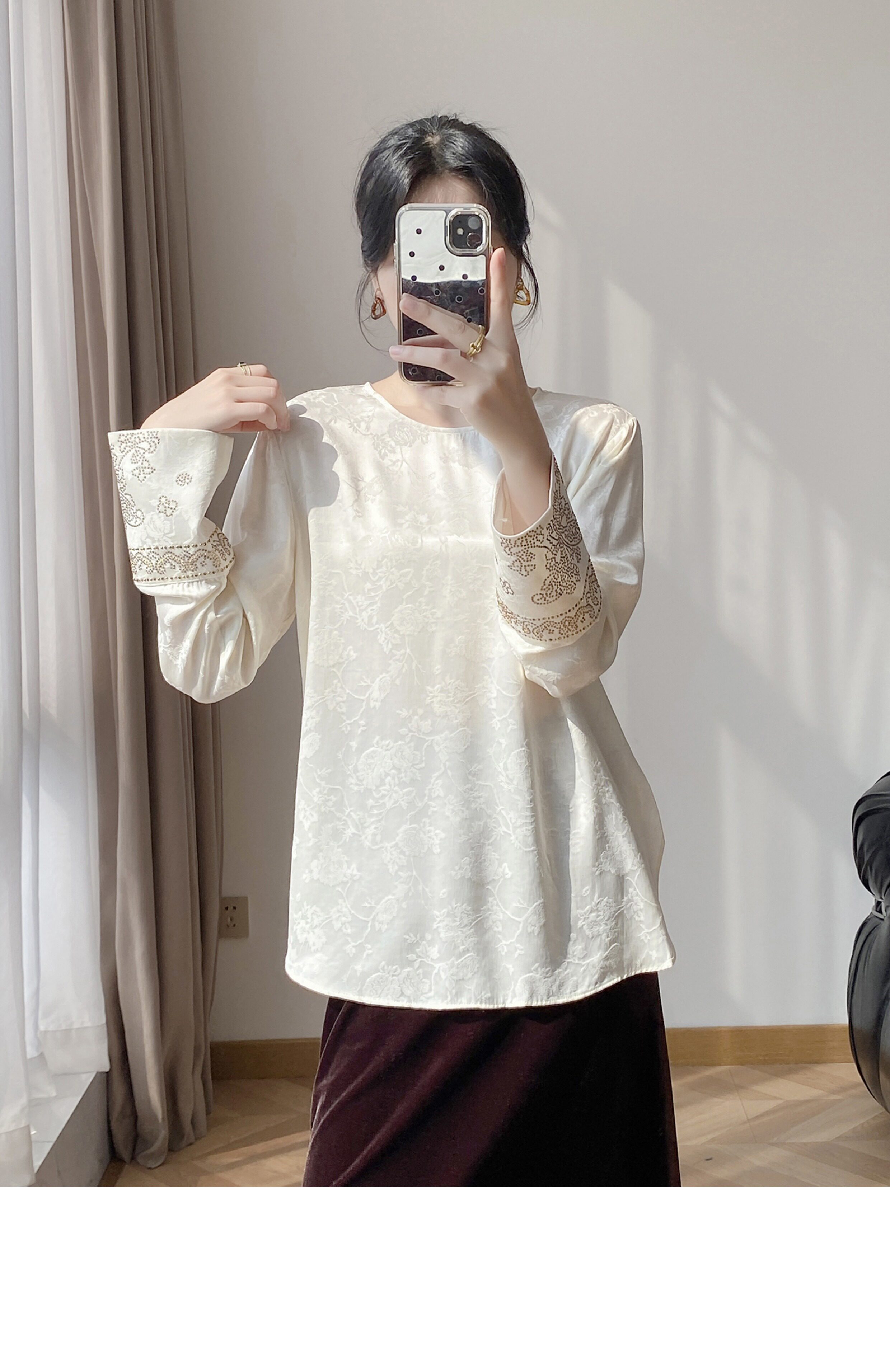 New Chinese Style Light Luxury Off-White Top for Women, Autumn and Winter, Copper Ammonia Silk, Loose Fit, Slimming, Rhinestone Pullover Shirt