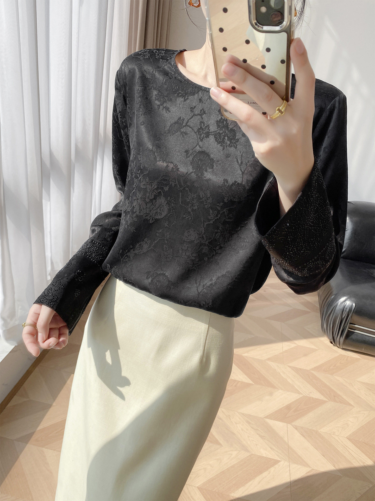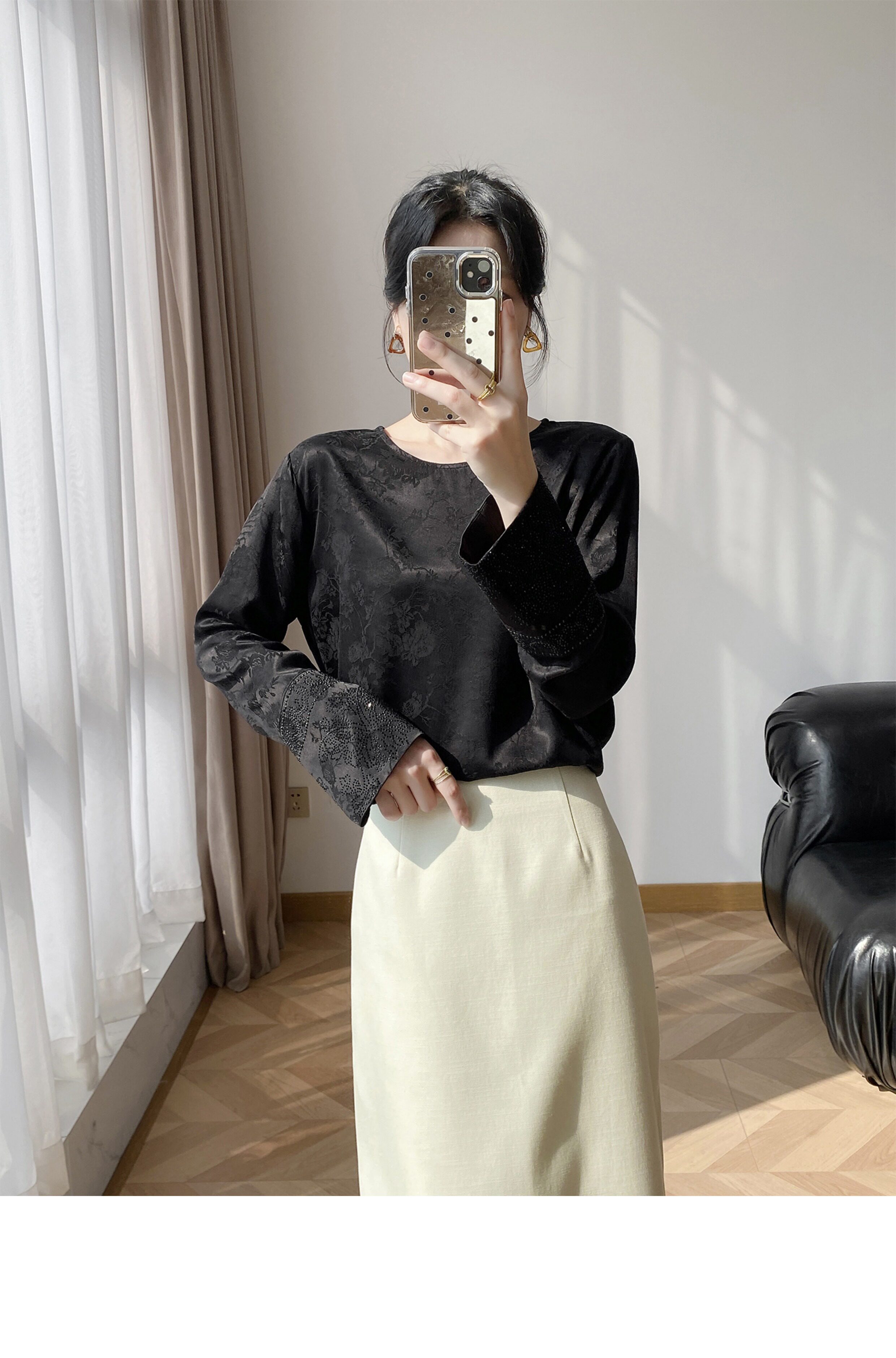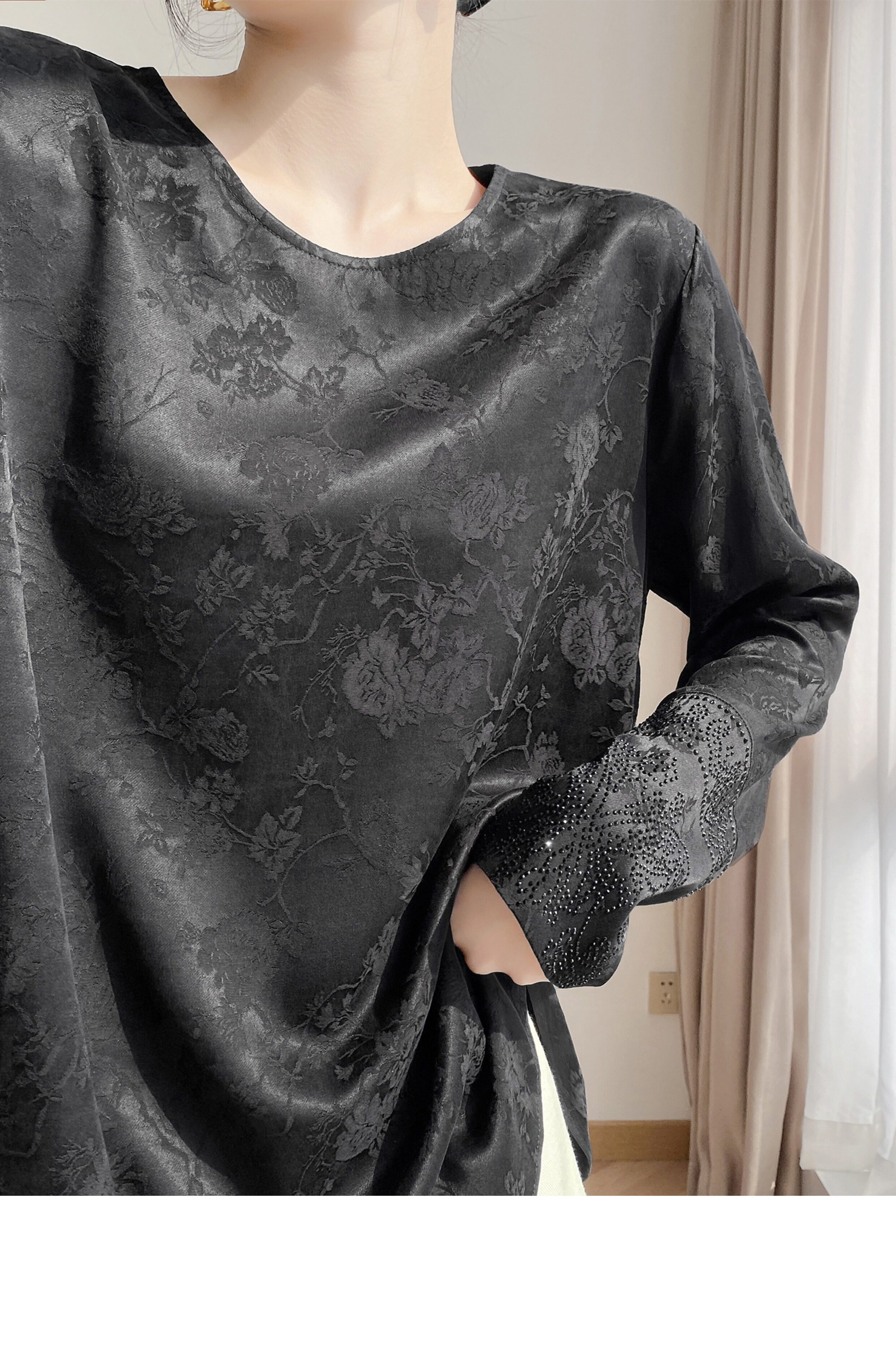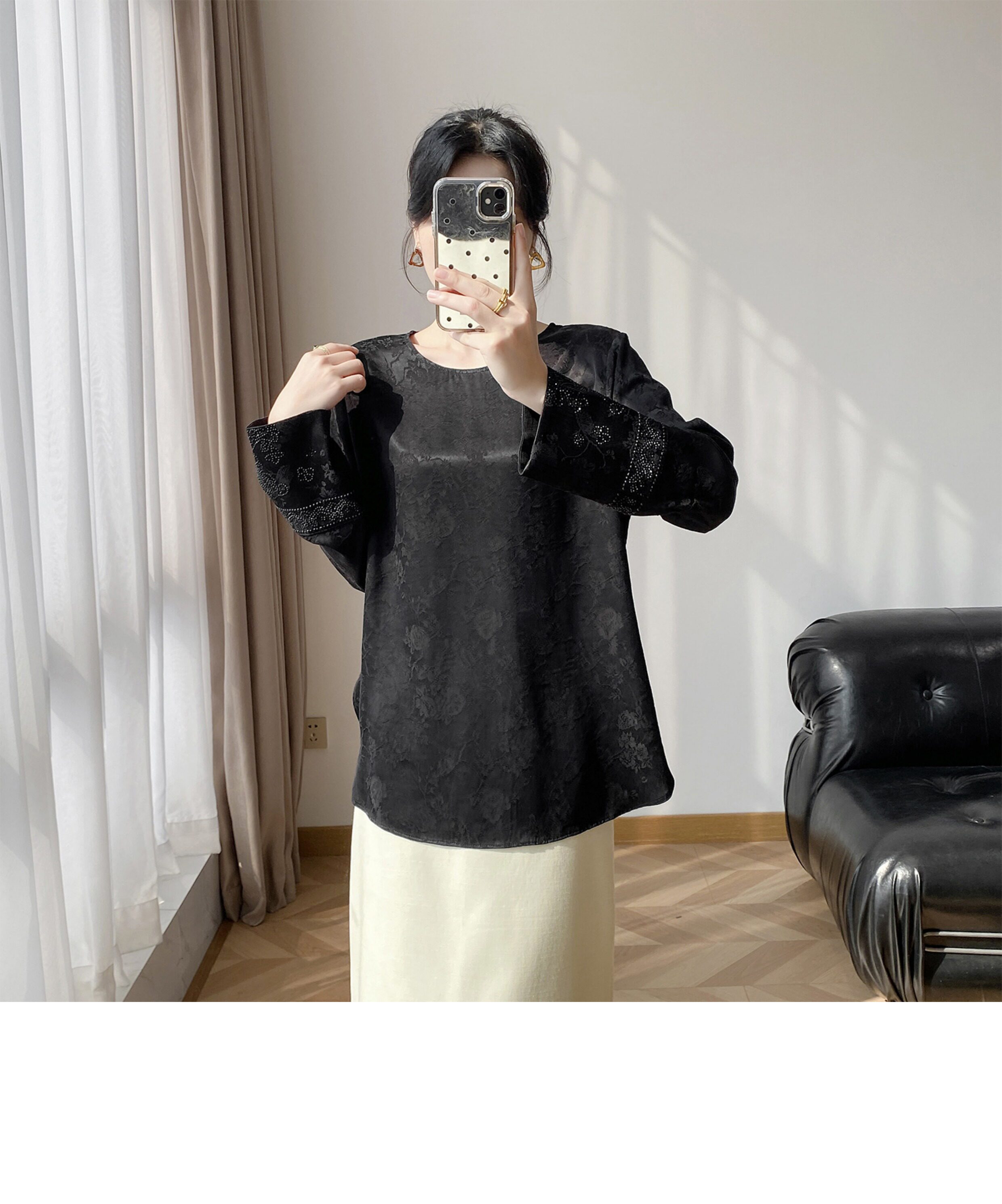 New Chinese Style Light Luxury Off-White Top for Women, Autumn and Winter, Copper Ammonia Silk, Loose Fit, Slimming, Rhinestone Pullover Shirt