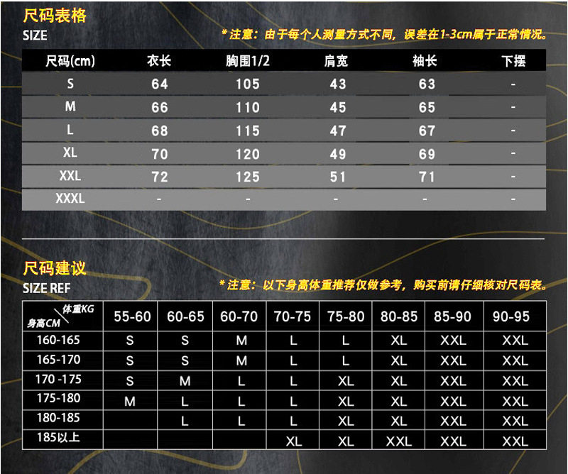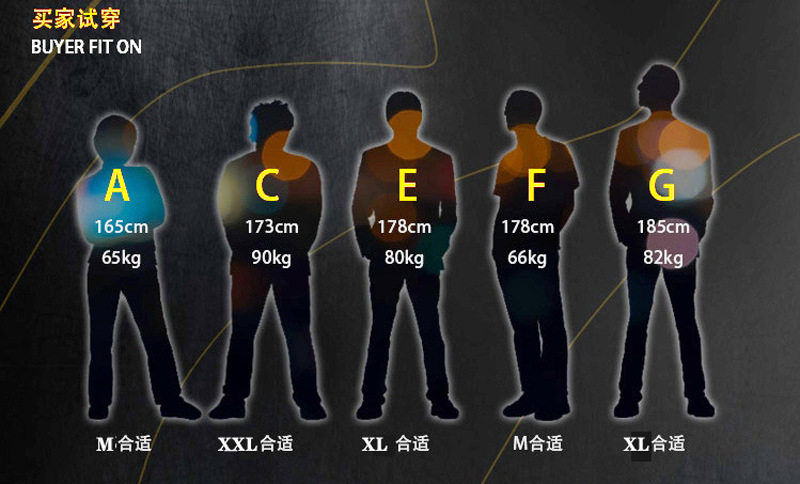 China (cm) 165 / 88-90 170 / 96-98 175 / 108-110 180 / 118-122 185 / 126-130