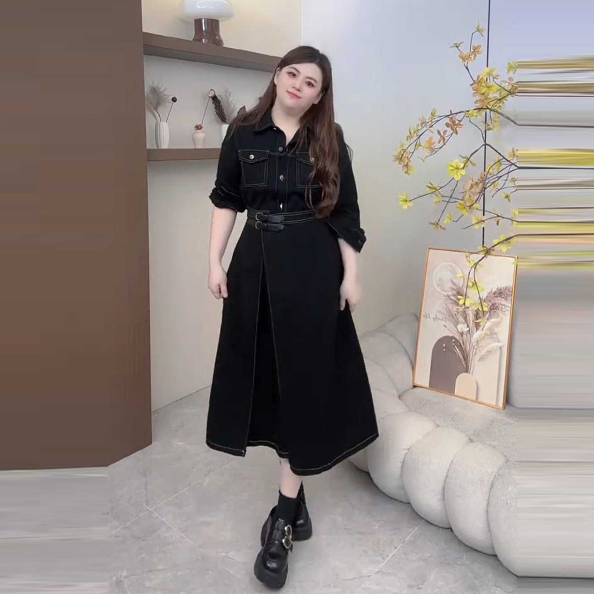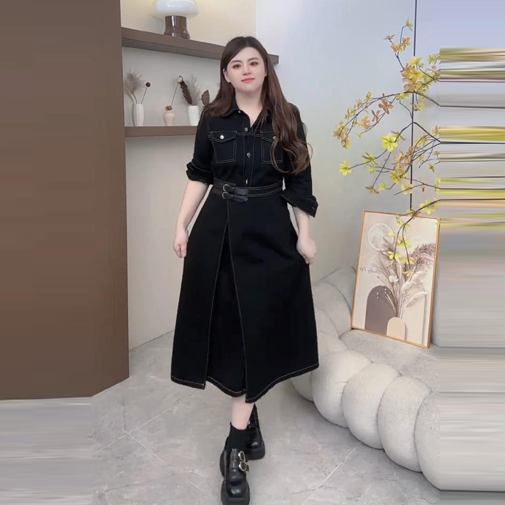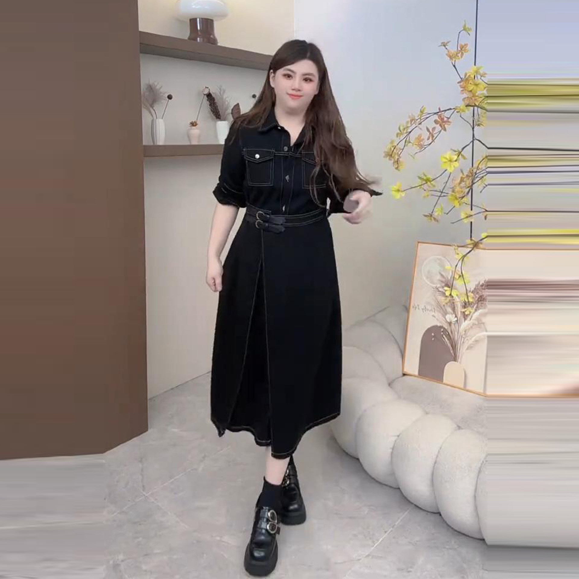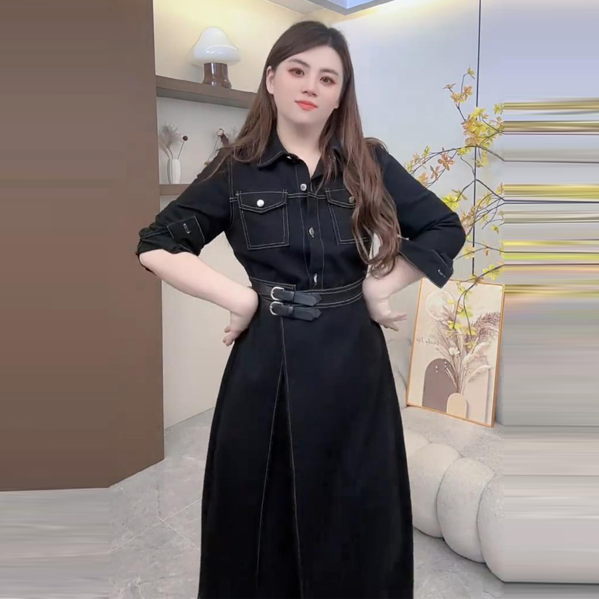 Plus-Size Denim Dress with a Turn-Down Collar for Women, Autumn and Winter, Waist-Cinching, Slimming Design, Unique Style, Versatile Dress