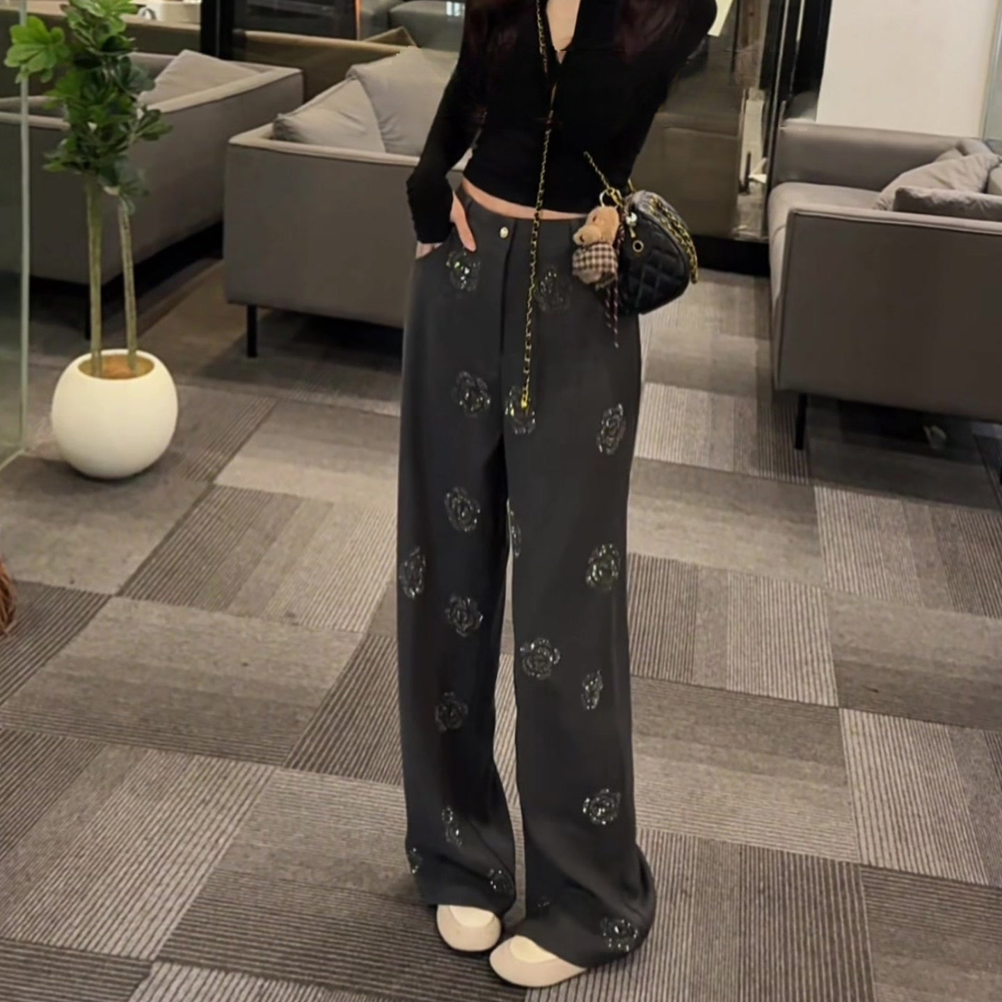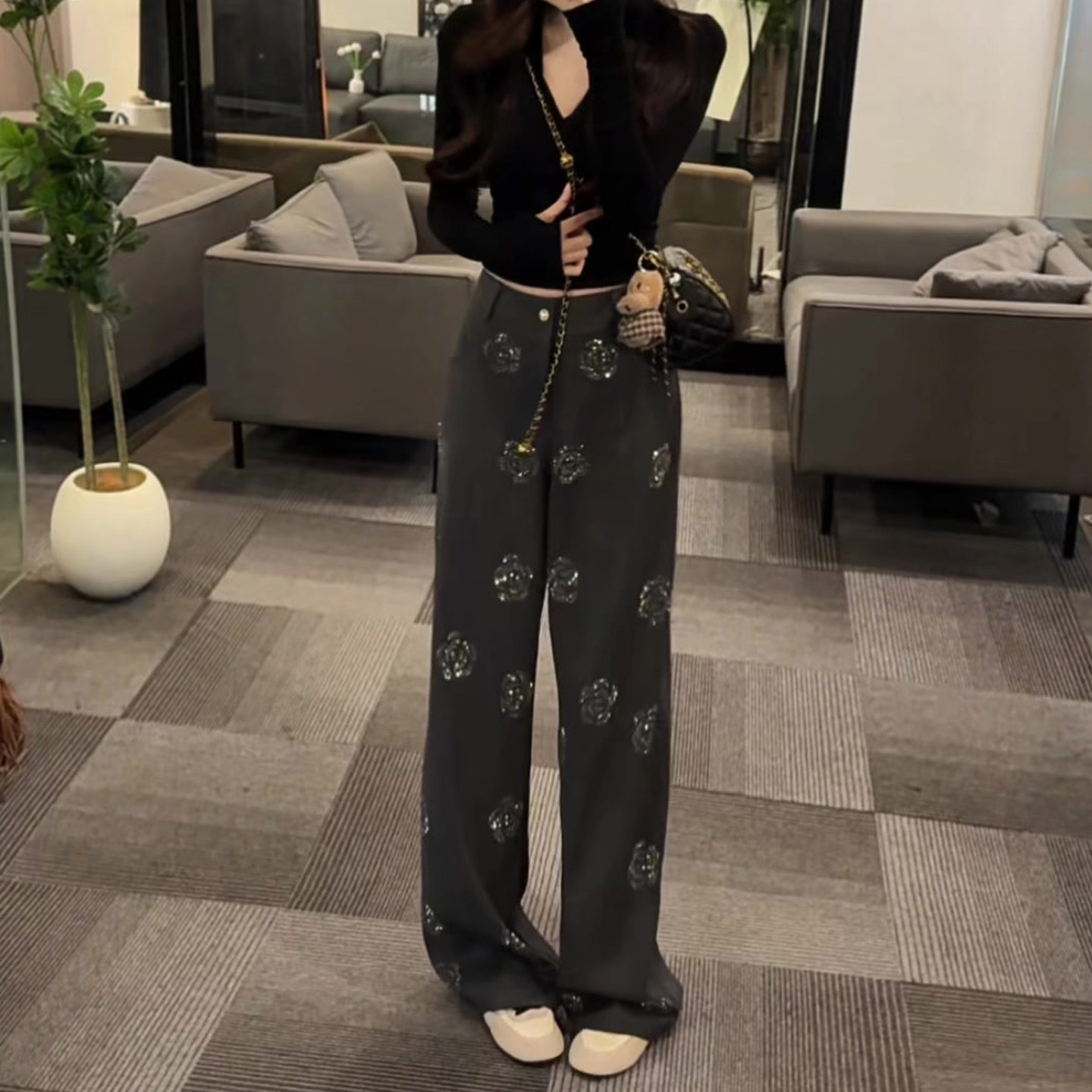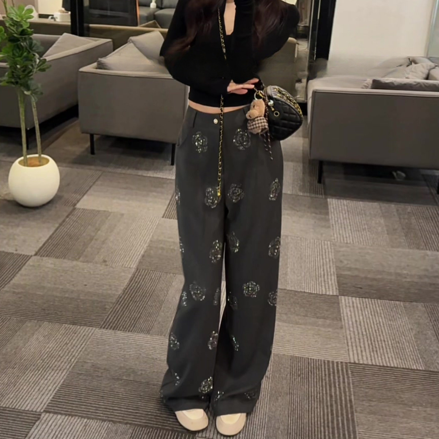 Gray sequined design wide-leg pants for women 2025 new autumn and winter pear-shaped figure covering the crotch and slimming straight casual pants