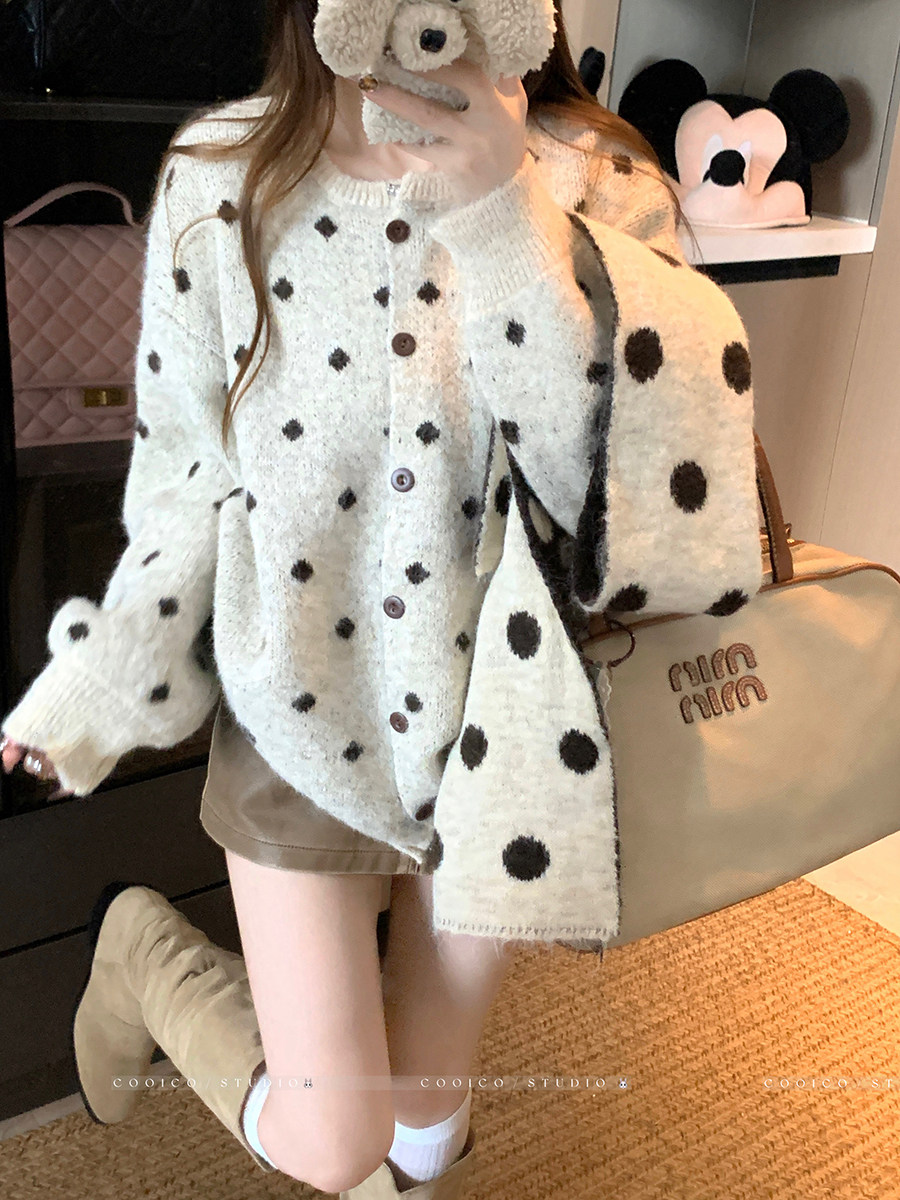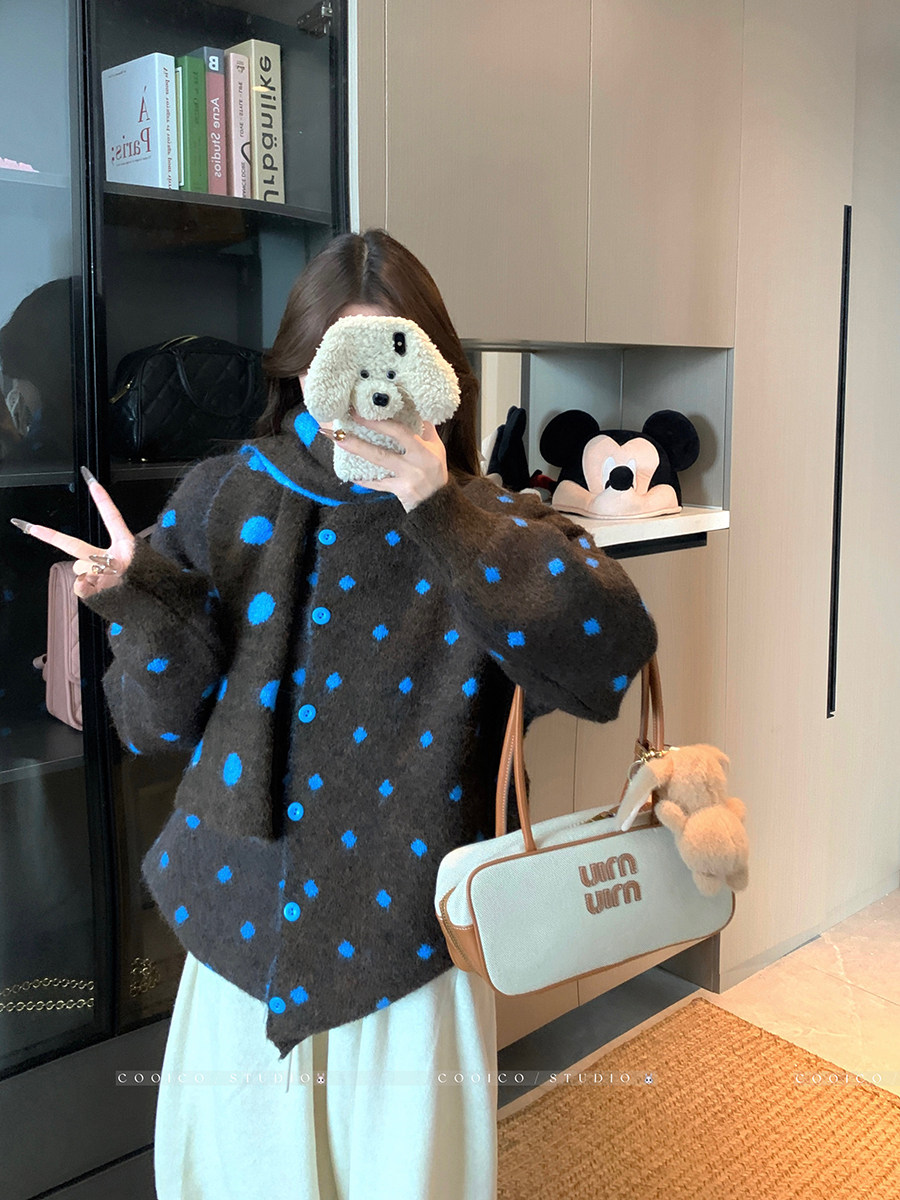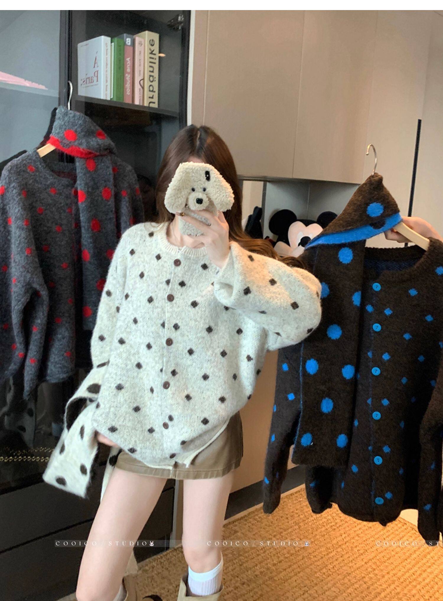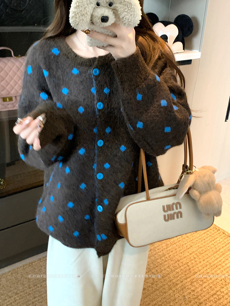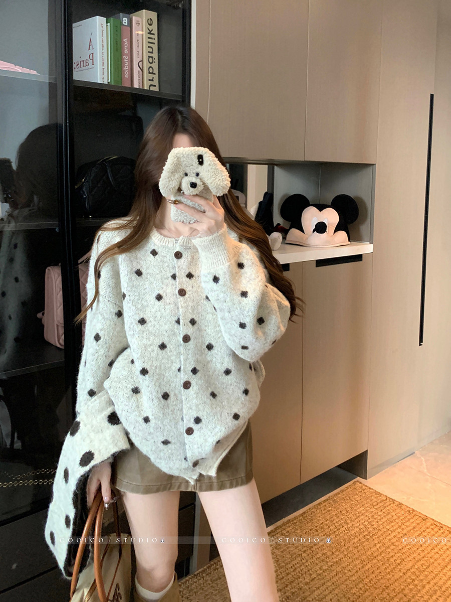 Retro temperament polka dot sweater women's autumn new Korean style fat girl slimming versatile knitted cardigan top jacket