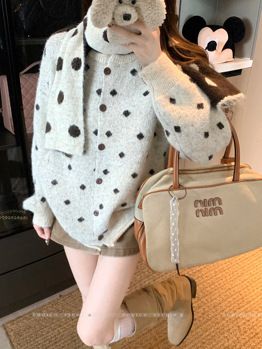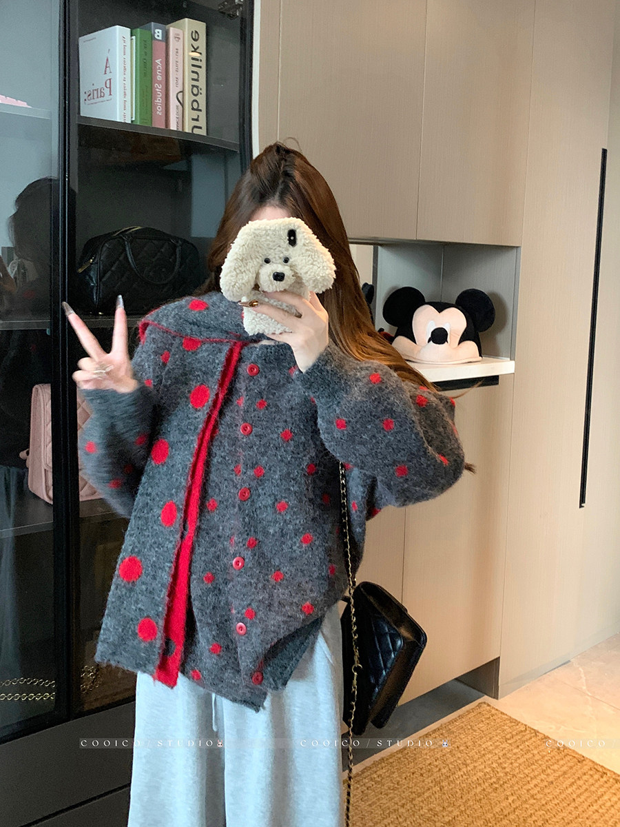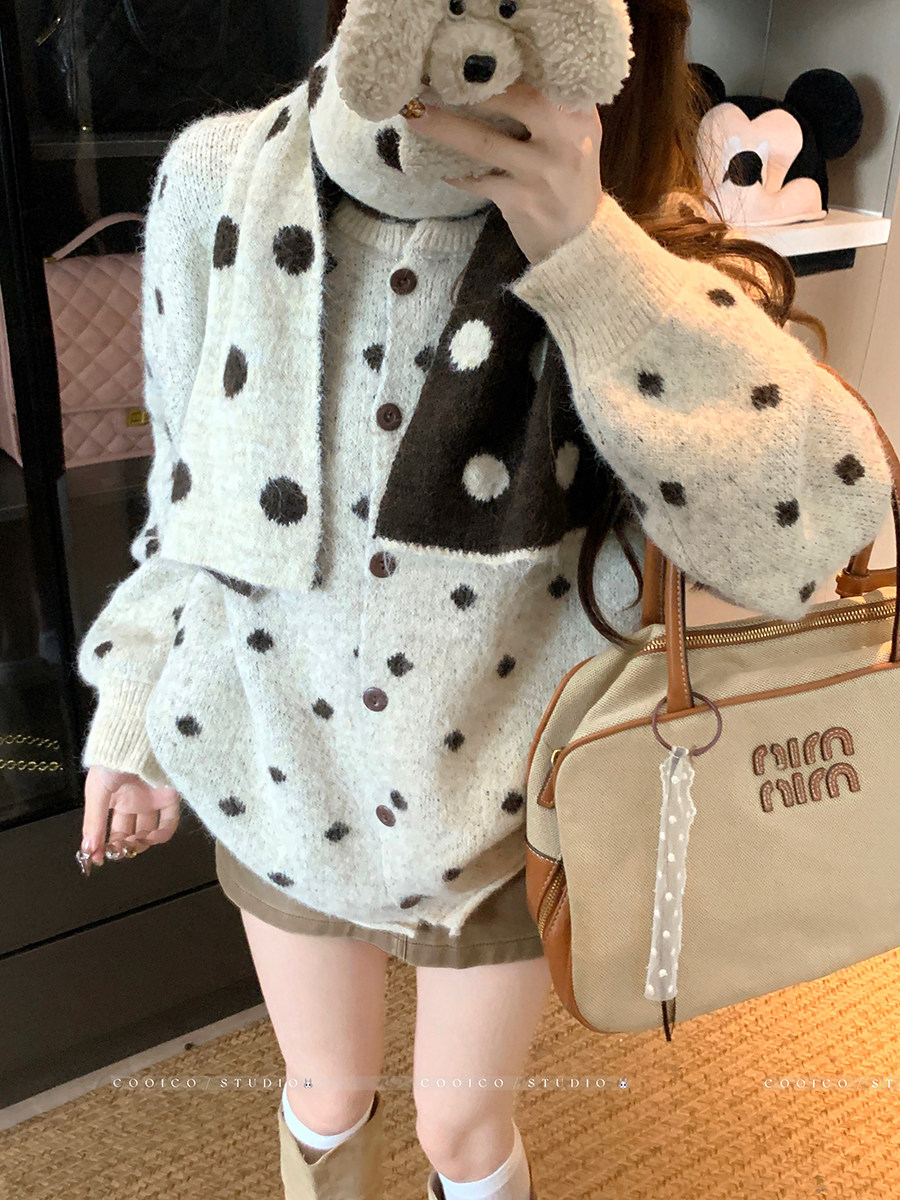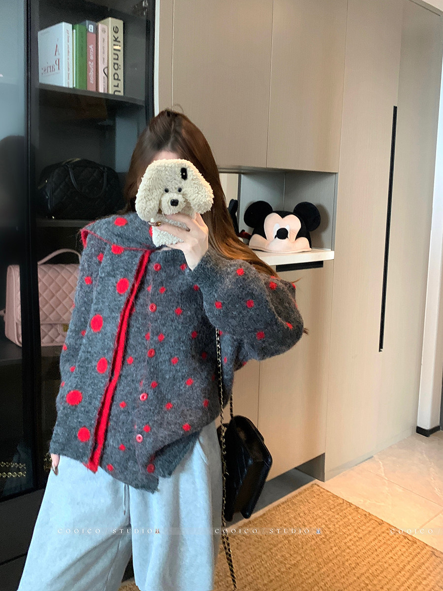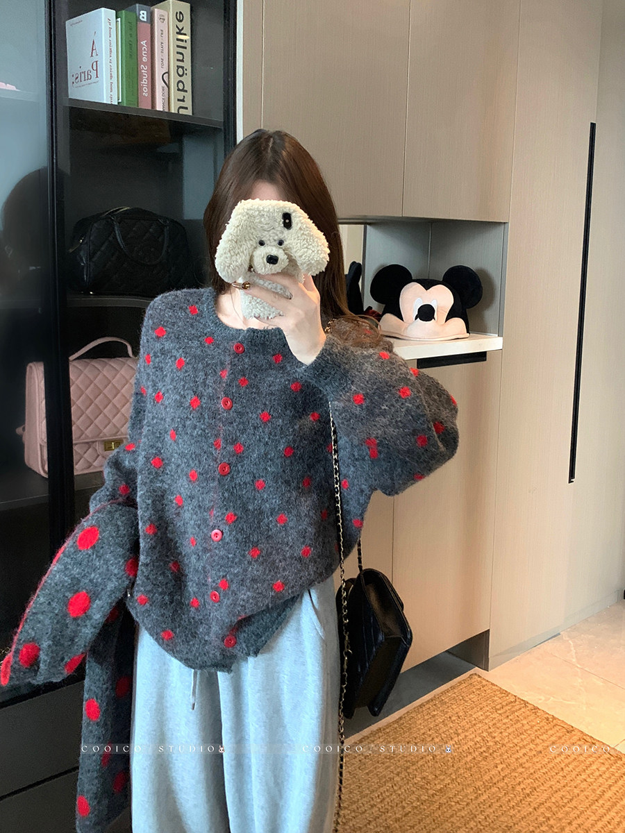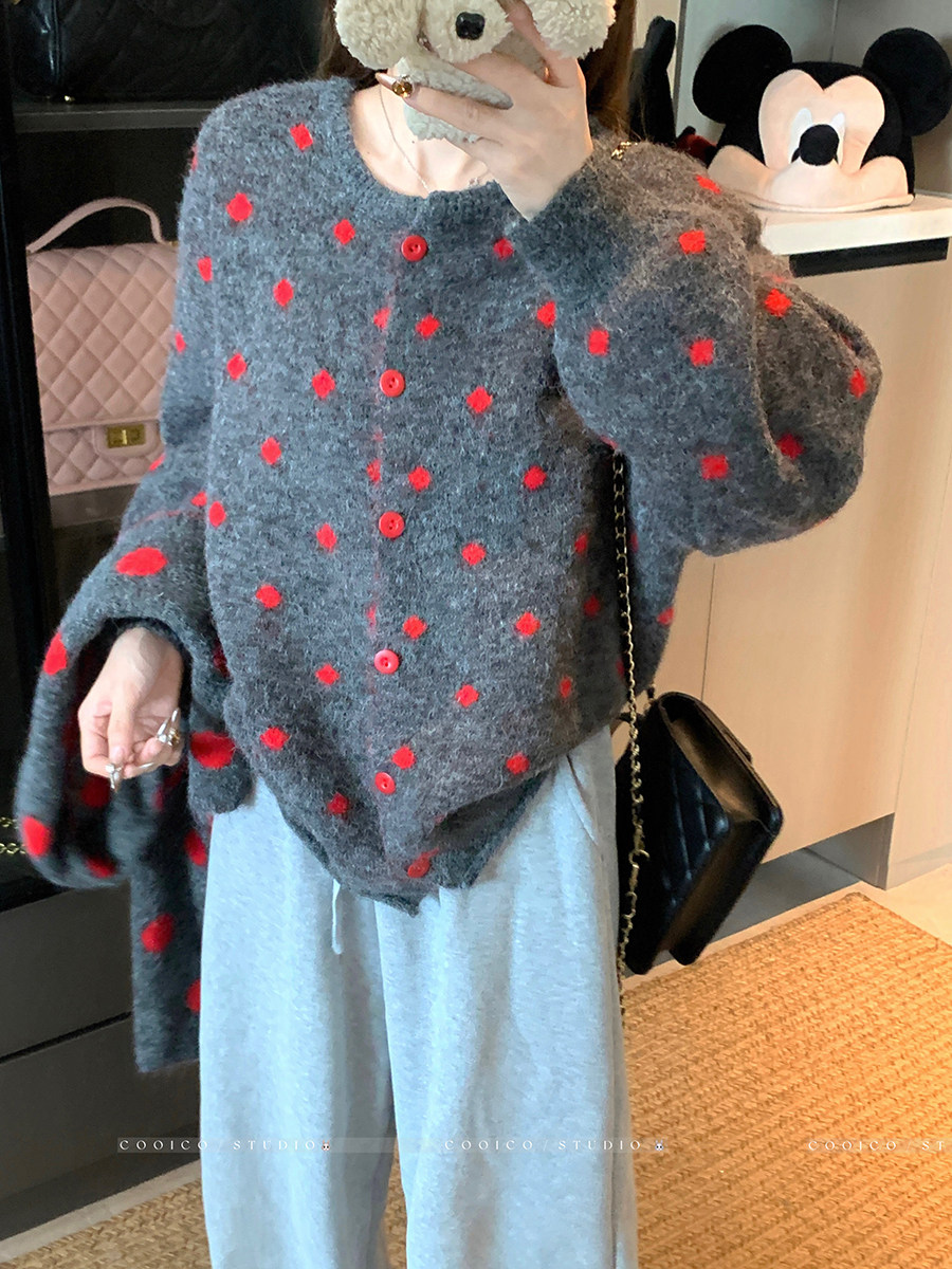 Retro temperament polka dot sweater women's autumn new Korean style fat girl slimming versatile knitted cardigan top jacket