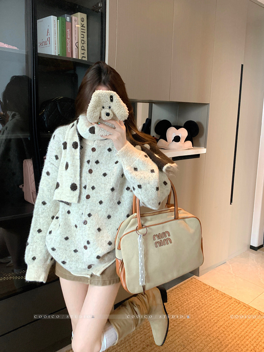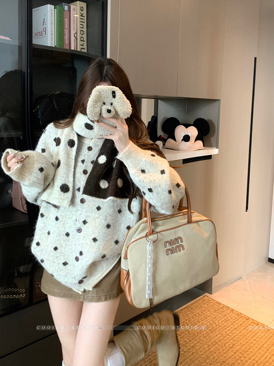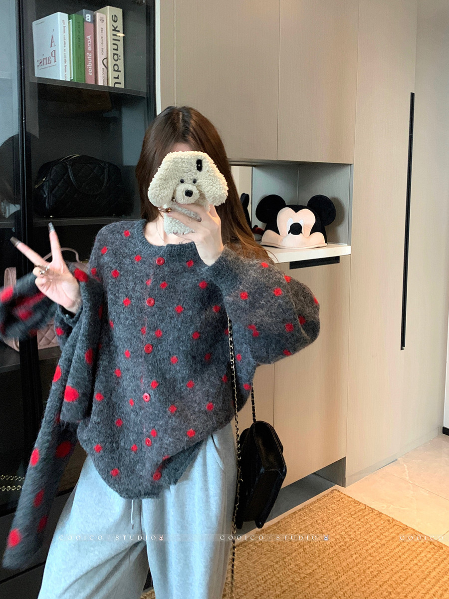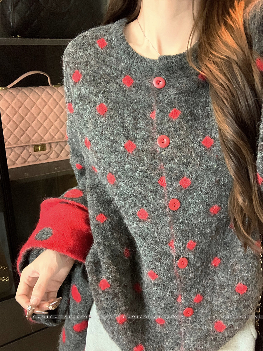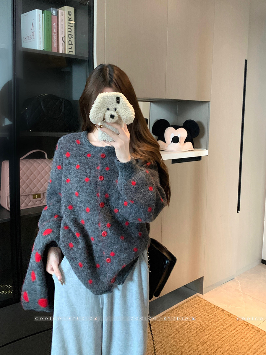 Retro temperament polka dot sweater women's autumn new Korean style fat girl slimming versatile knitted cardigan top jacket
