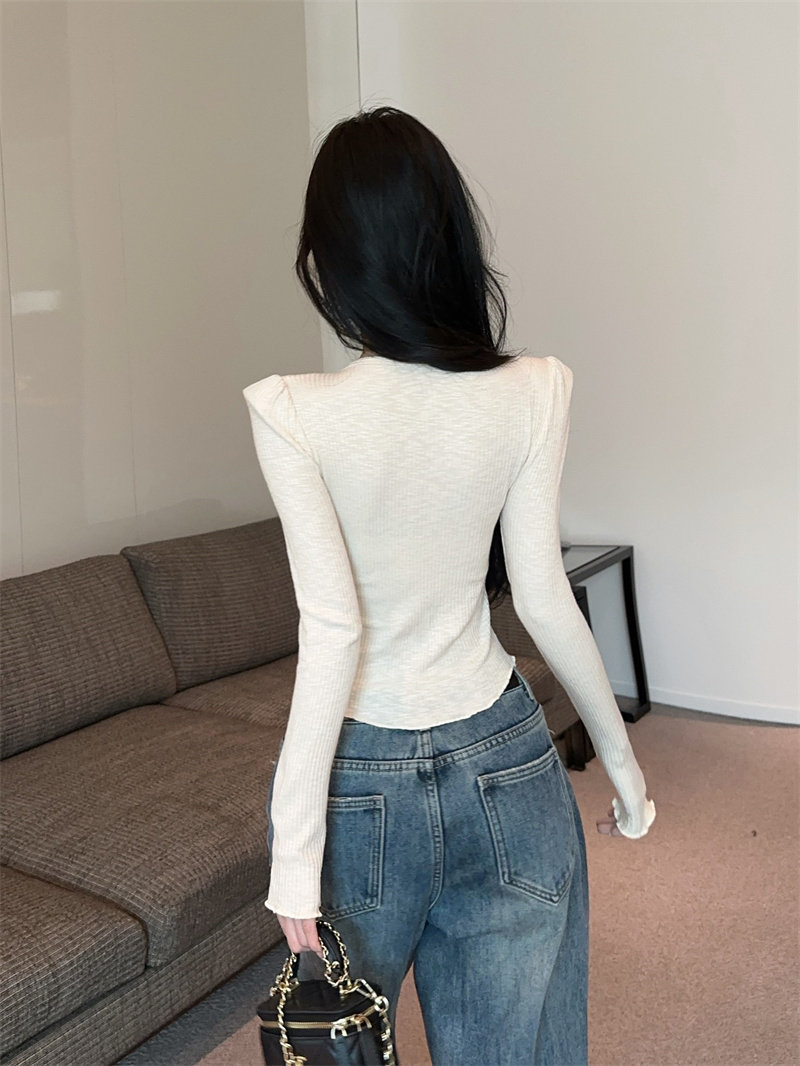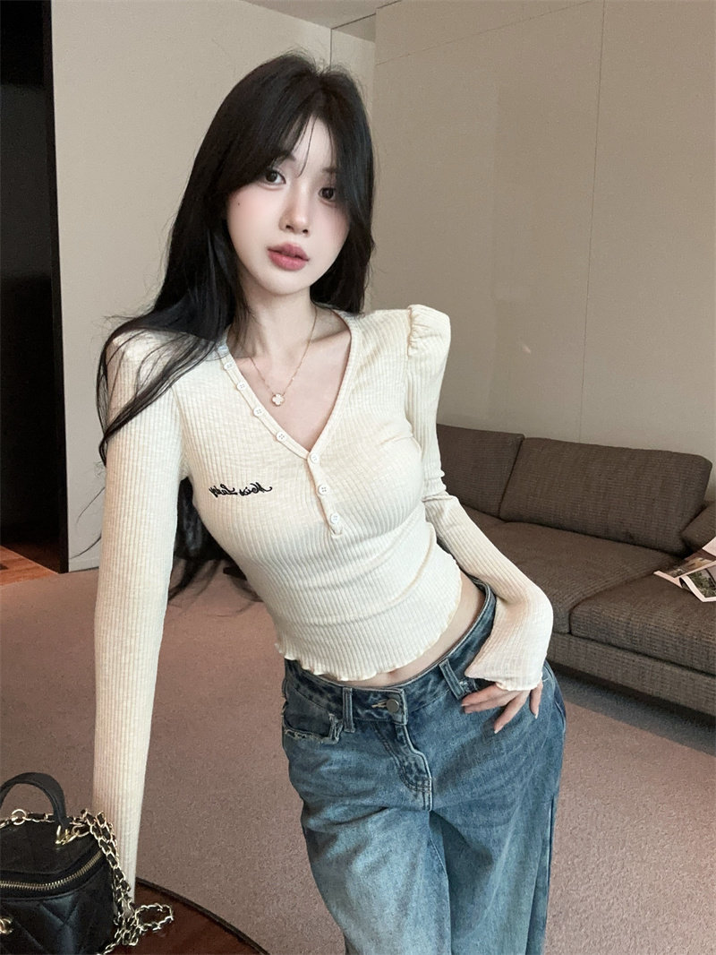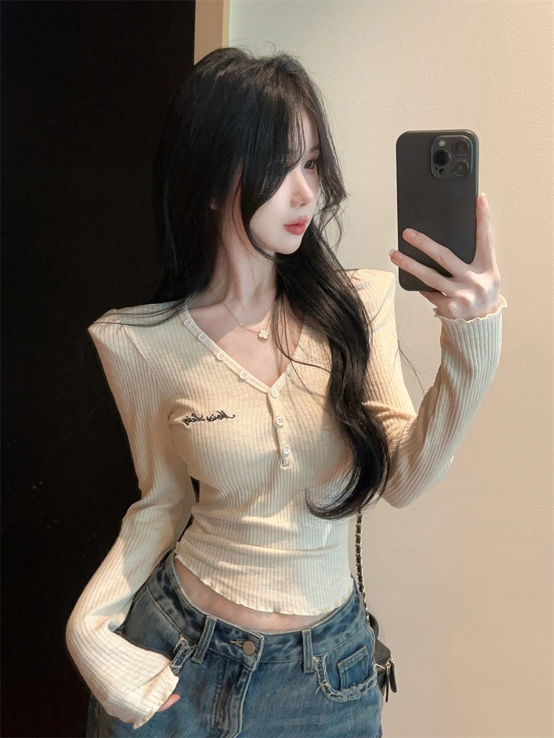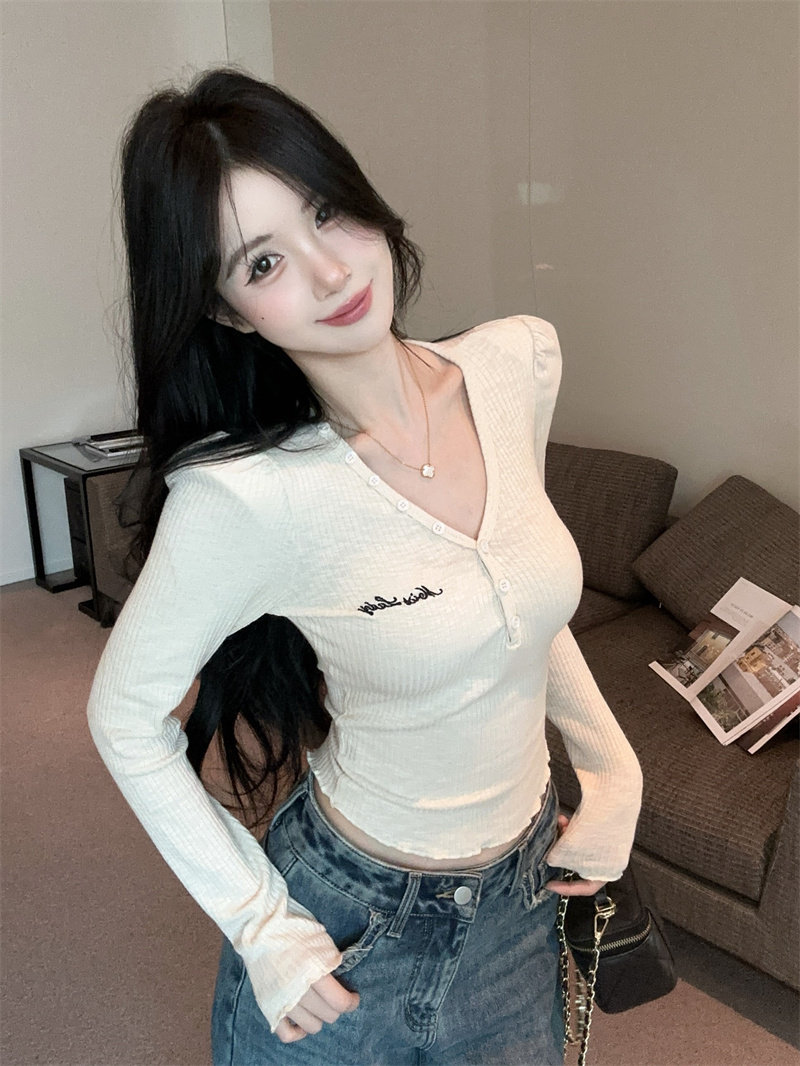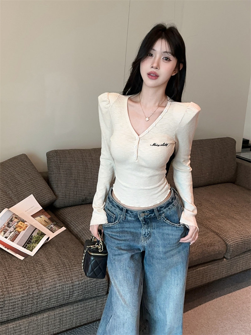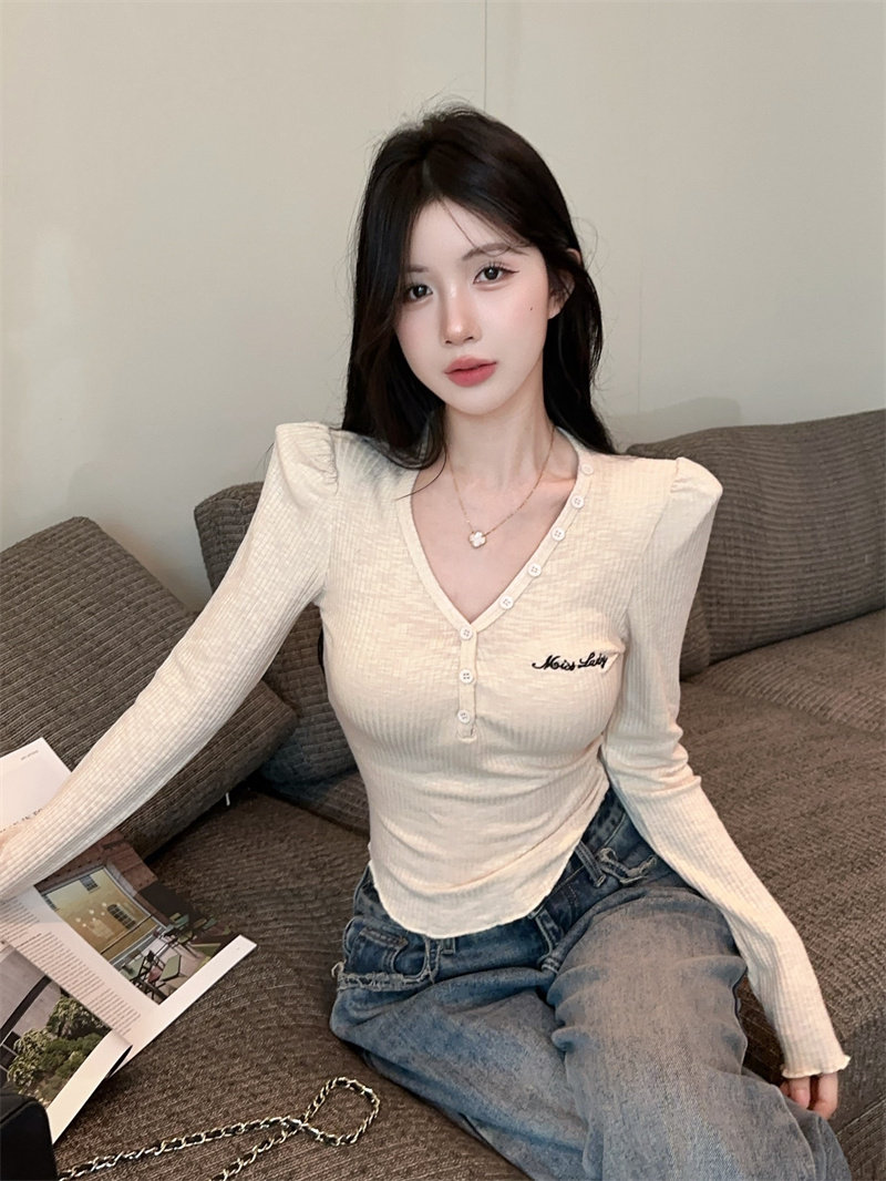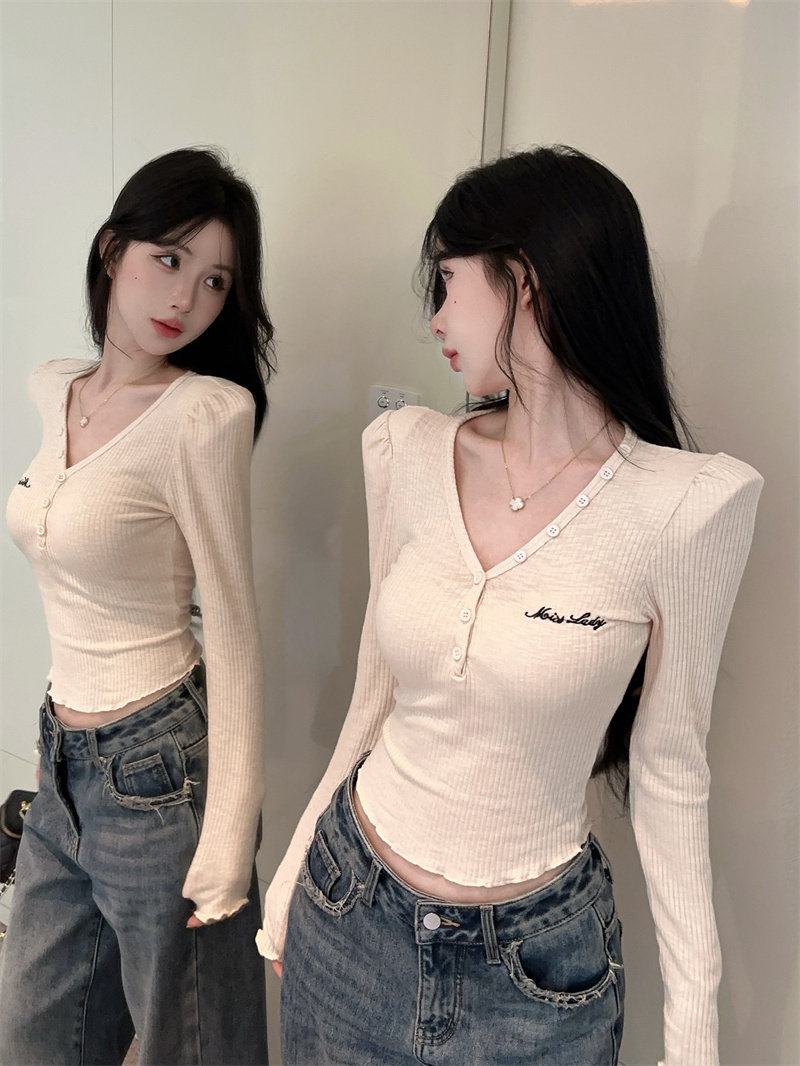 Embroidered Letter V-Neck Padded Shoulder Long-Sleeve T-Shirt for Women, Slim Fit, New Spring Style, Sexy Tight-Fitting Short Base Shirt