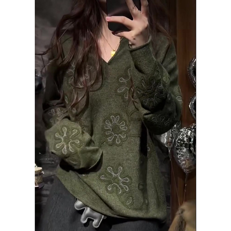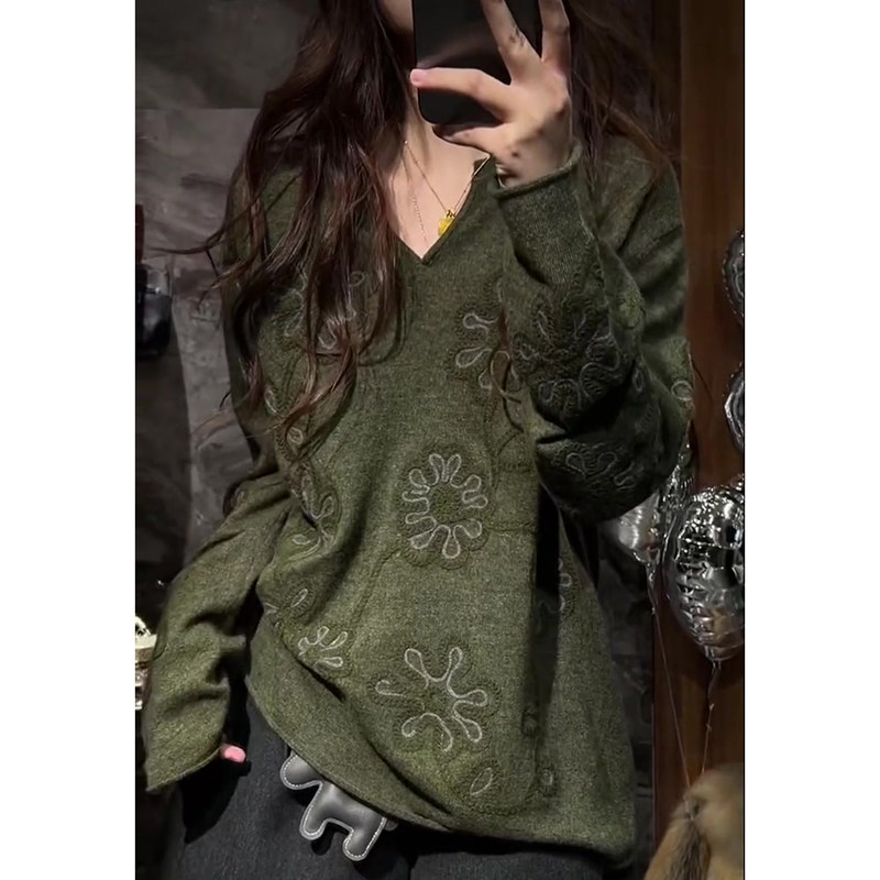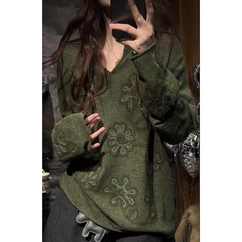 European high-end light luxury green V-neck embroidered long-sleeved sweater for women in autumn and winter, age-reducing loose and lazy knitted top