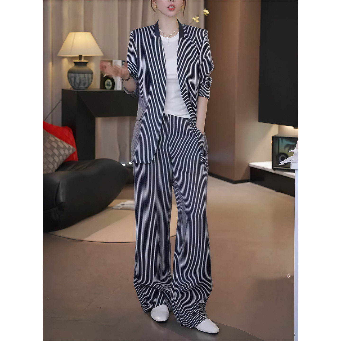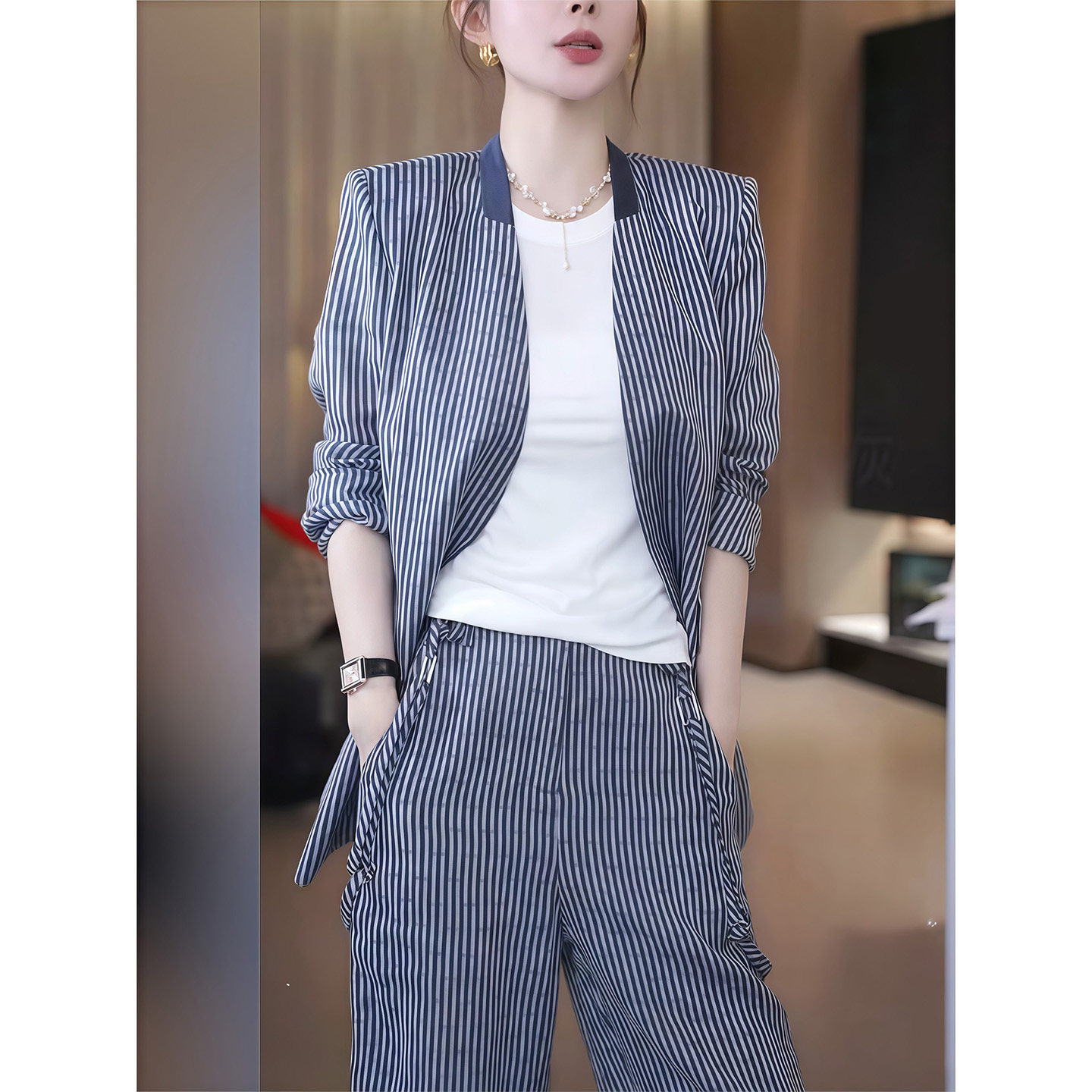 High-end fashionable casual suit for women spring 2026 new striped contrasting color professional suit jacket two-piece trendy set