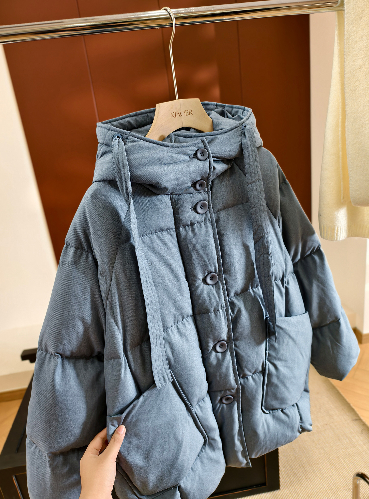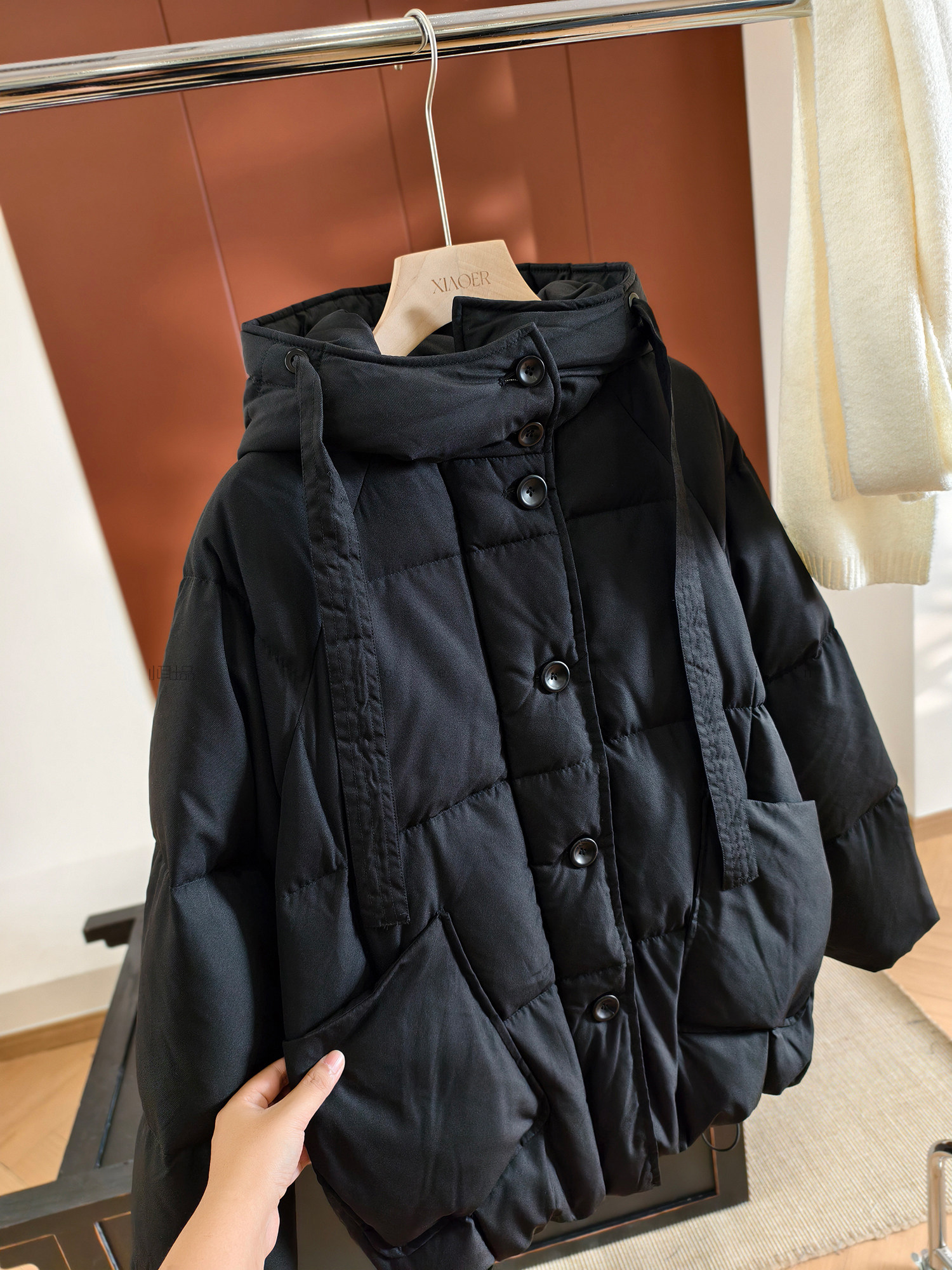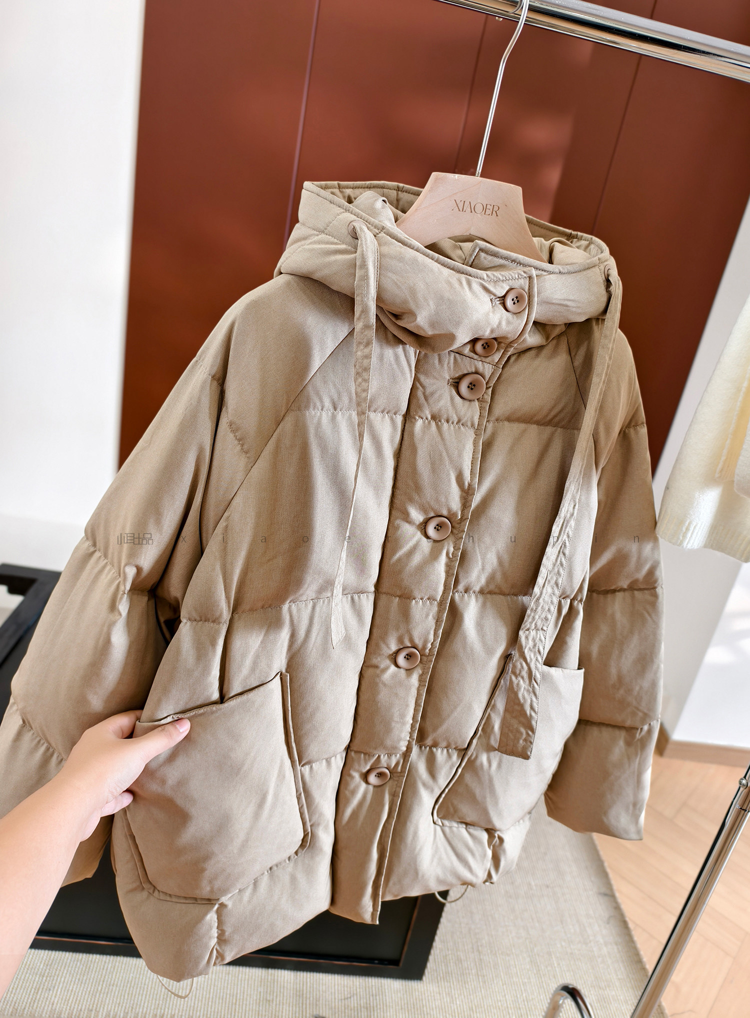 Produced by Xiaoer, thickened cotton-feel windproof fabric/90 white duck down/raglan sleeves, hooded drawstring down jacket with large pockets