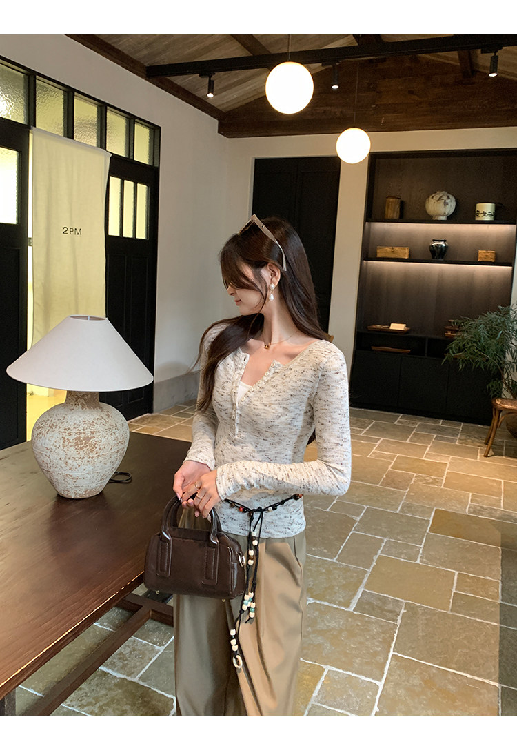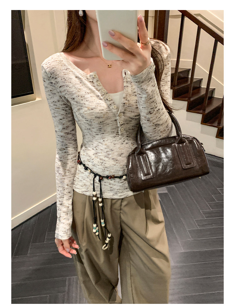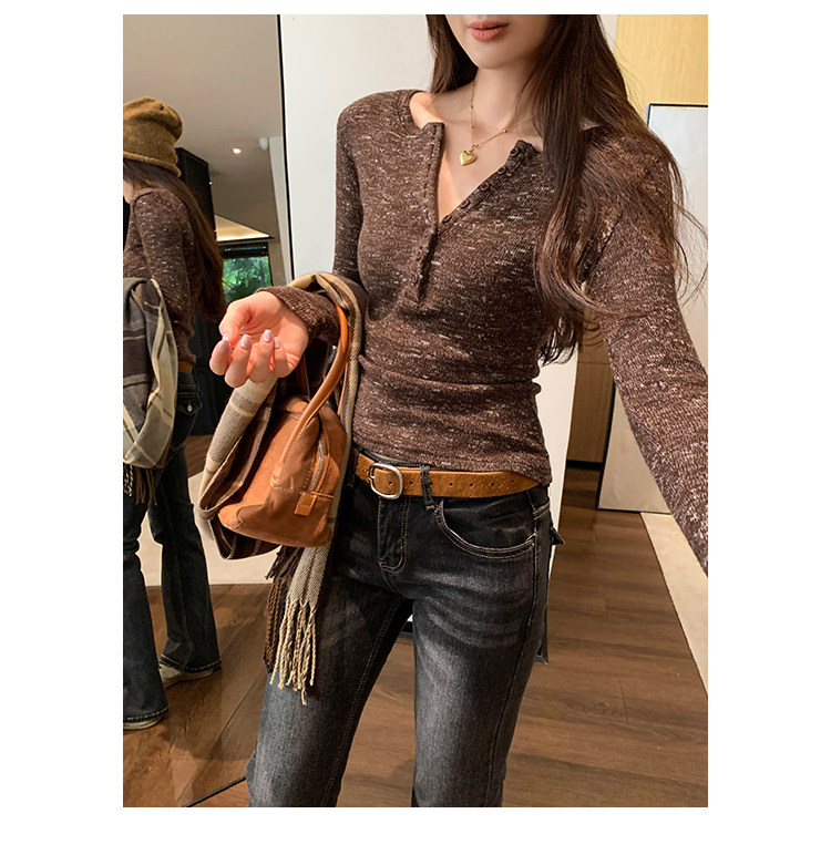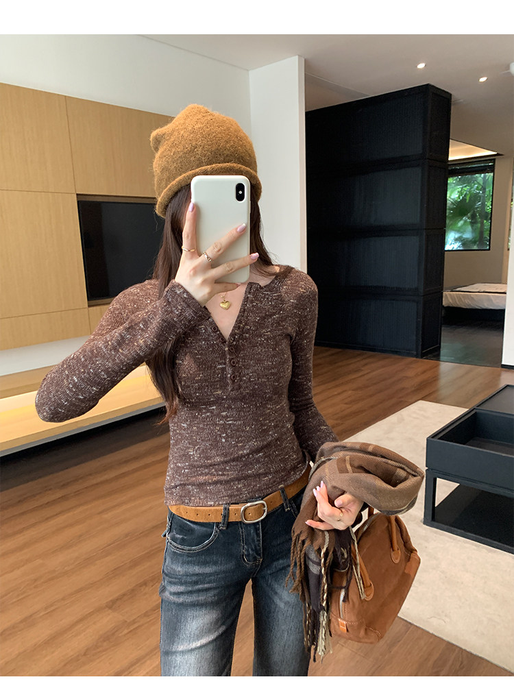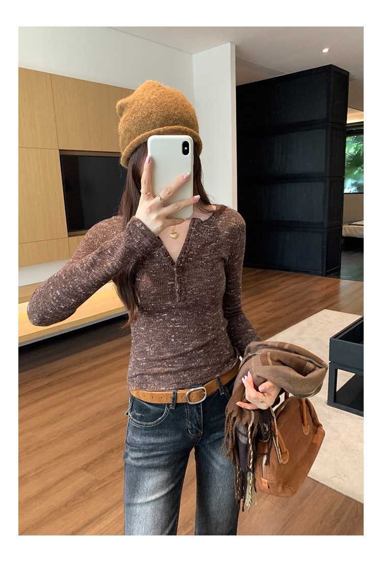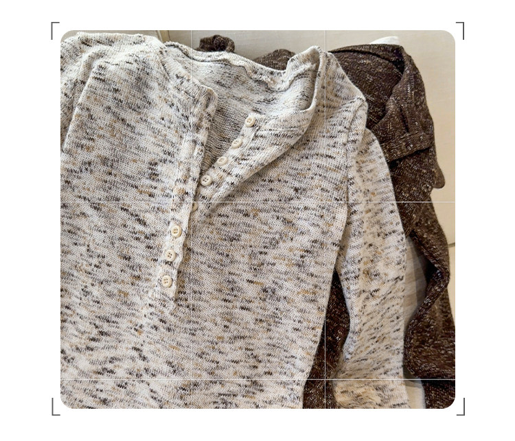 Mixed-Color Henry Collar Floral Yarn Long-Sleeve Knit Top for Women, Autumn and Winter, Light and Mature, Niche Soft and Cozy Style, Half-Open V-Neck Inner Wear