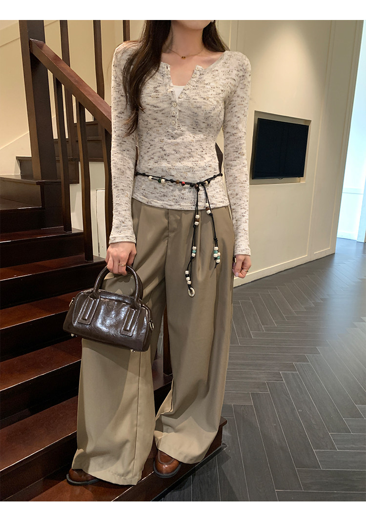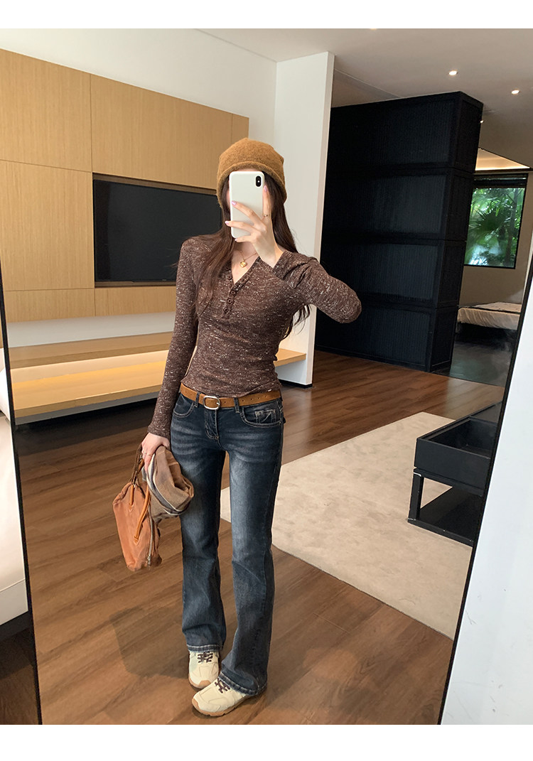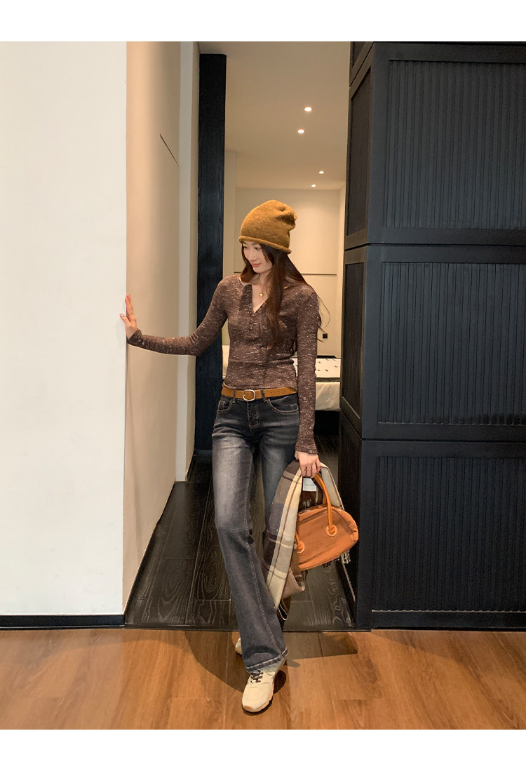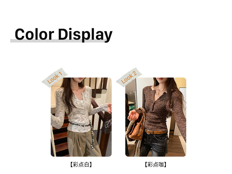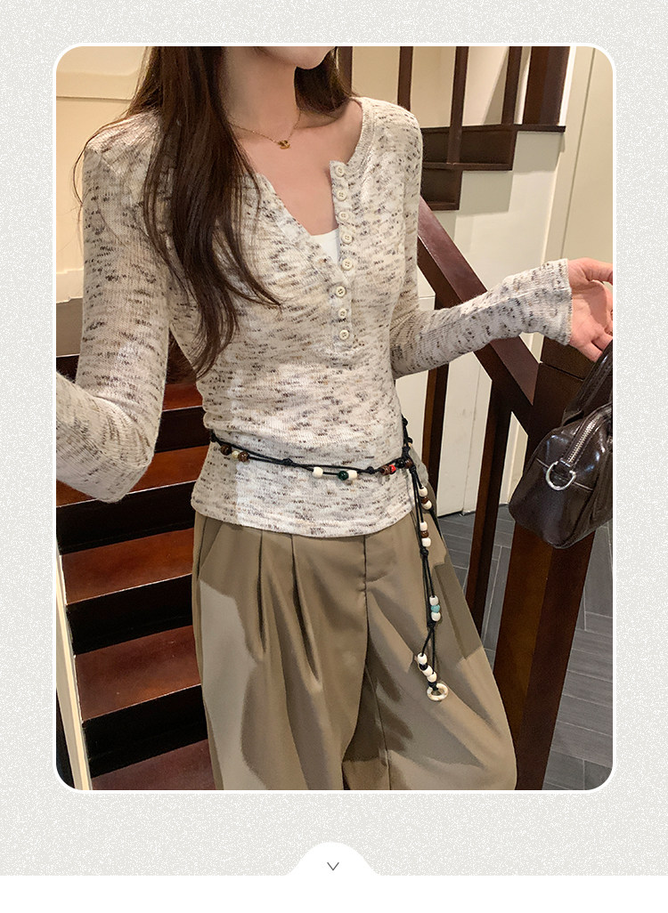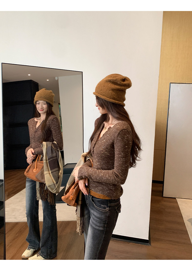 Mixed-Color Henry Collar Floral Yarn Long-Sleeve Knit Top for Women, Autumn and Winter, Light and Mature, Niche Soft and Cozy Style, Half-Open V-Neck Inner Wear