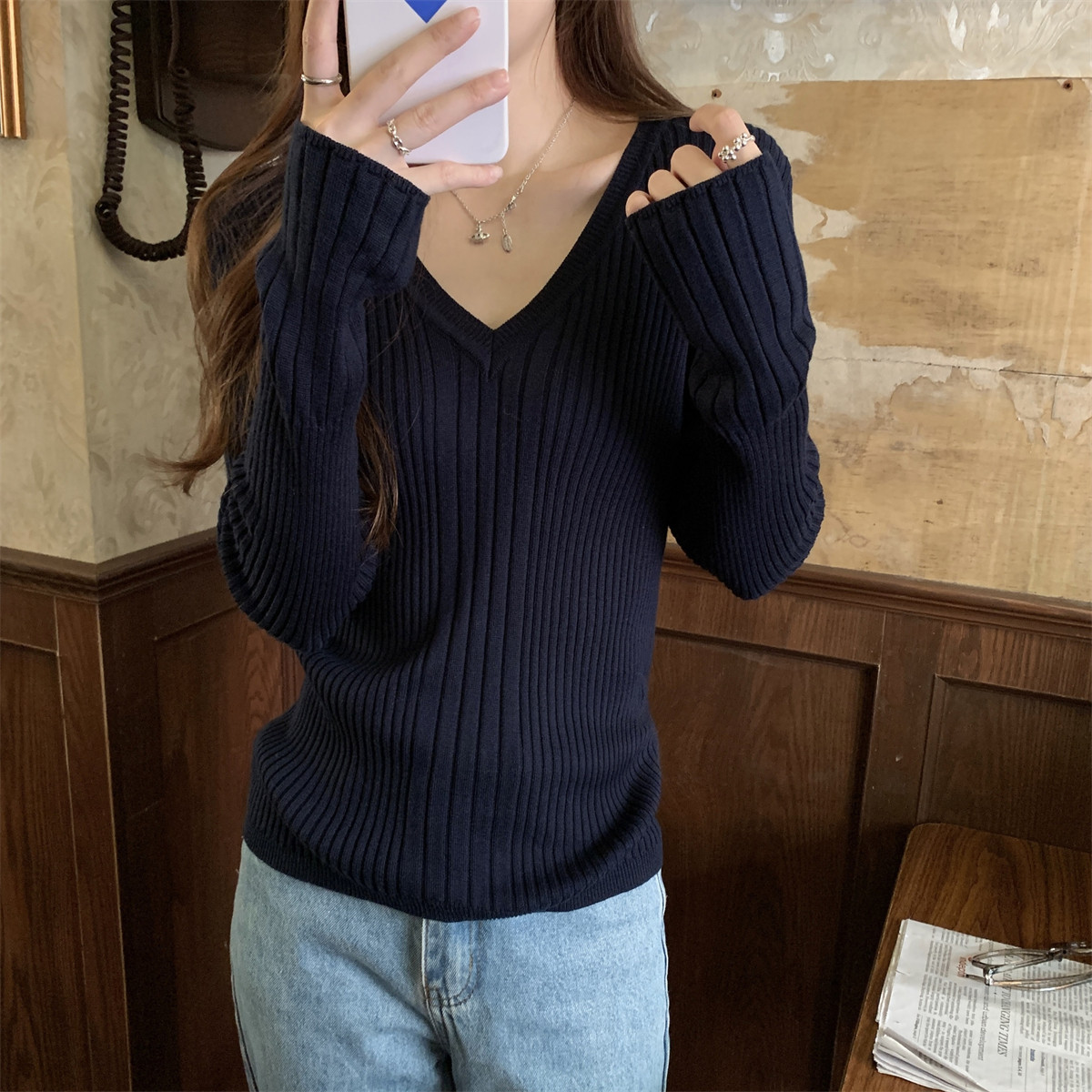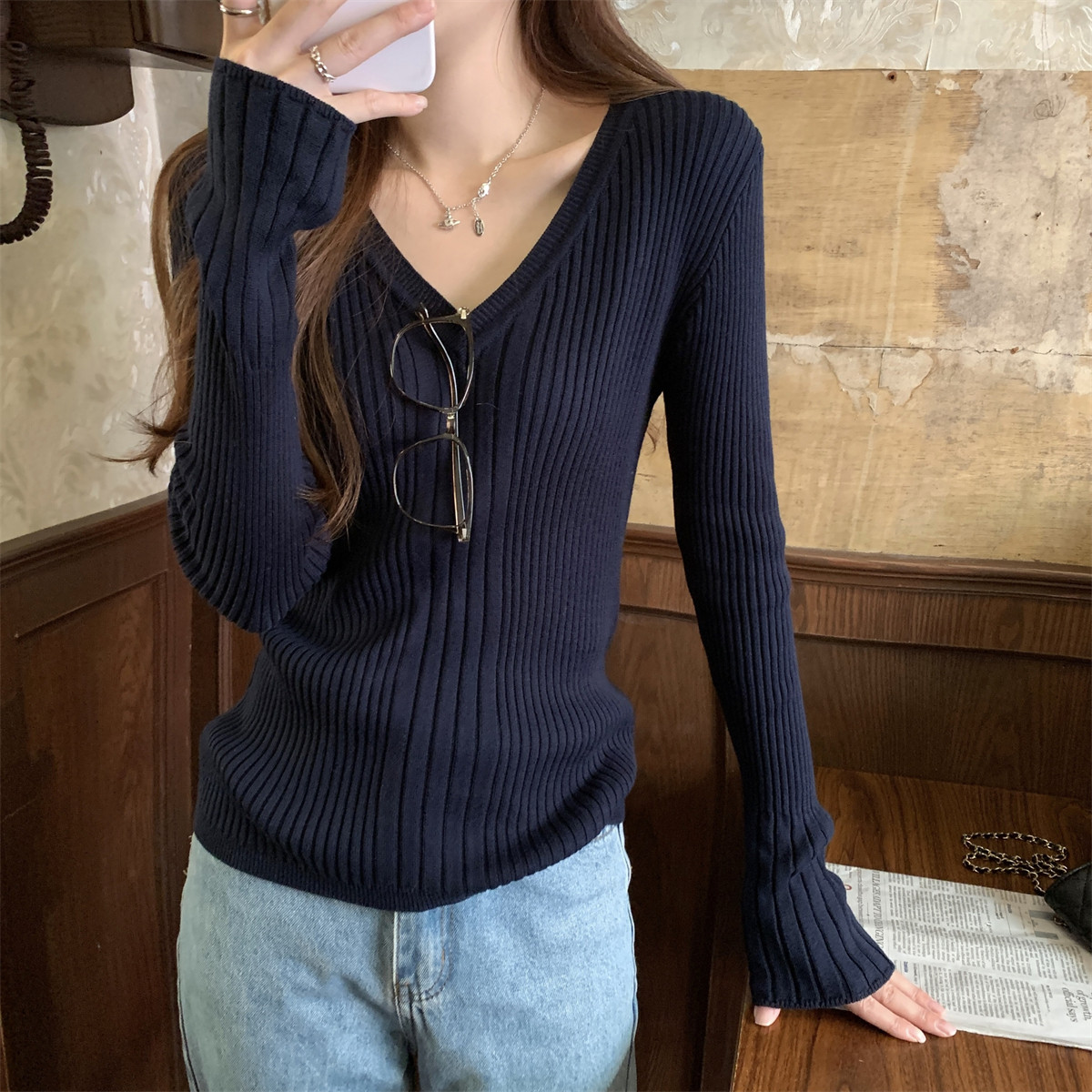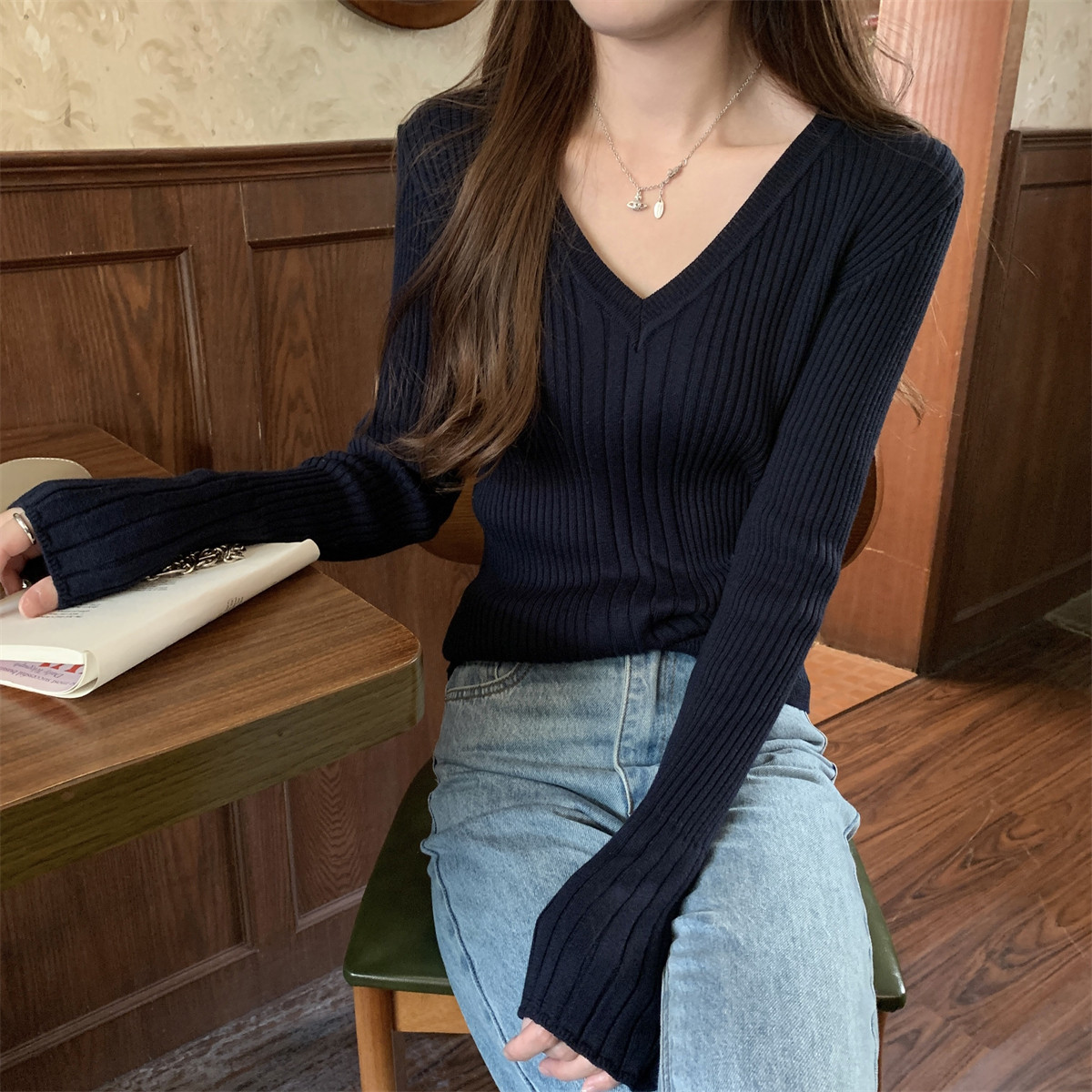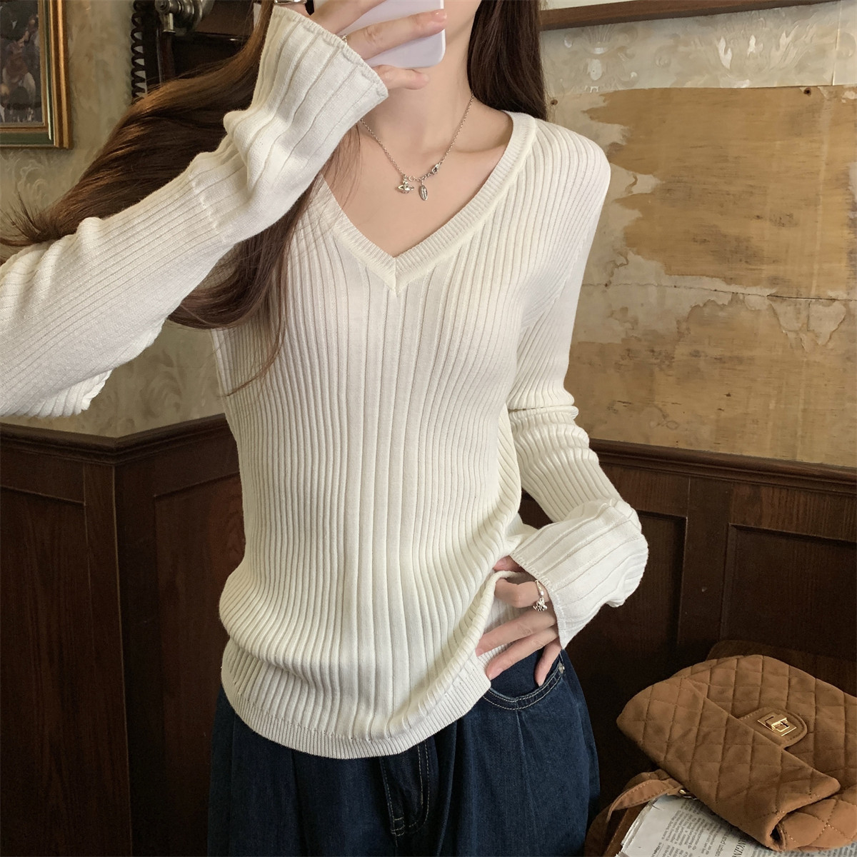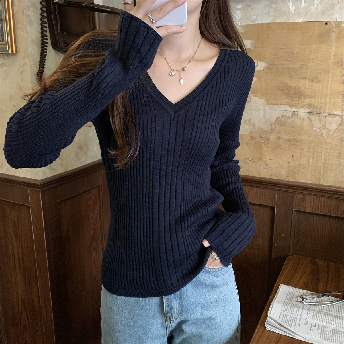 Korean Style Simple Solid Color Long-Sleeve T-Shirt Knitwear for Women 2026 Spring Versatile Elegant V-Neck Slim-Fit Base Shirt Top