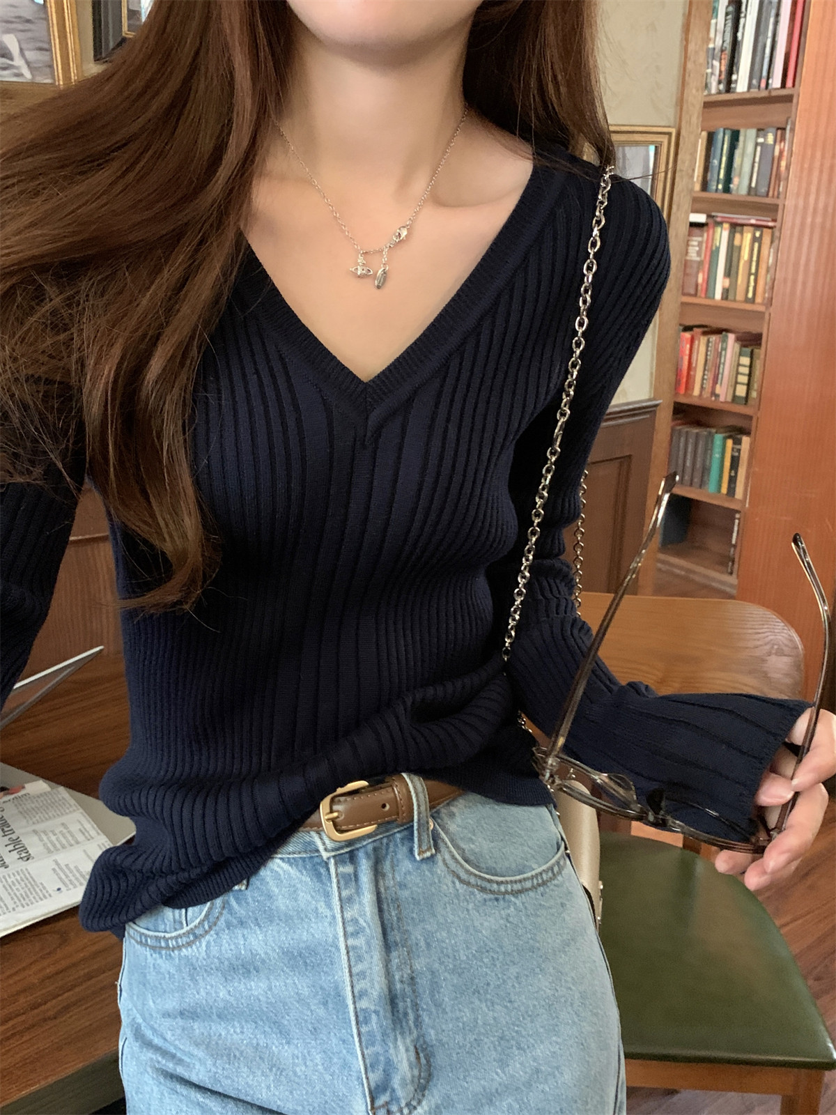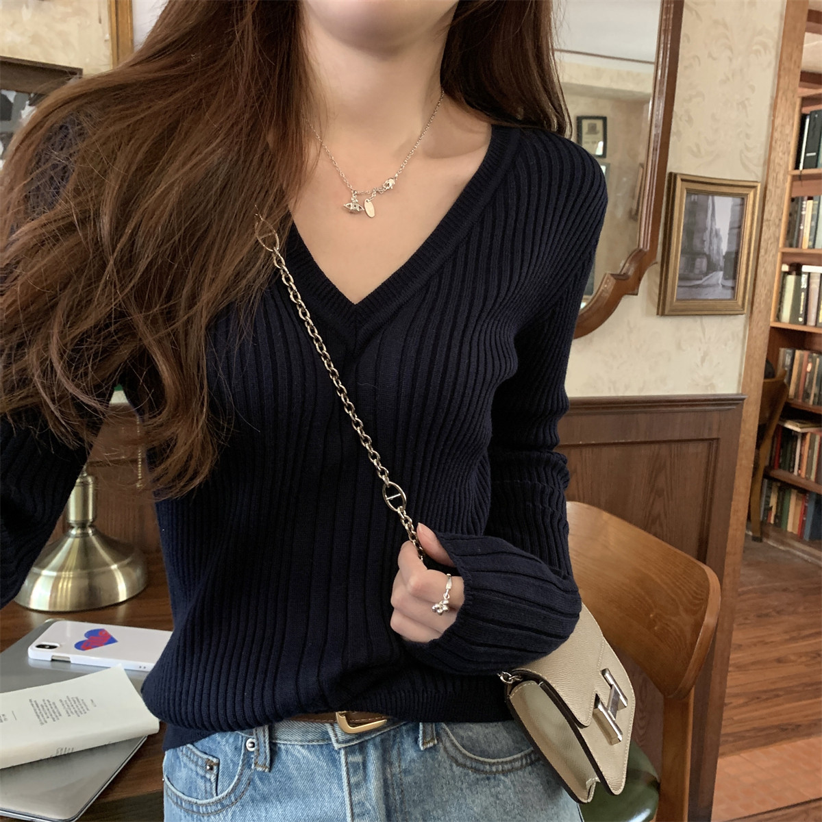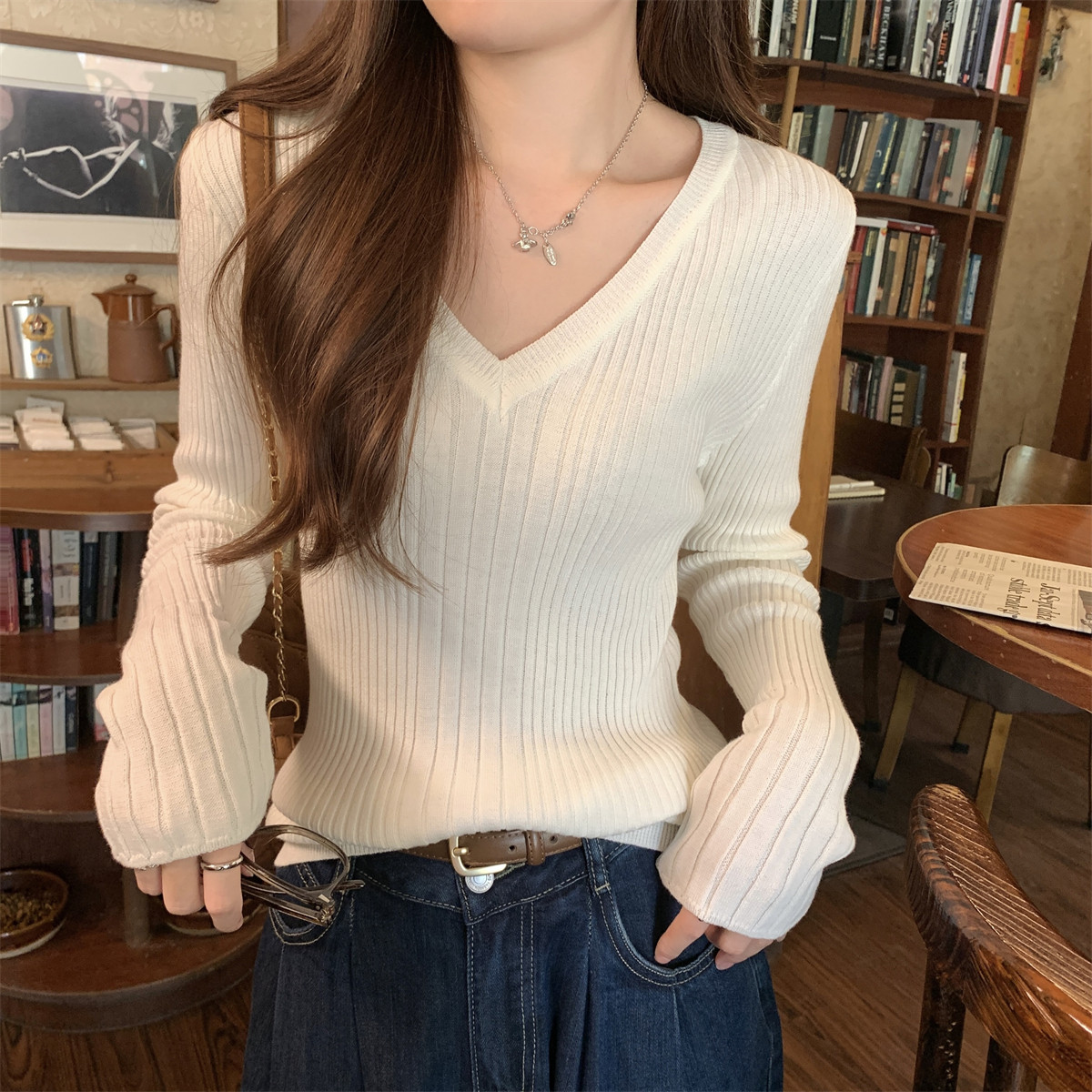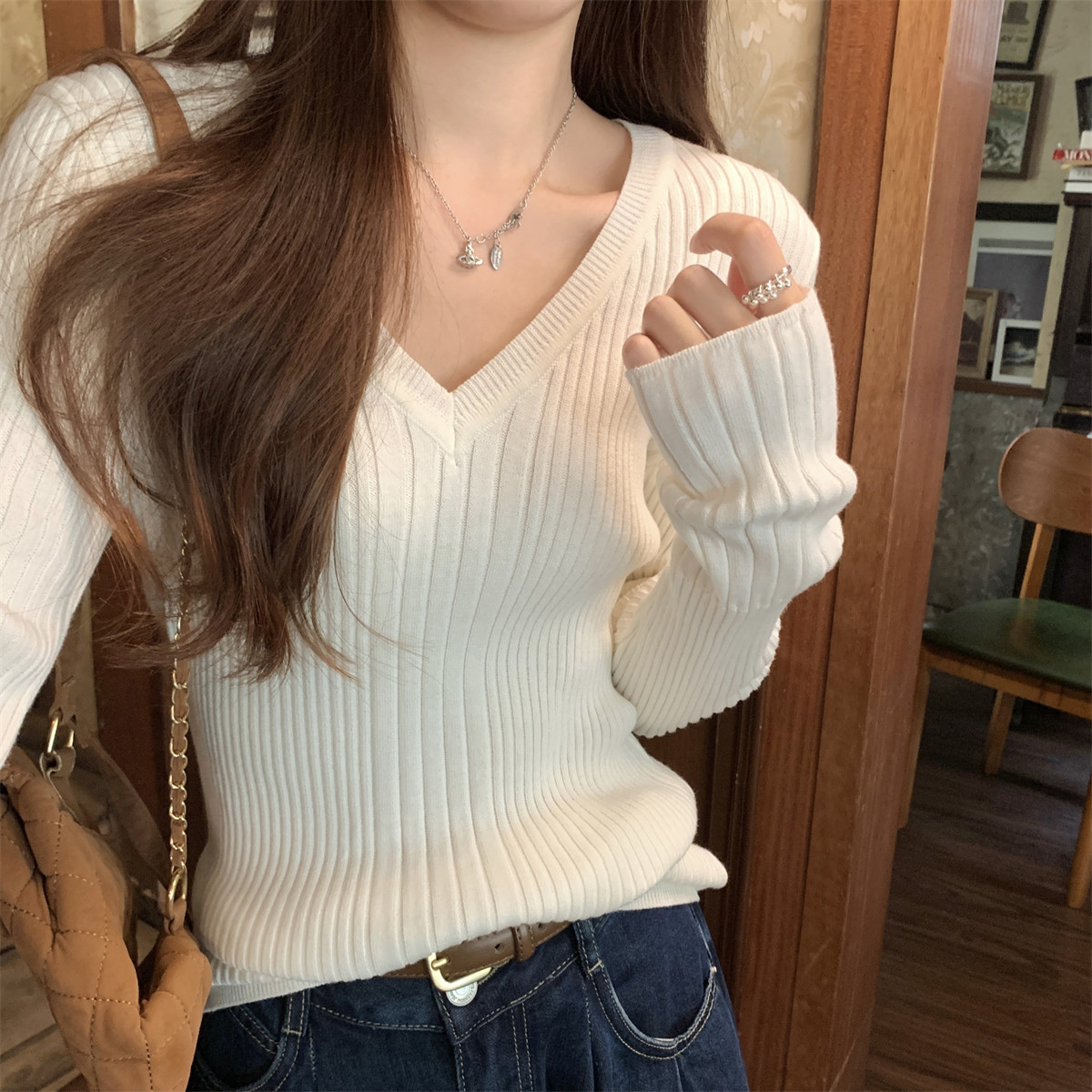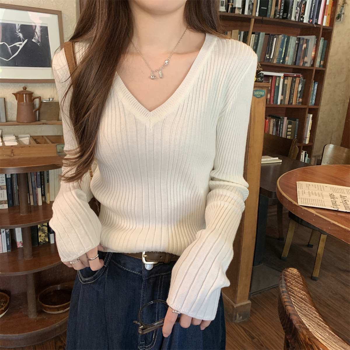 Korean Style Simple Solid Color Long-Sleeve T-Shirt Knitwear for Women 2026 Spring Versatile Elegant V-Neck Slim-Fit Base Shirt Top