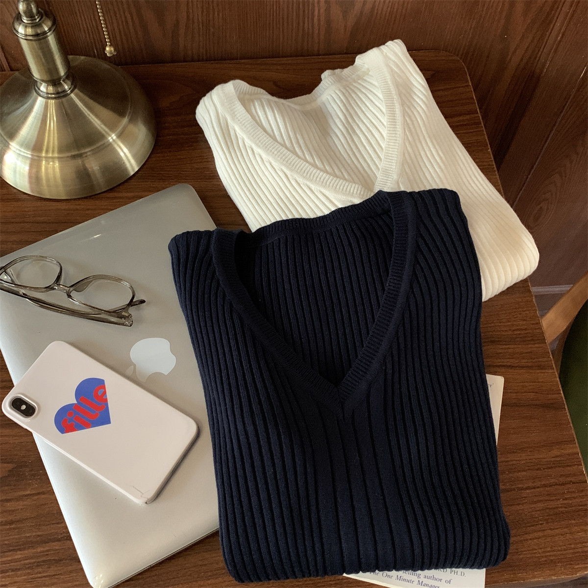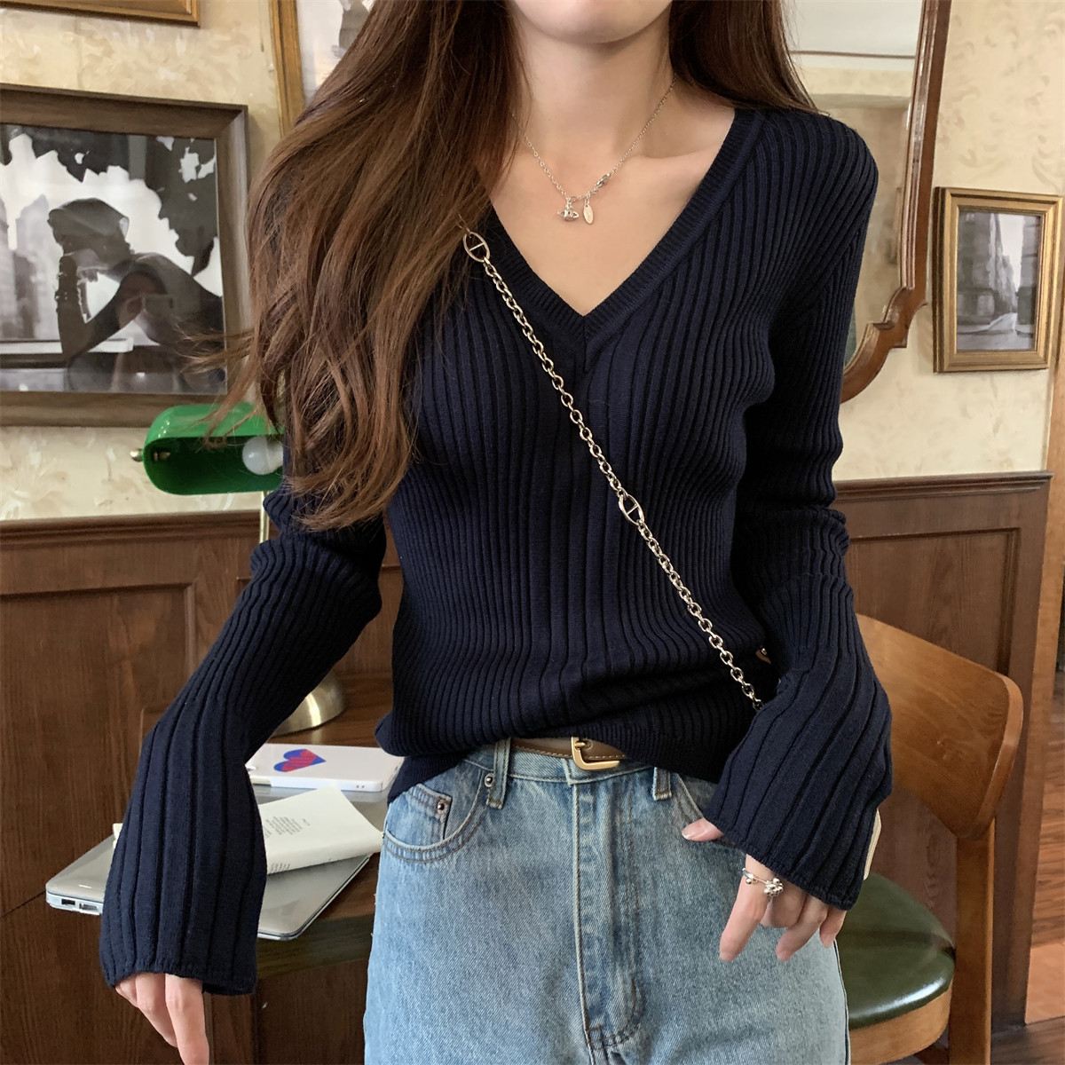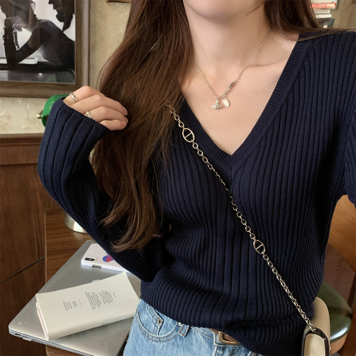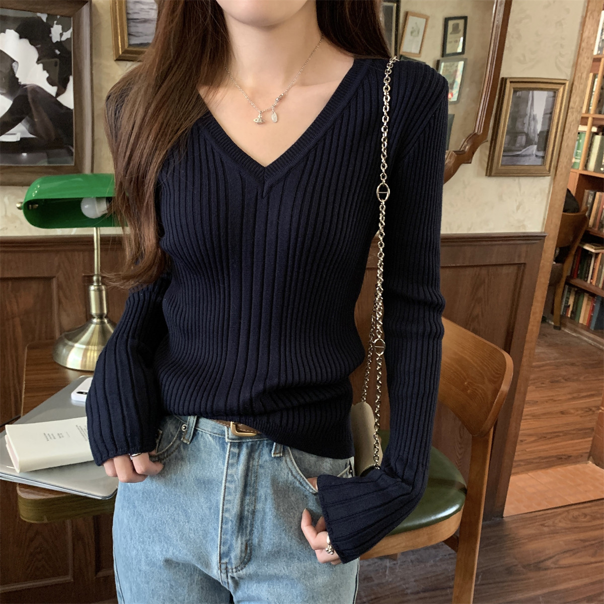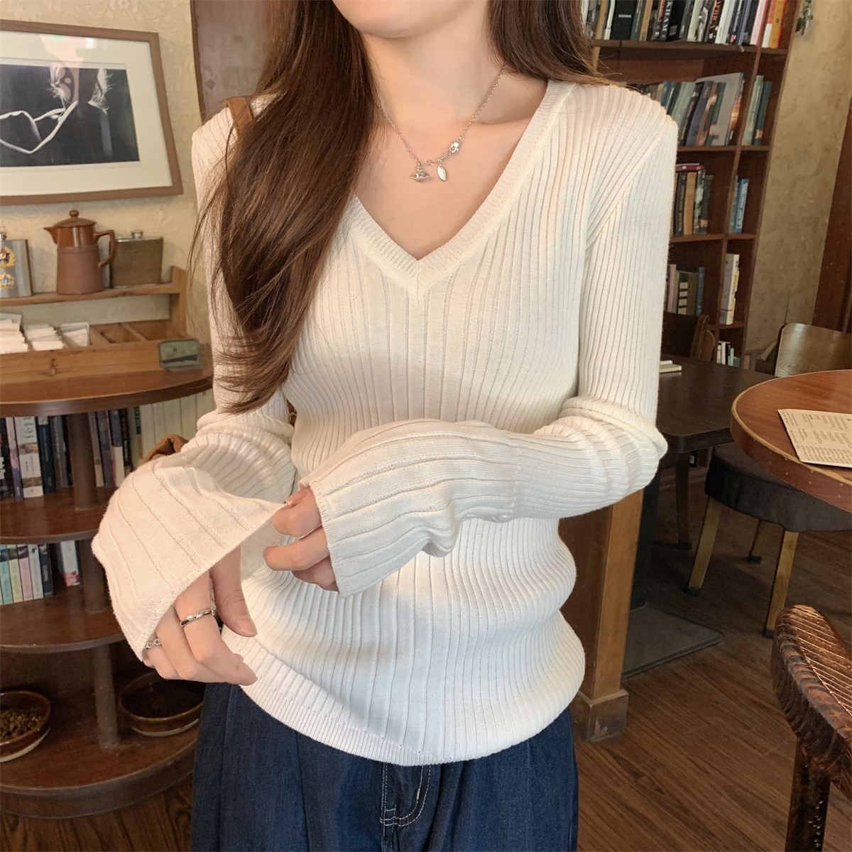 Korean Style Simple Solid Color Long-Sleeve T-Shirt Knitwear for Women 2026 Spring Versatile Elegant V-Neck Slim-Fit Base Shirt Top