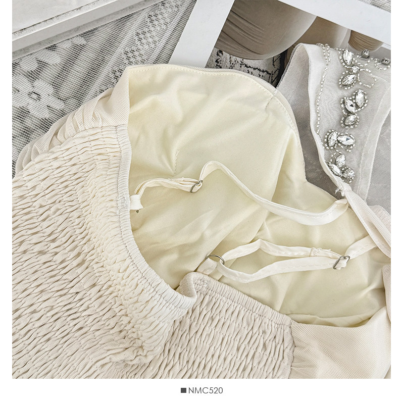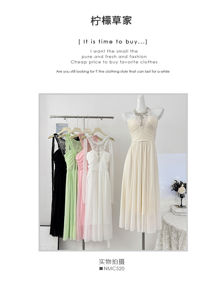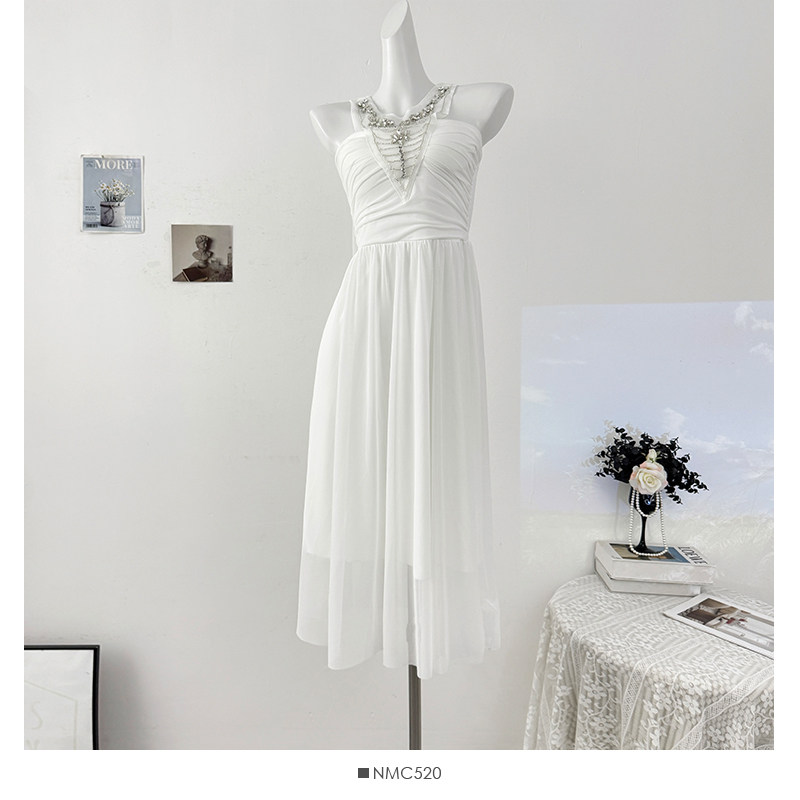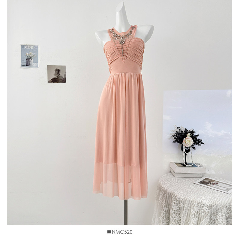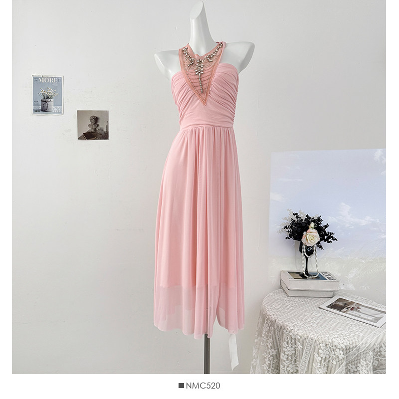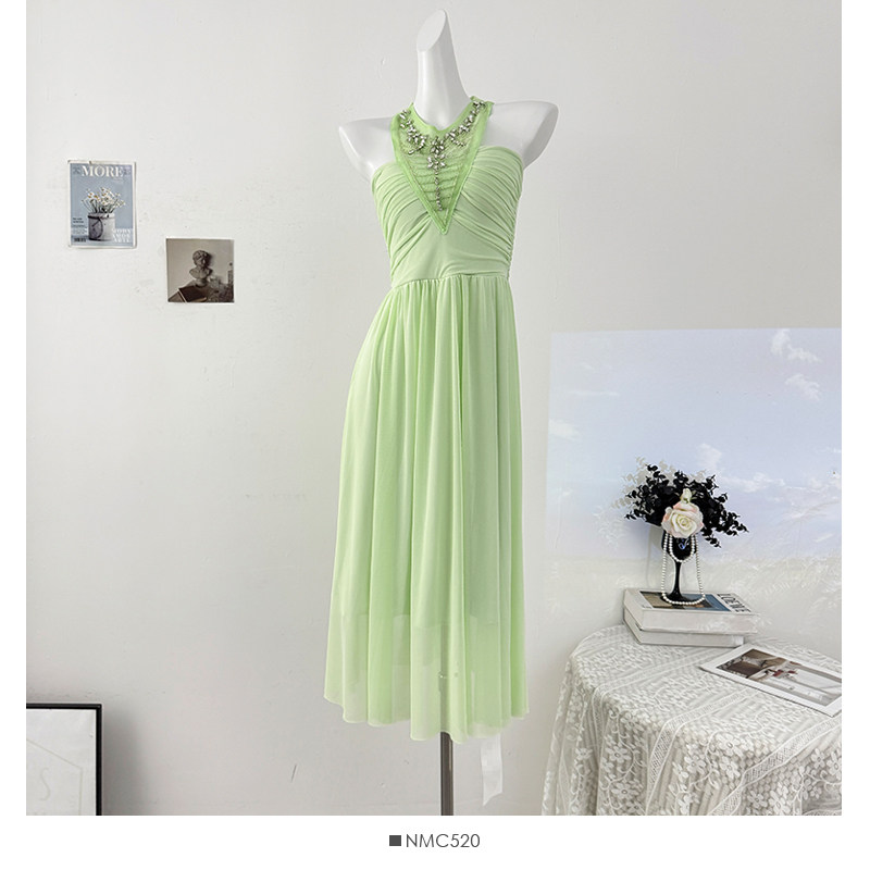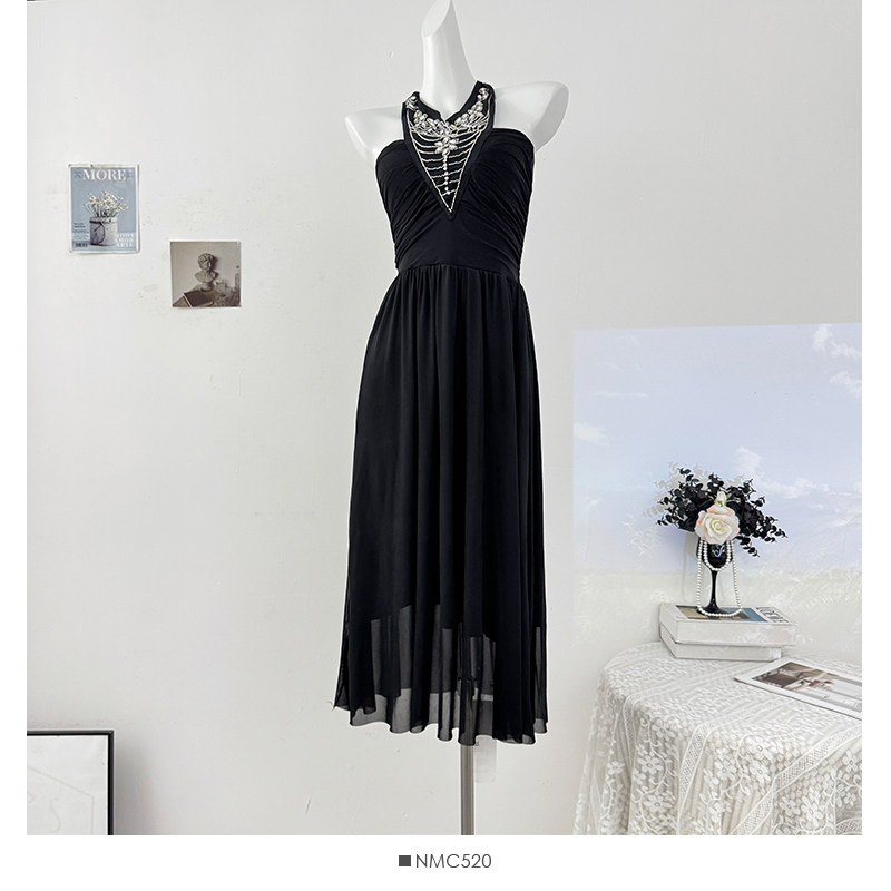 French heavy industry diamond-encrusted halterneck strappy dress for women autumn 2025 lady style sexy backless pleated skirt