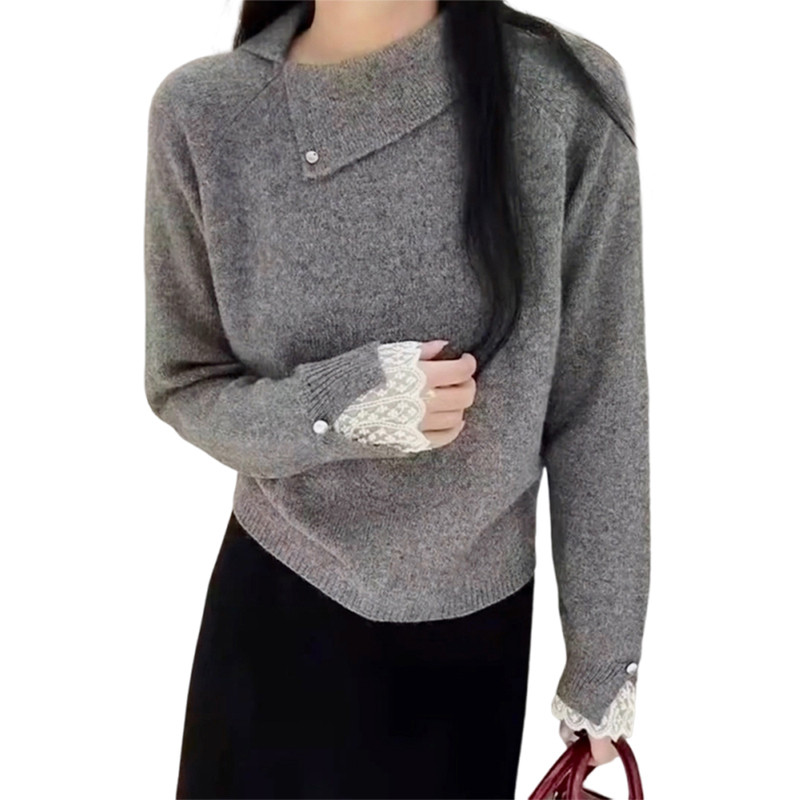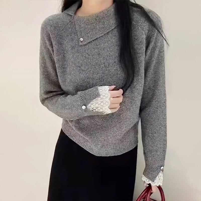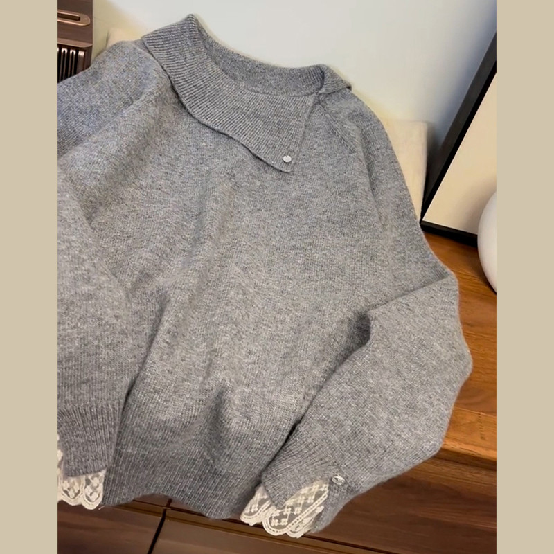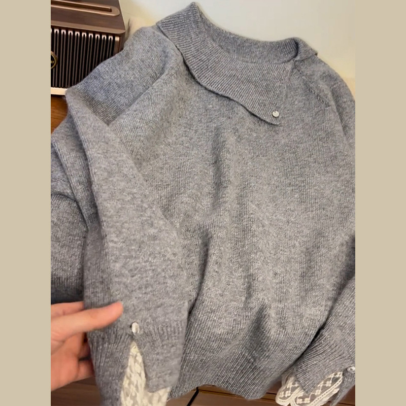 Gray Lapel Sweater for Women, Autumn and Winter, Korean Style, Lazy and High-End Feel, Thickened Lace Inner Layer, Knitted Top