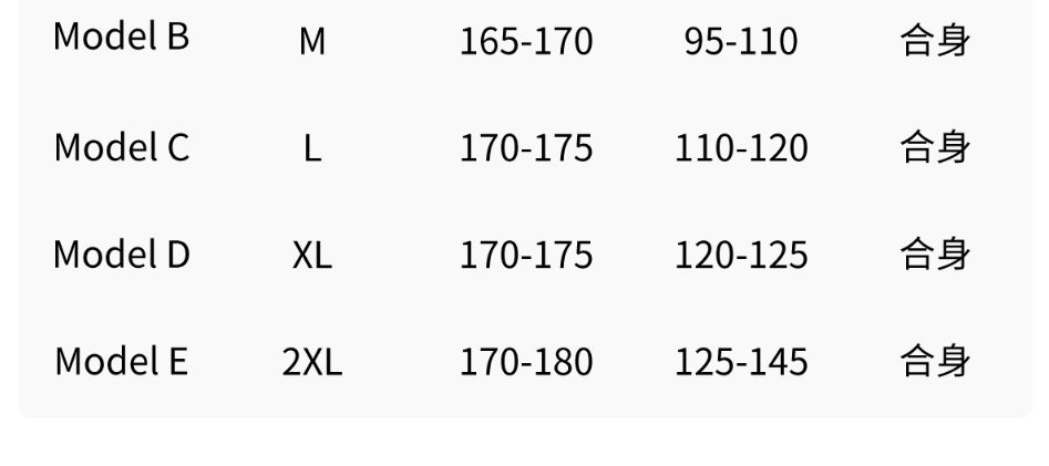 China (cm) 160-165/84-86 165-170 / 88-90 167-172 / 92-96 168-173 / 98-102 170-176 / 106-110