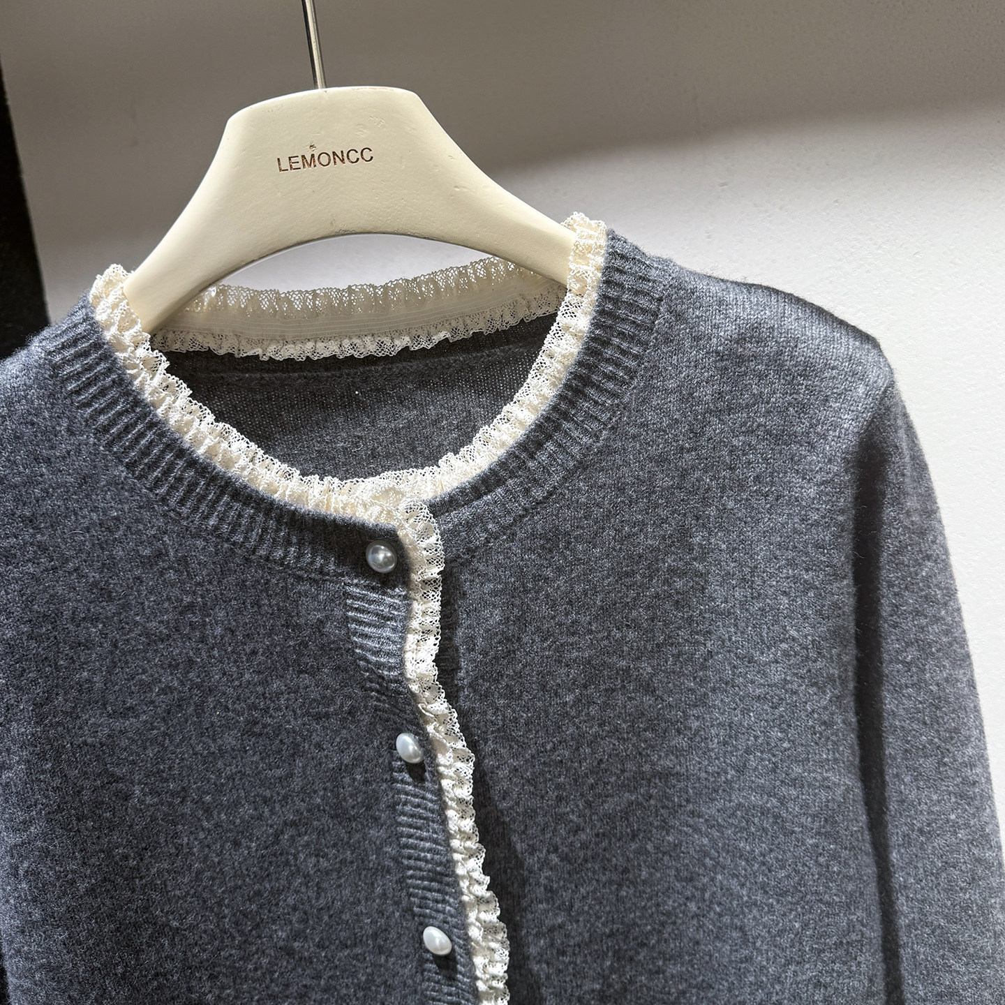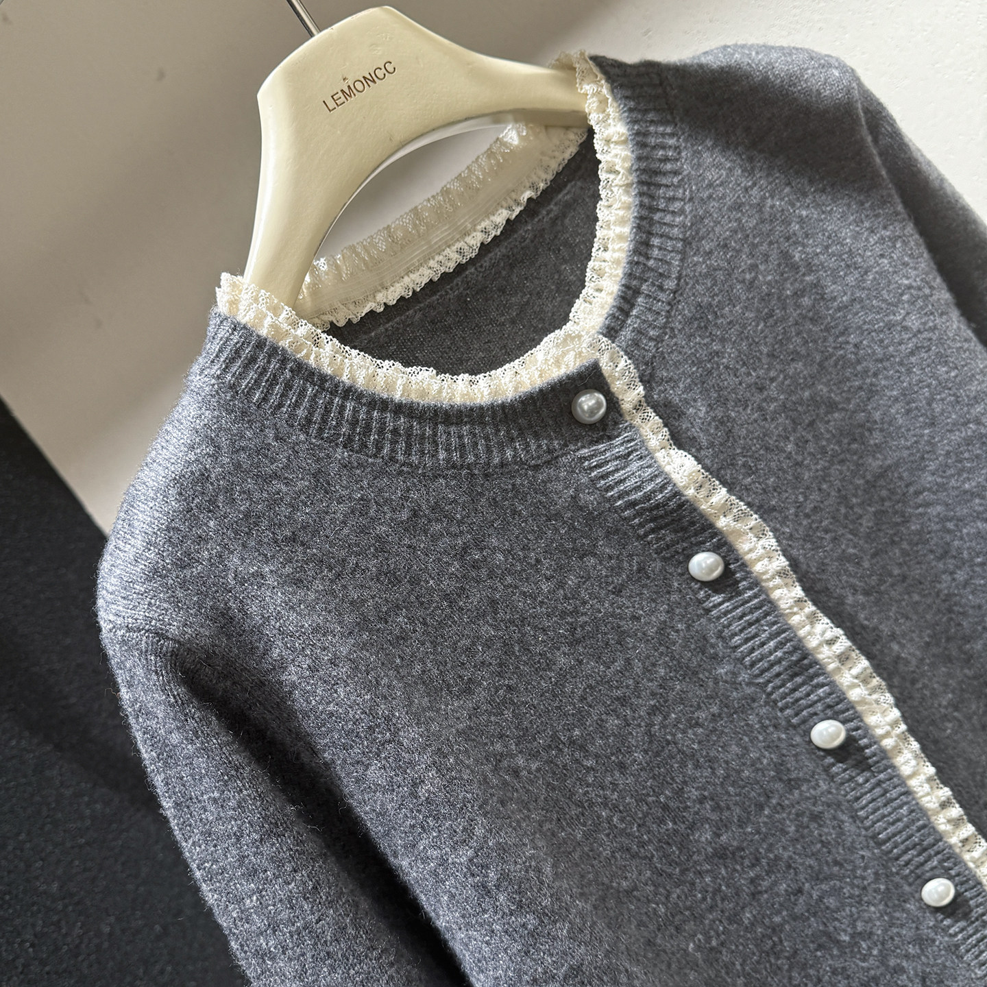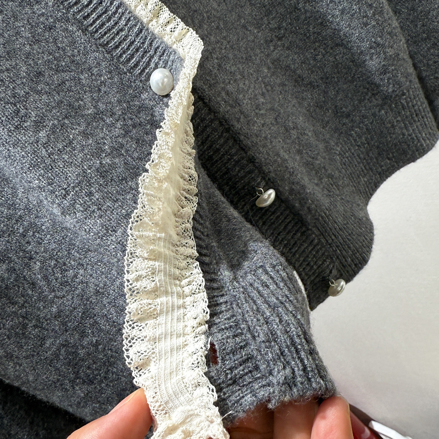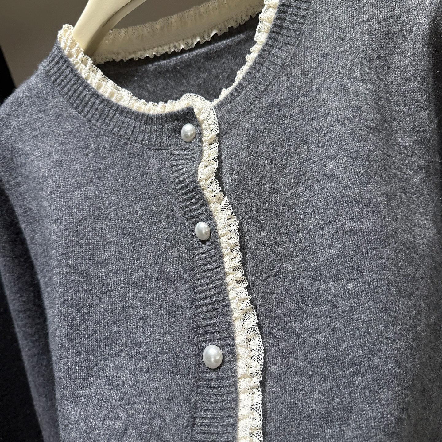 [Special Clearance] Lace-Trimmed Pearl Button 100% Wool Round-Neck Knitted Cardigan Sweater Jacket for Women