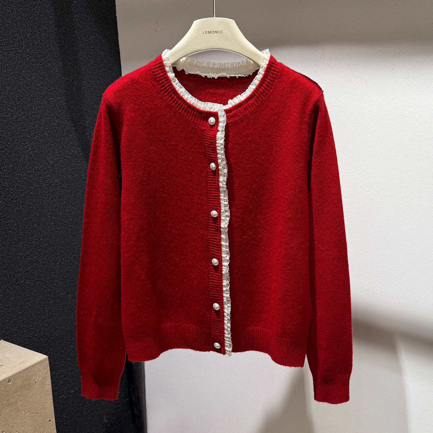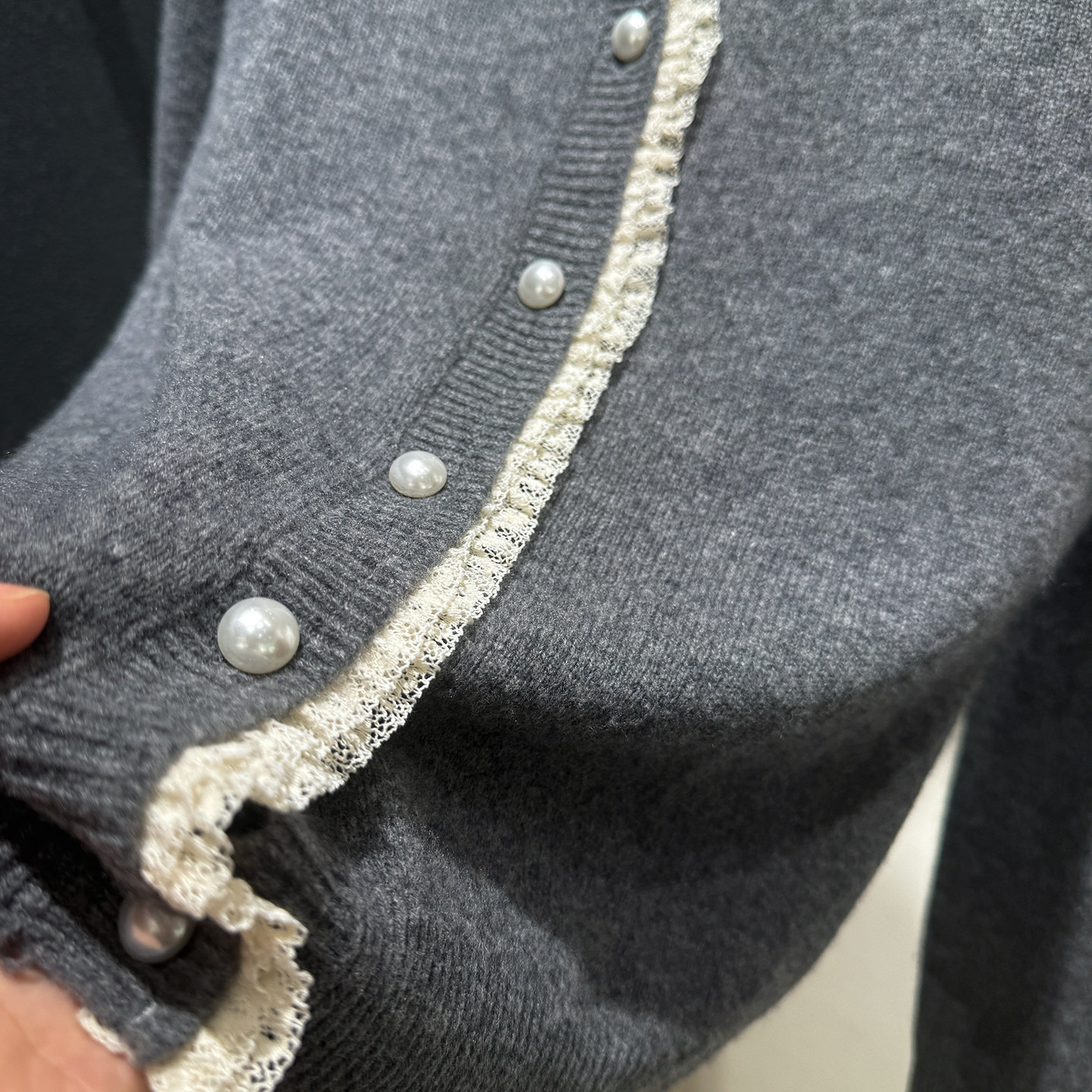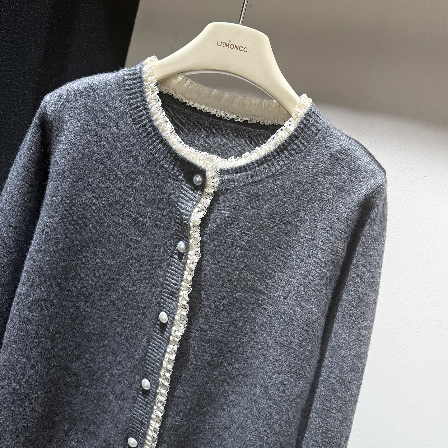 [Special Clearance] Lace-Trimmed Pearl Button 100% Wool Round-Neck Knitted Cardigan Sweater Jacket for Women