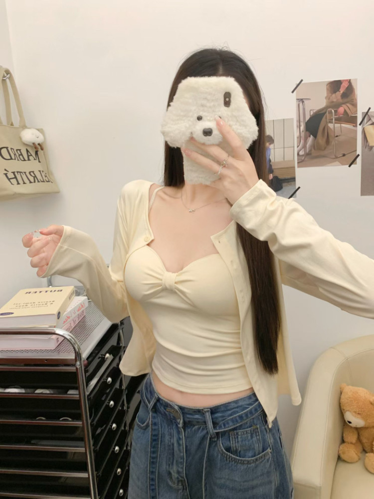 Self-Contained Padded Twist Camisole Long-Sleeve Cardigan for Women, 2025 Autumn New Style, Sexy and Pure Desire Style Two-Piece Set