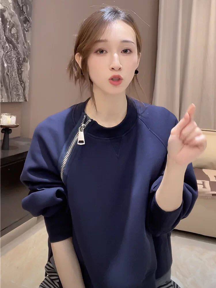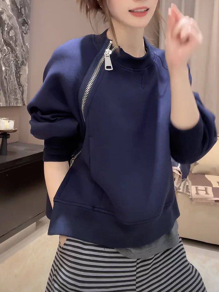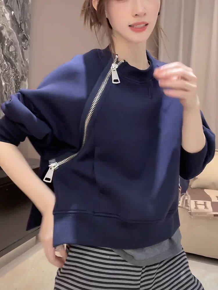European-Style Autumn and Winter Plus-Size Women's Clothing 2025 New Design Diagonal Zipper Fashion Blue Top Versatile Niche Jacket
