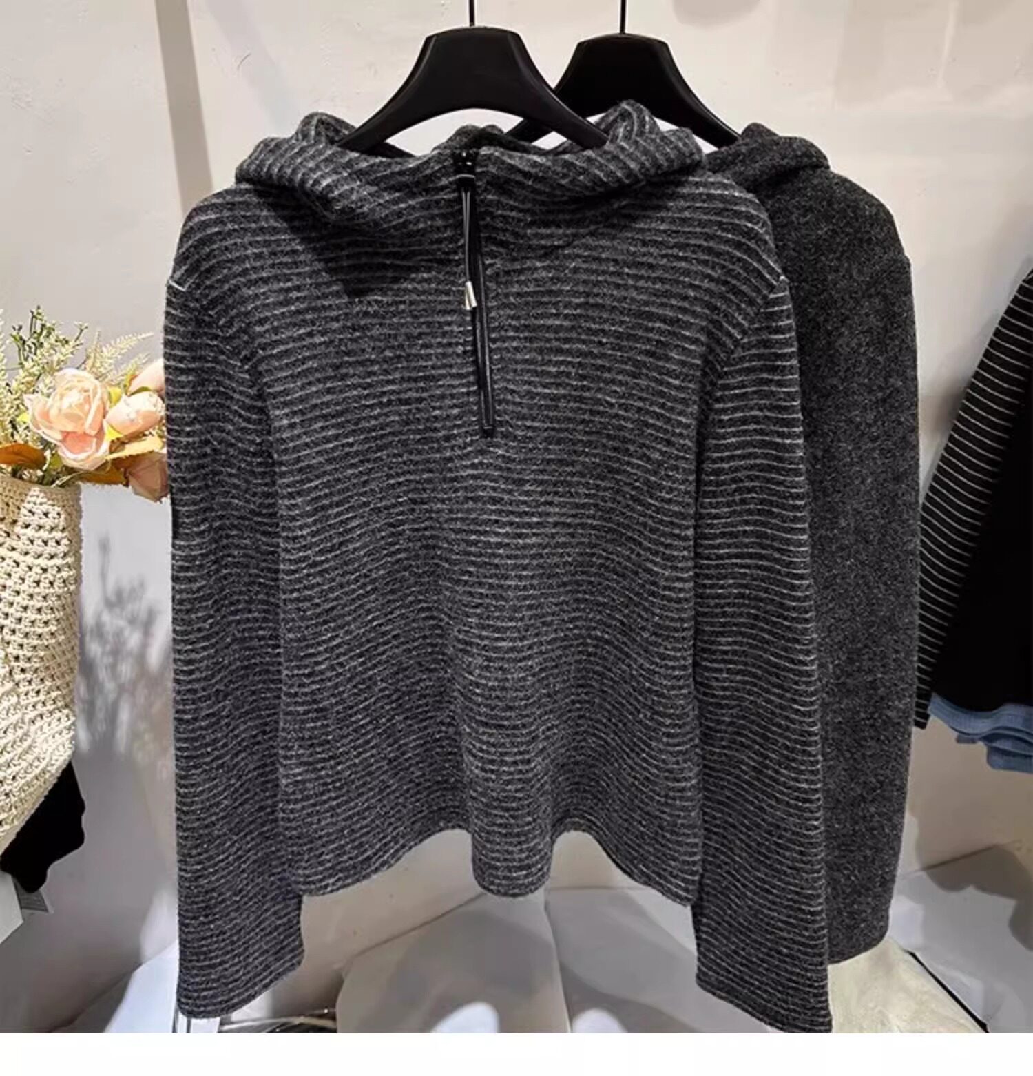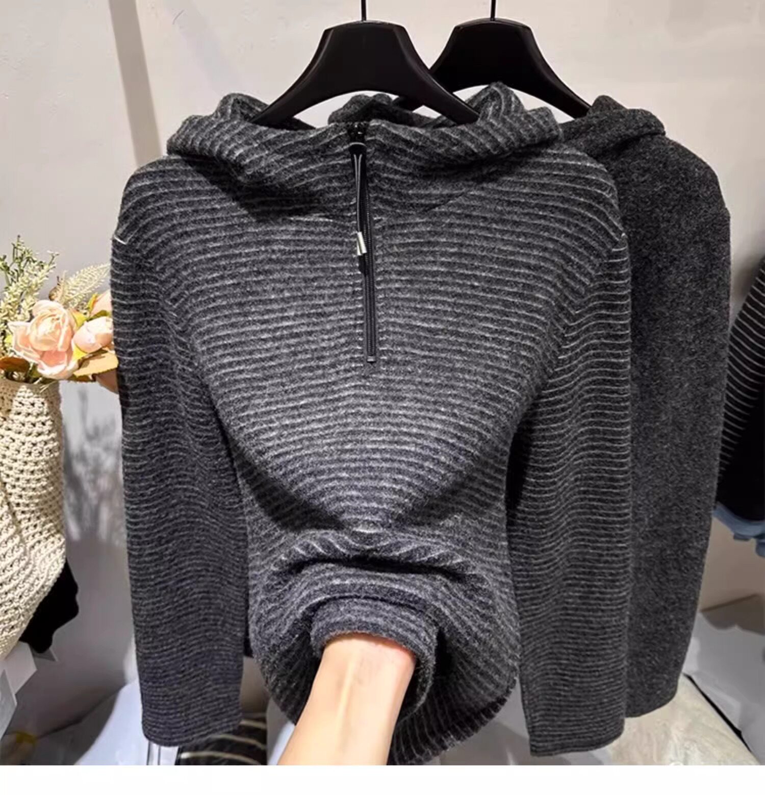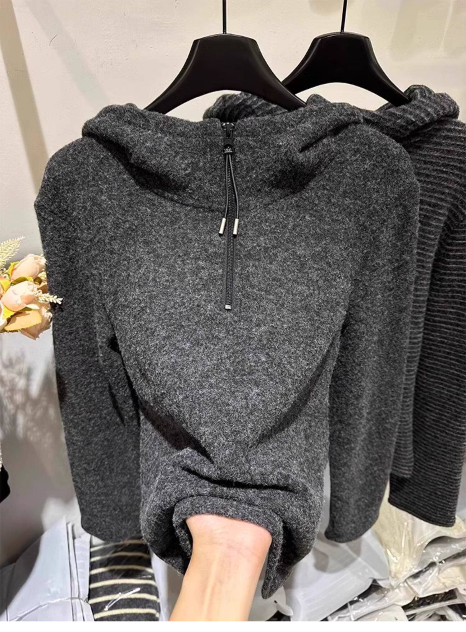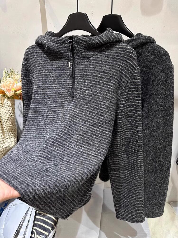 Gray striped hooded zippered brushed long-sleeved T-shirt for women in autumn and winter, high-quality inner layering, lazy sweatshirt top