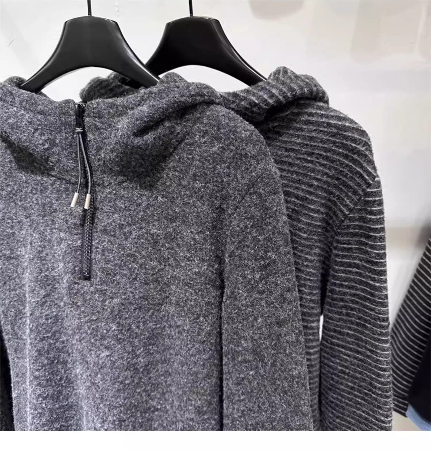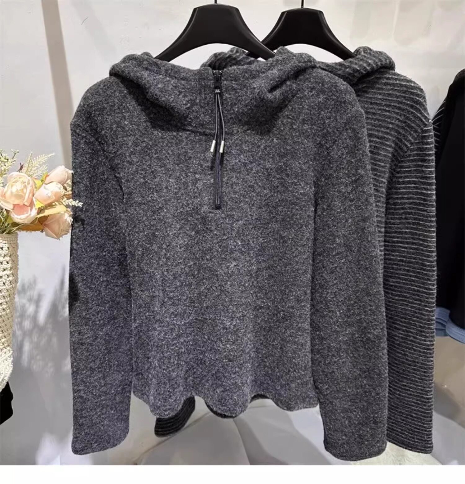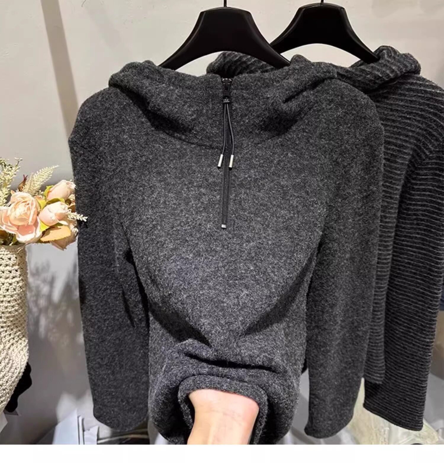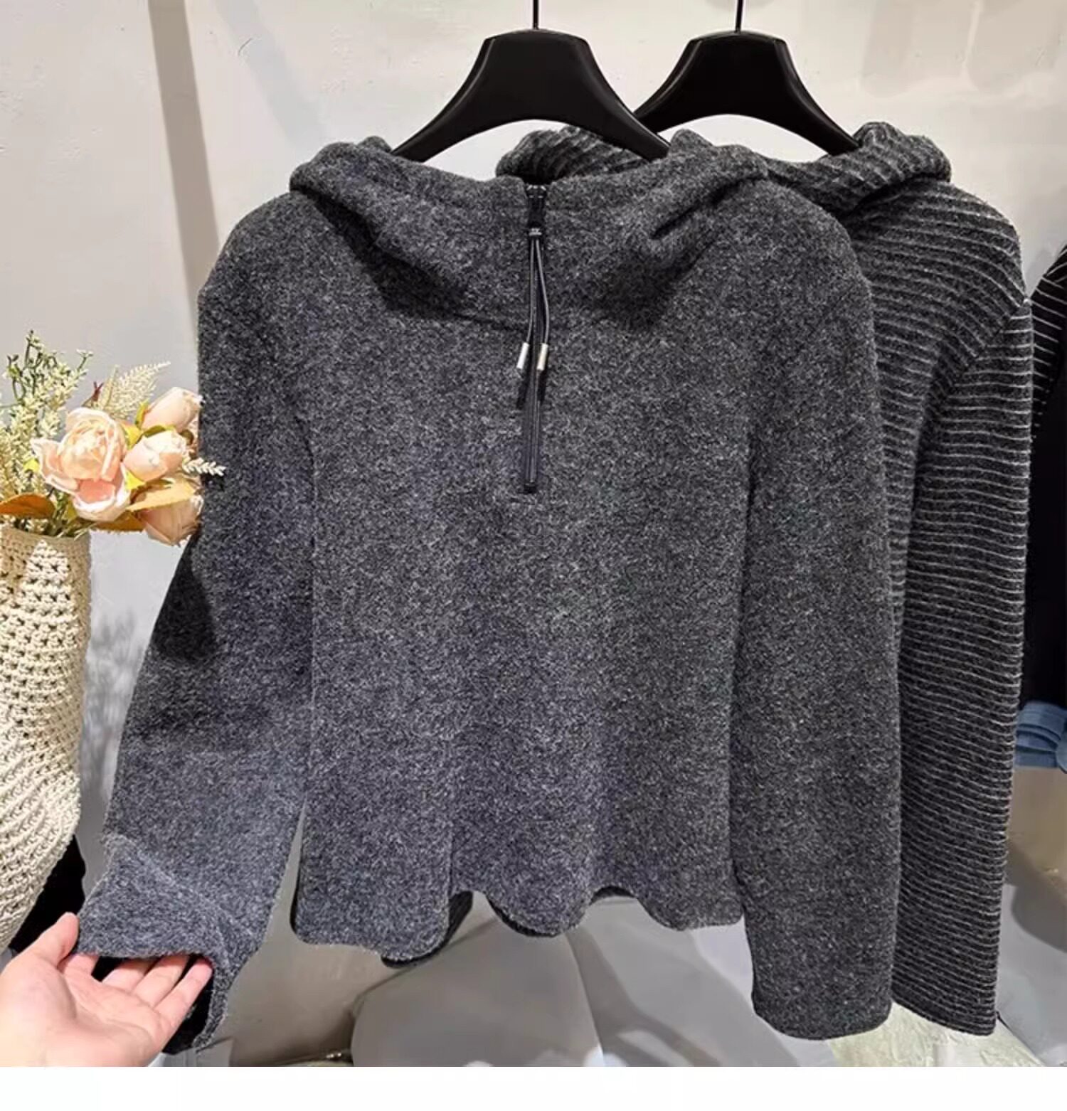 Gray striped hooded zippered brushed long-sleeved T-shirt for women in autumn and winter, high-quality inner layering, lazy sweatshirt top
