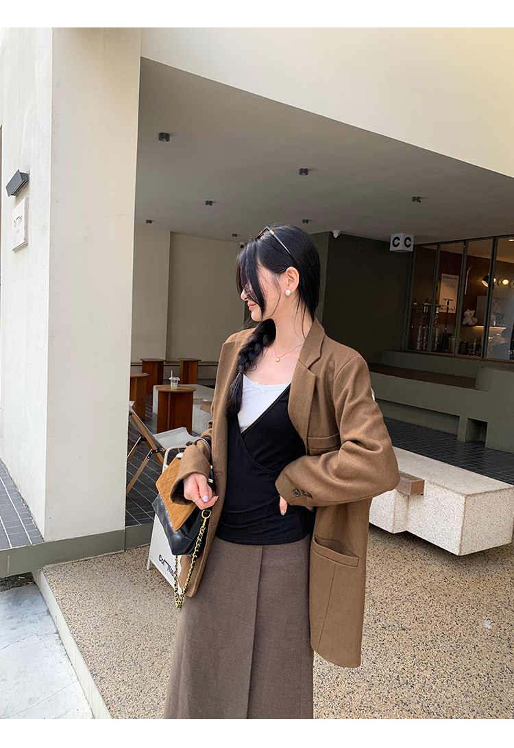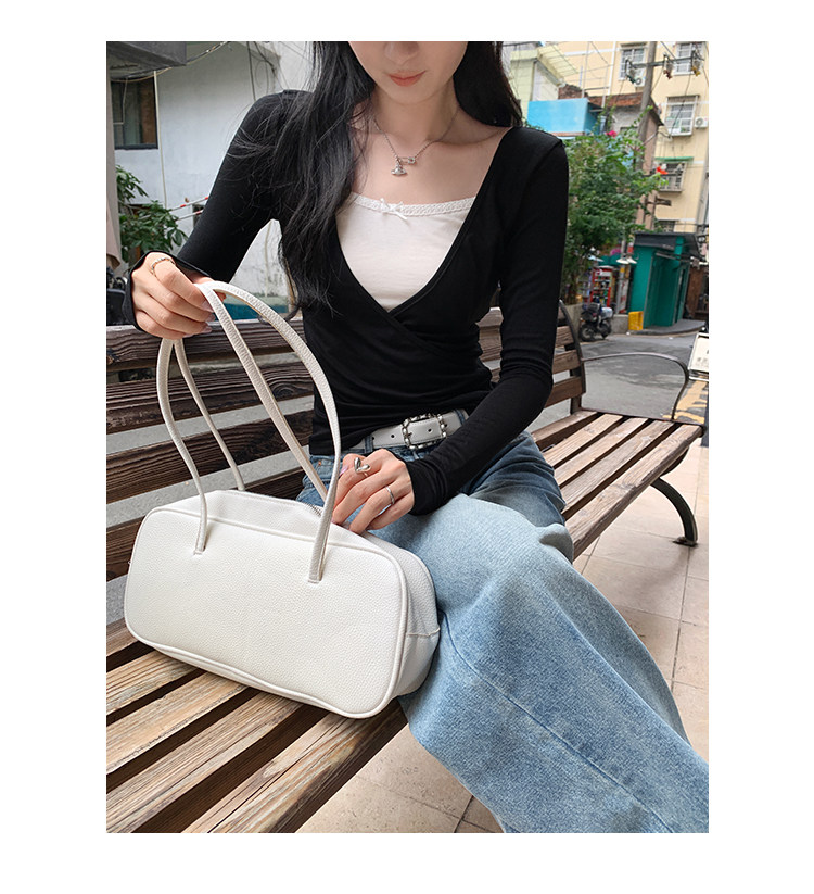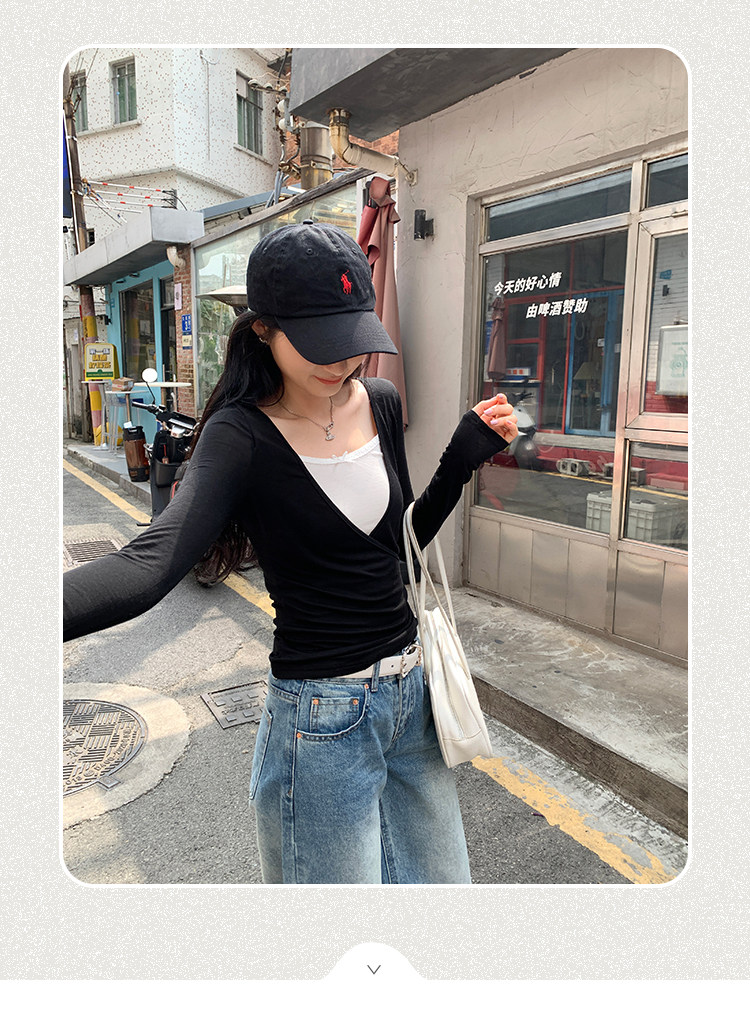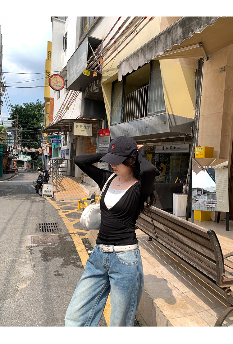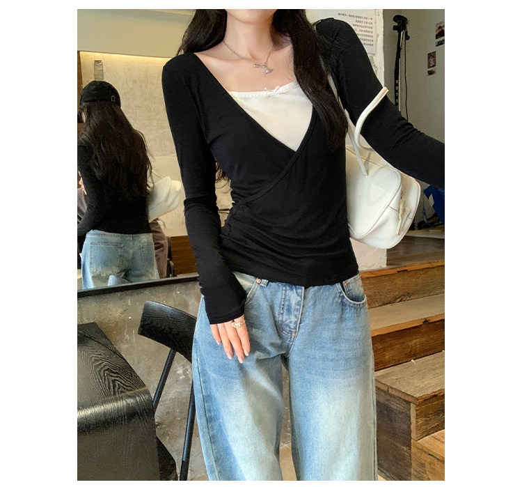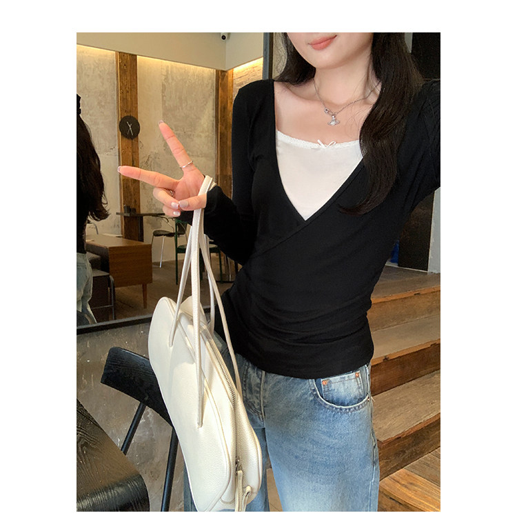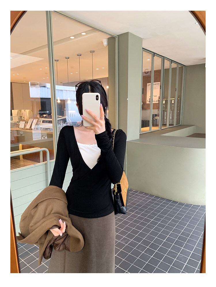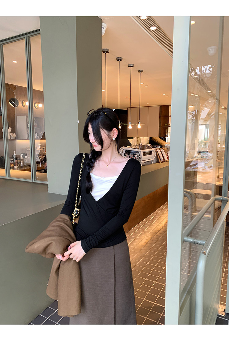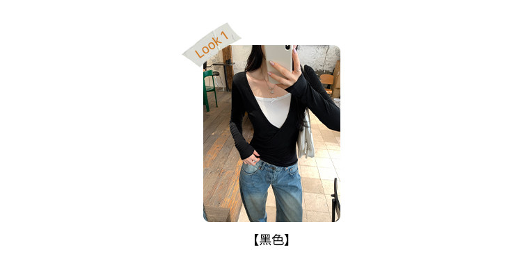 Black Square-Neck Faux Two-Piece Tencel T-Shirt for Women, Autumn and Winter Style, Slim-Fit, Color-Blocking, Long-Sleeve Base Layer Top