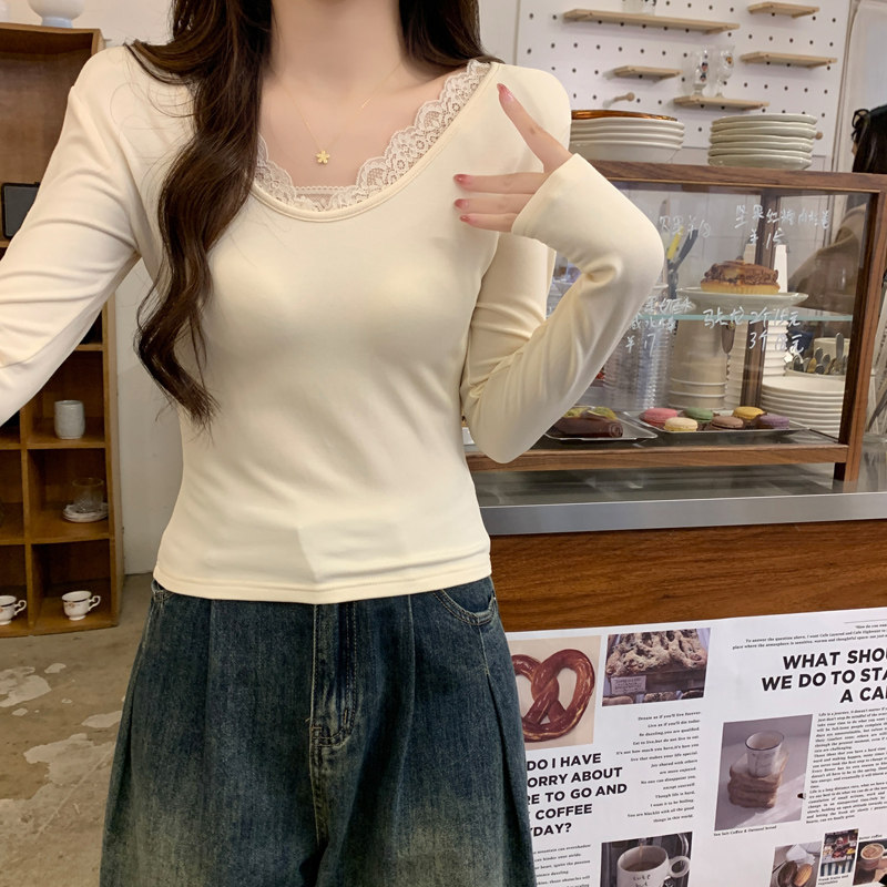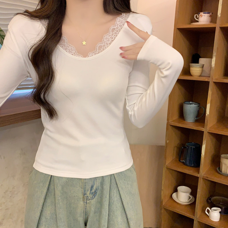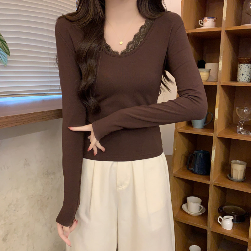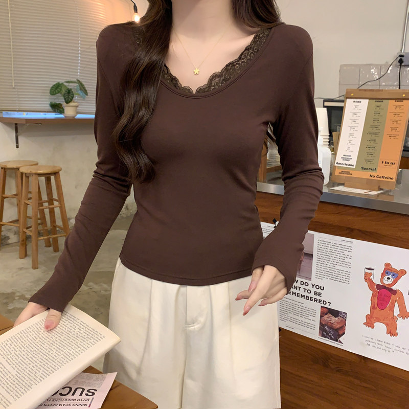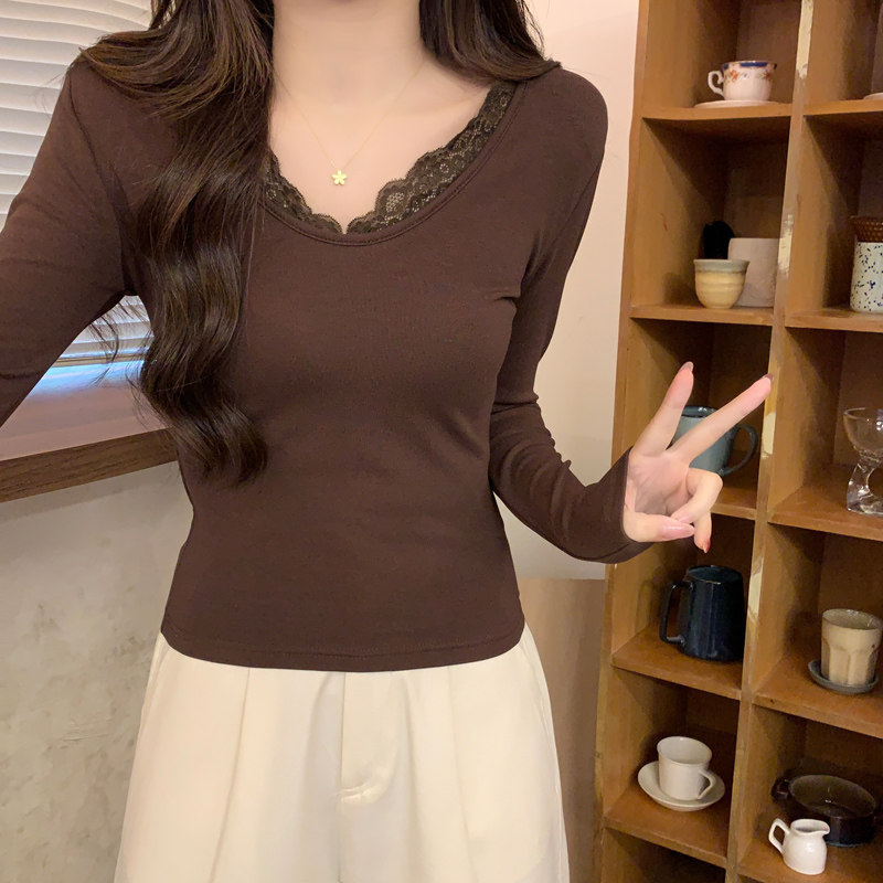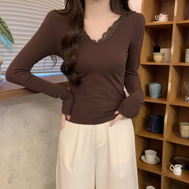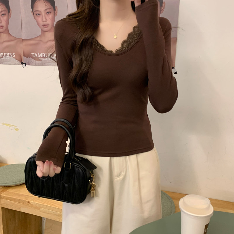 Lace Splicing V-Neck Fleece-Lined Melard Mocha Color Bottoming Shirt for Women, New Autumn and Winter Slim-Fitting Sexy Long-Sleeved T-Shirt for Women