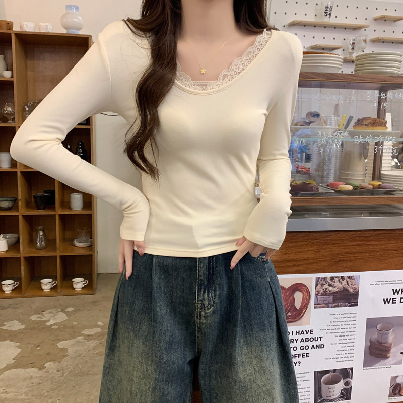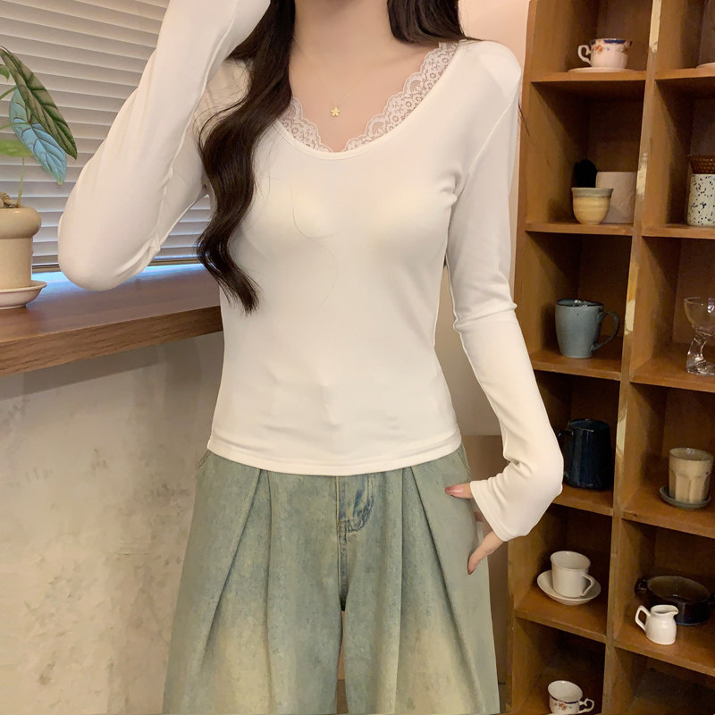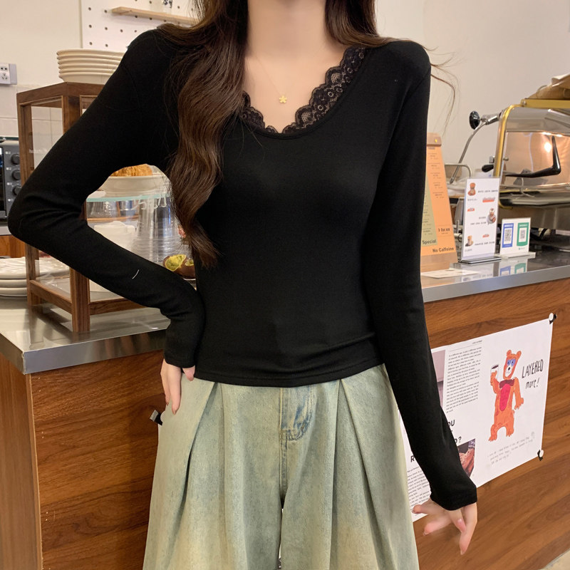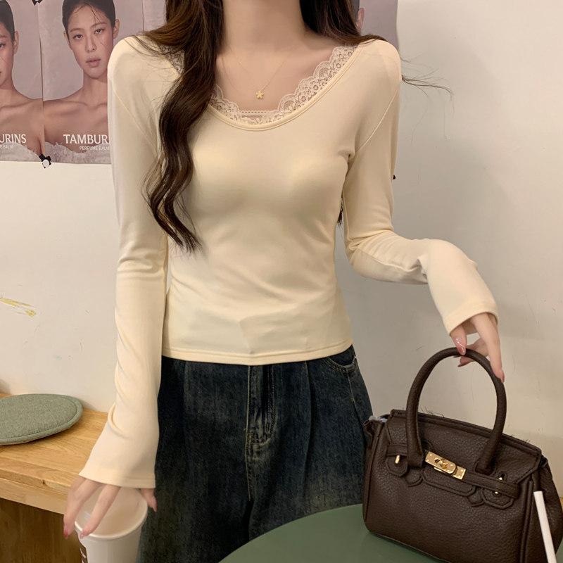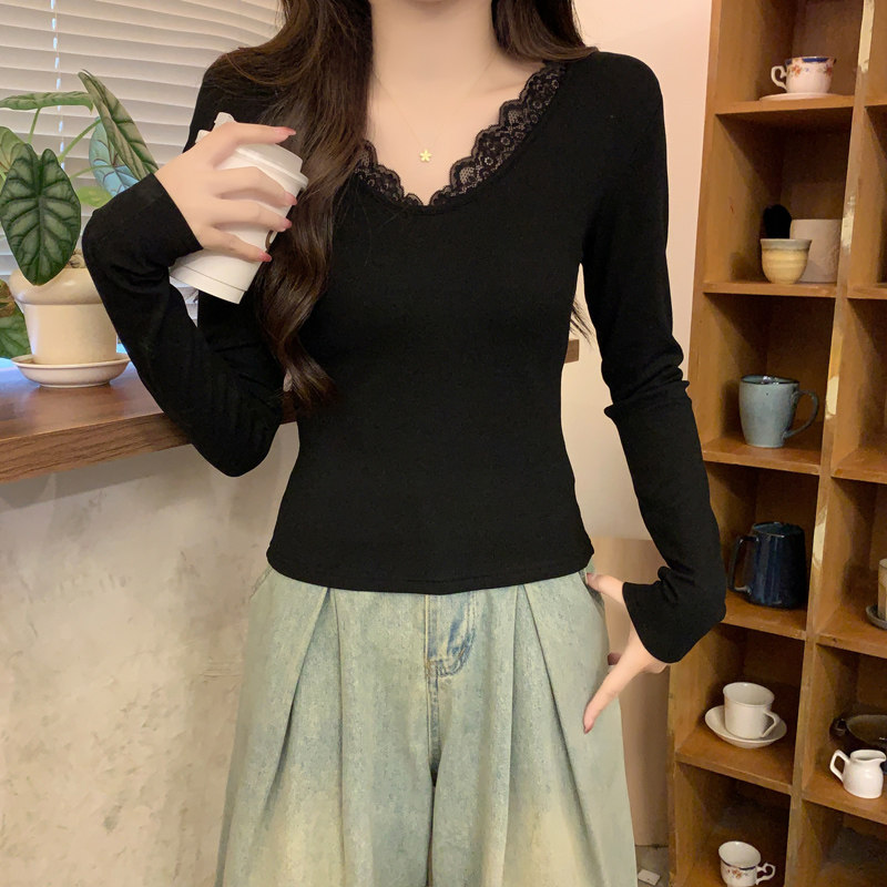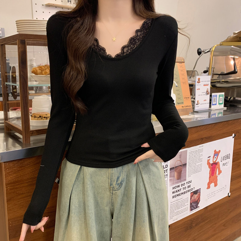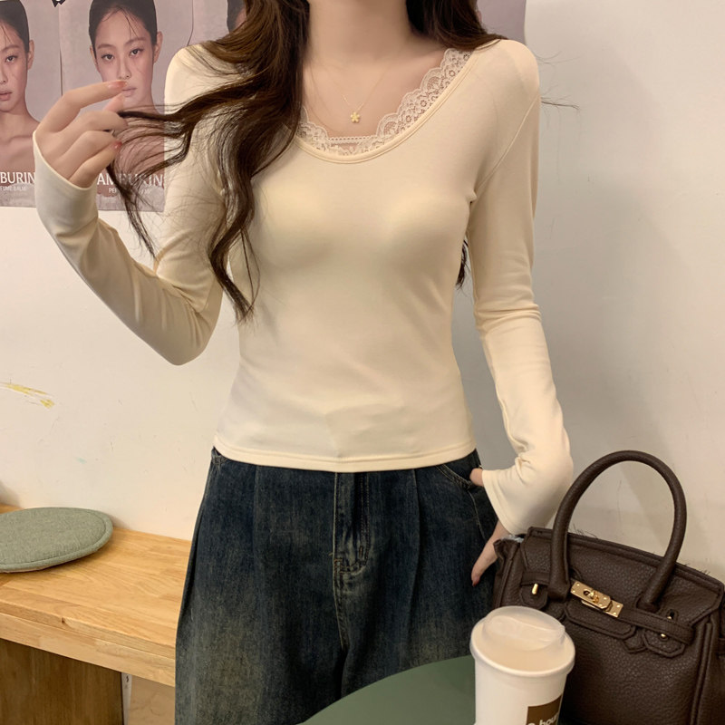 Lace Splicing V-Neck Fleece-Lined Melard Mocha Color Bottoming Shirt for Women, New Autumn and Winter Slim-Fitting Sexy Long-Sleeved T-Shirt for Women