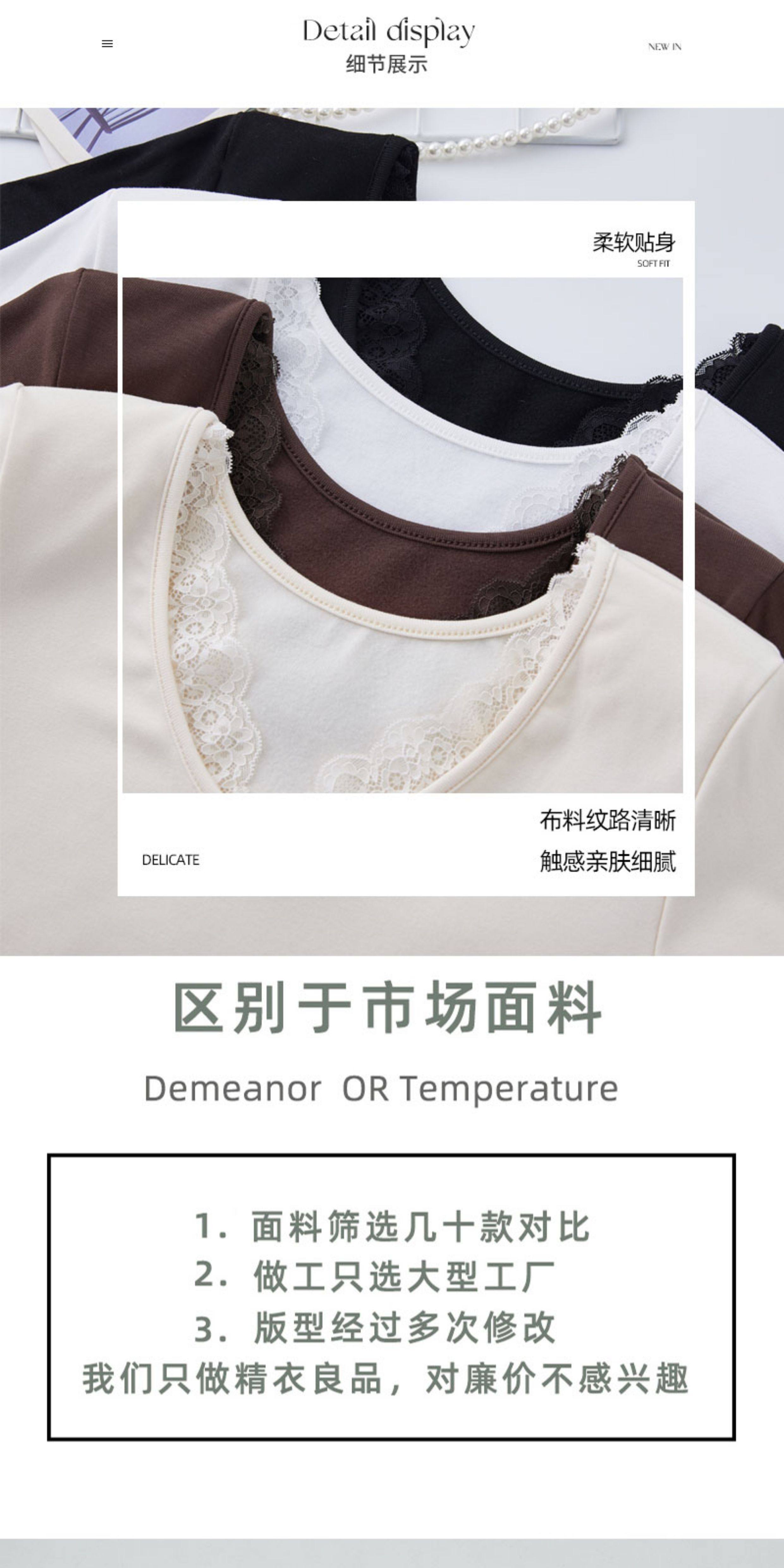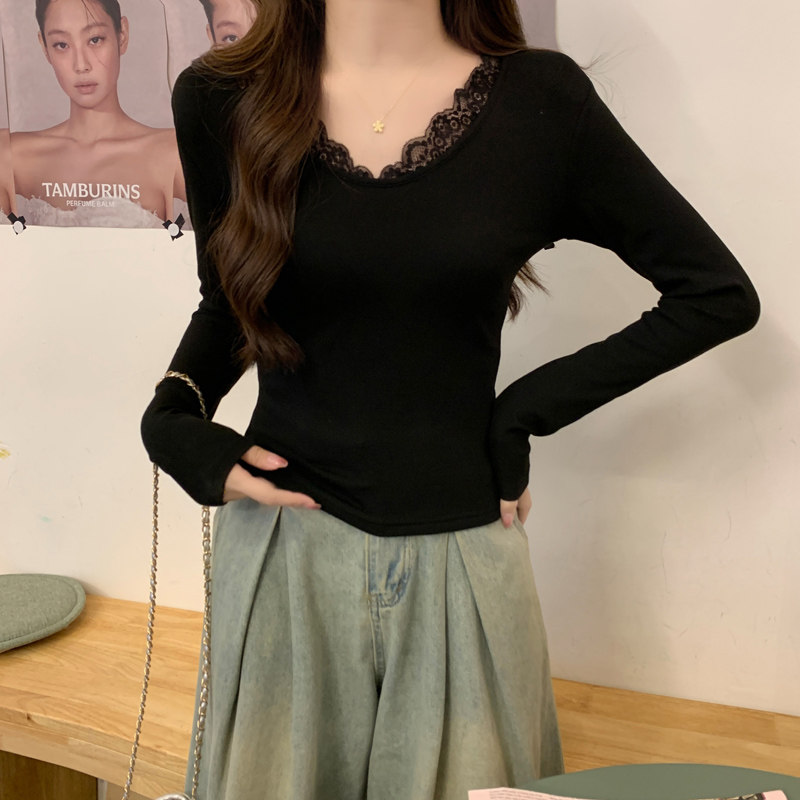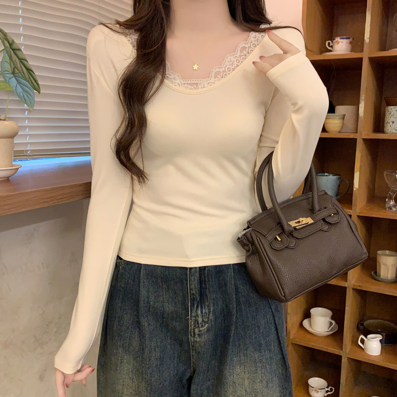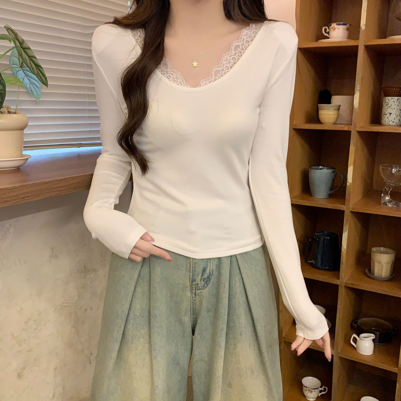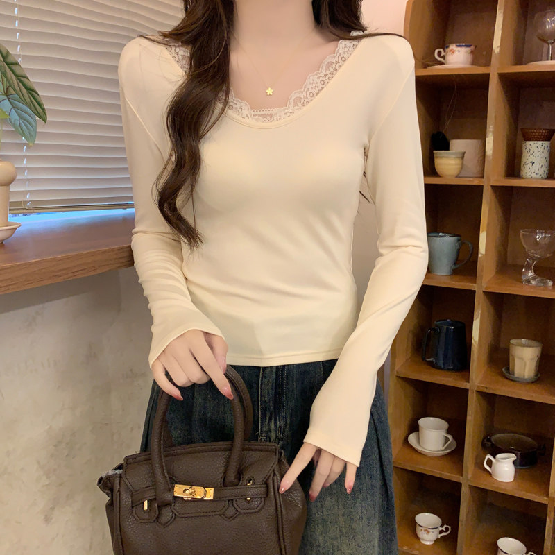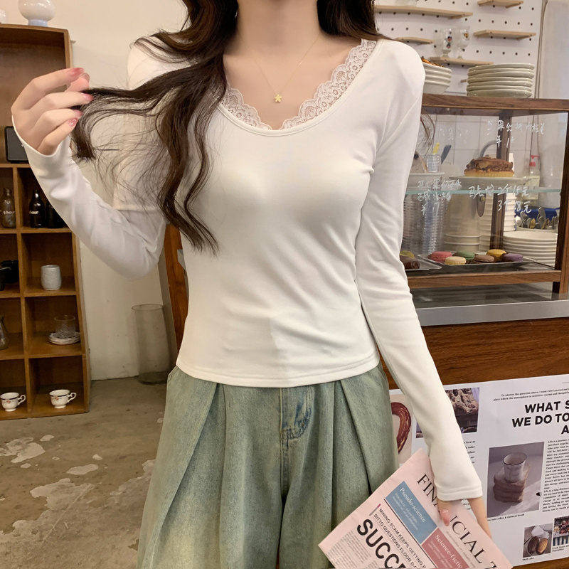 Lace Splicing V-Neck Fleece-Lined Melard Mocha Color Bottoming Shirt for Women, New Autumn and Winter Slim-Fitting Sexy Long-Sleeved T-Shirt for Women